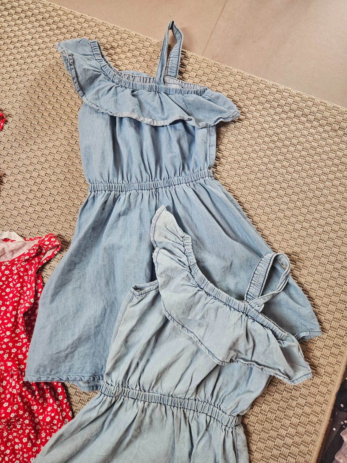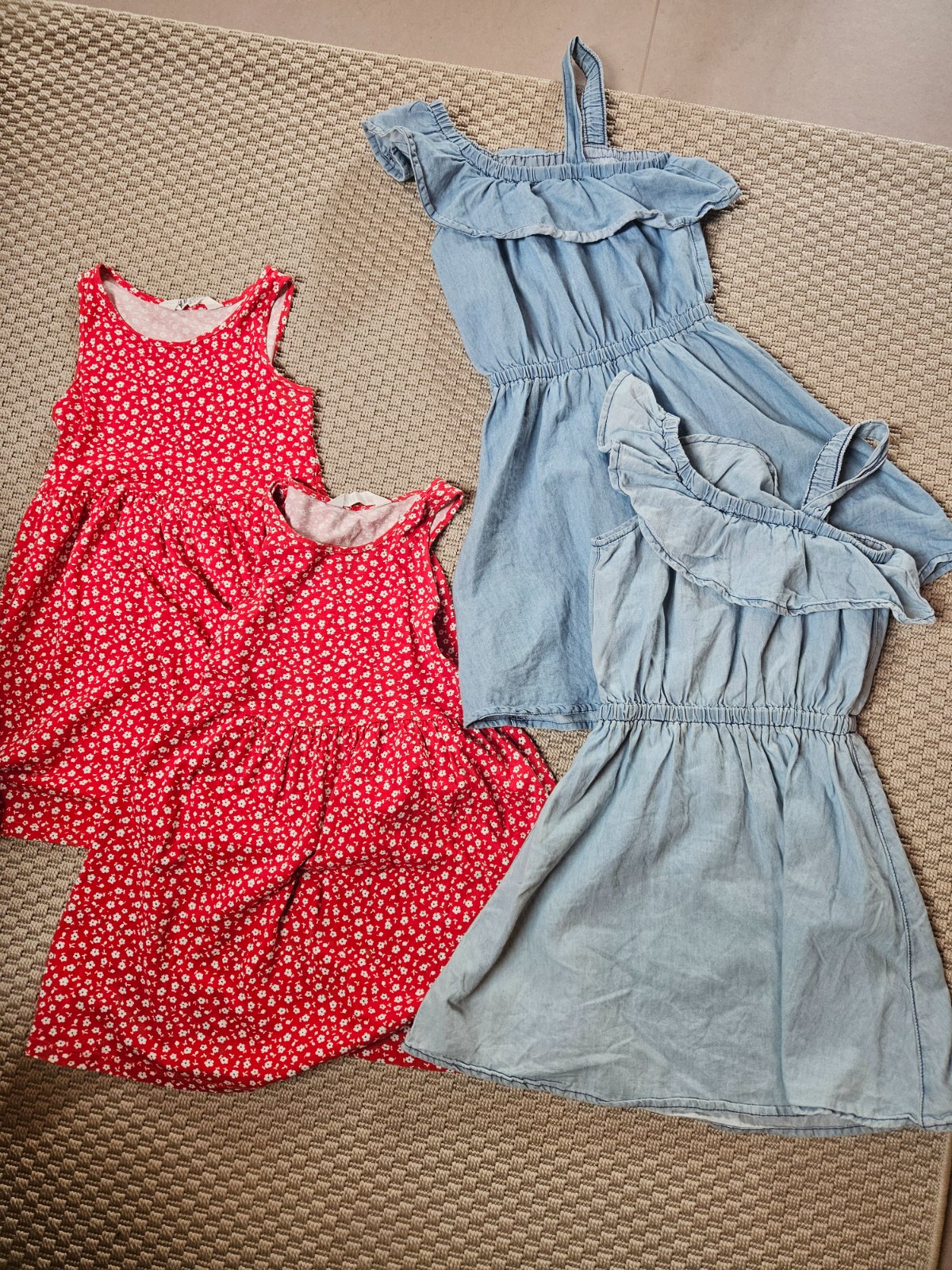 Letne saty pre dvojiky znacky H&M a Destination. Cervene velkost 128, bledomodre velkost 134.