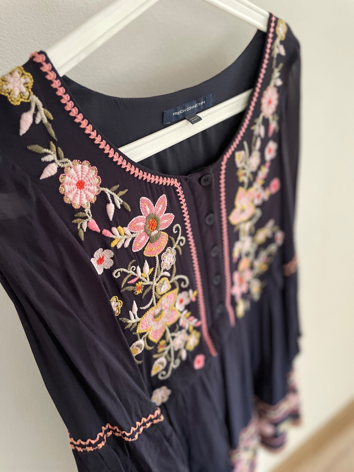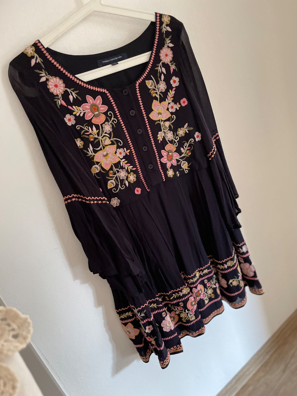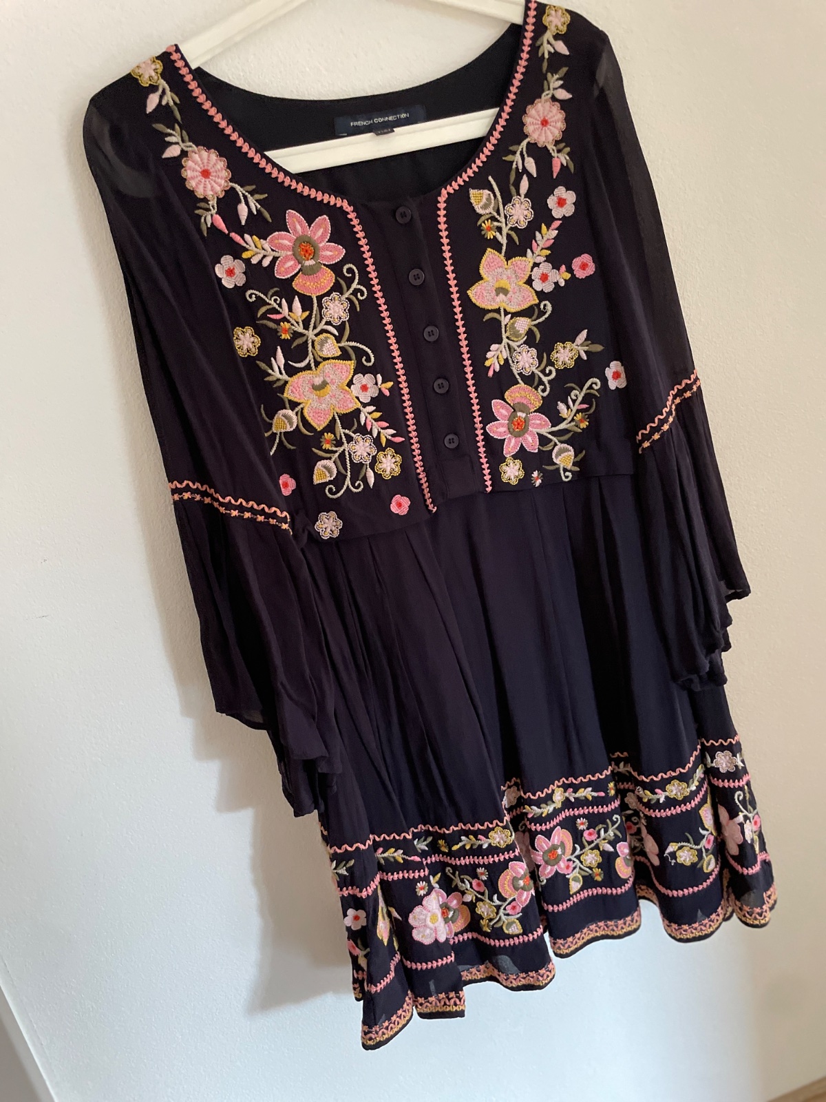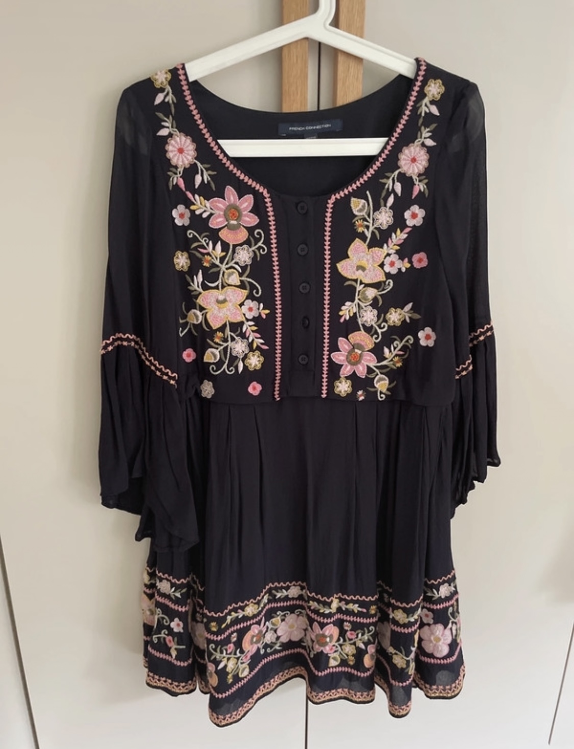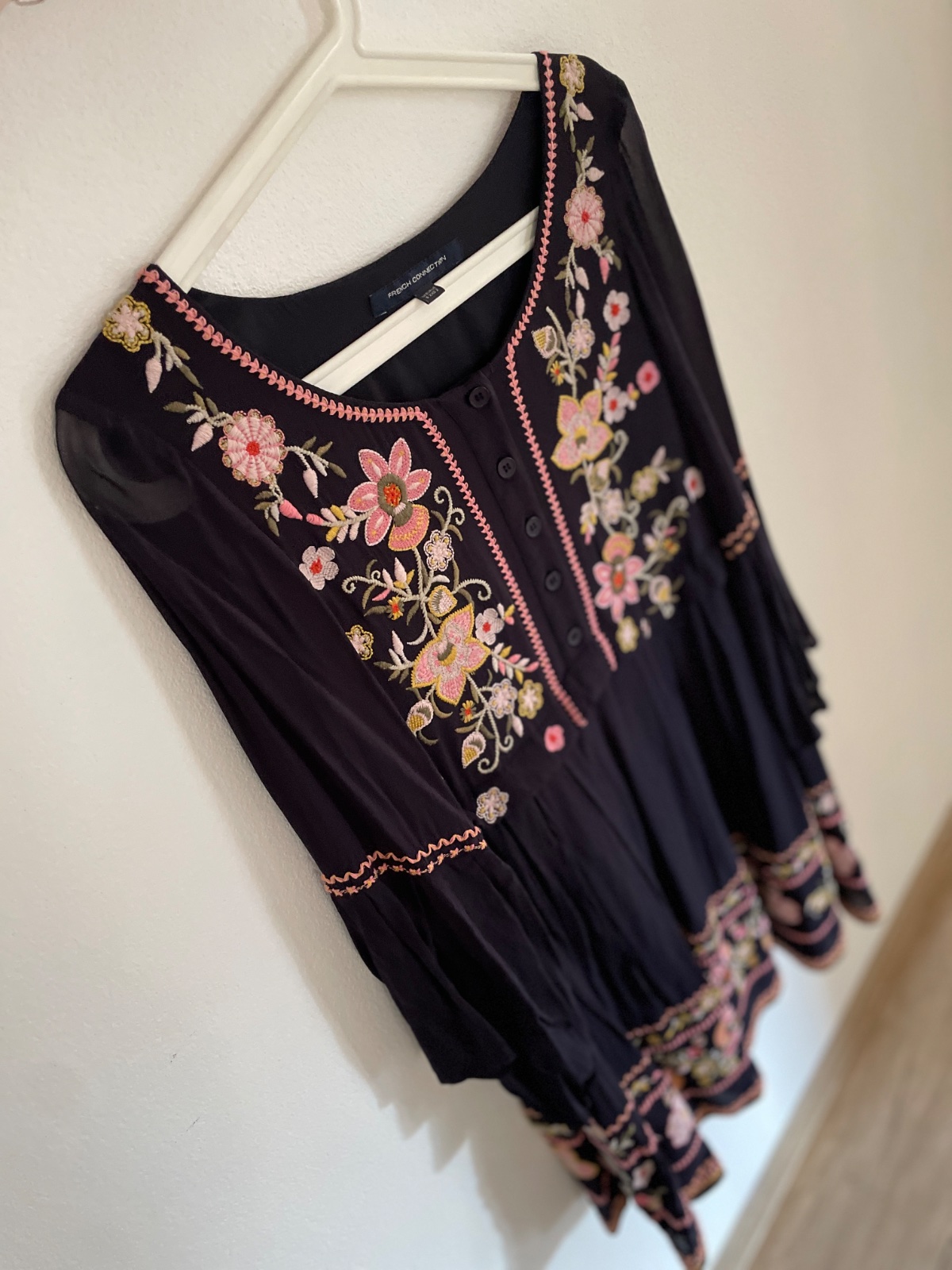 Sat v super stave! Veľkosť XS, sedia na s, sú oversize, takze kľudne aj na M. Krásny padavy strih. Farba vyzerá ako “navy” ale pôsobia, že sú cierne. Značka: French connection. Dĺžka je taká jemne nad koleno.