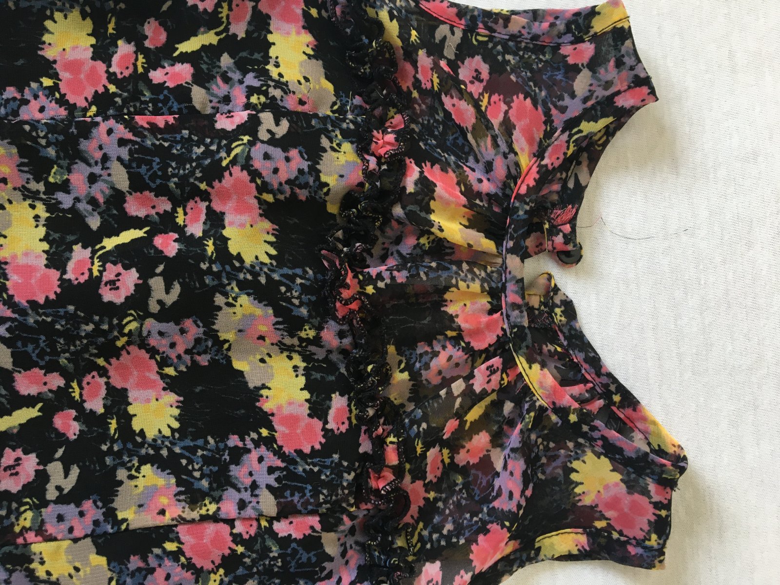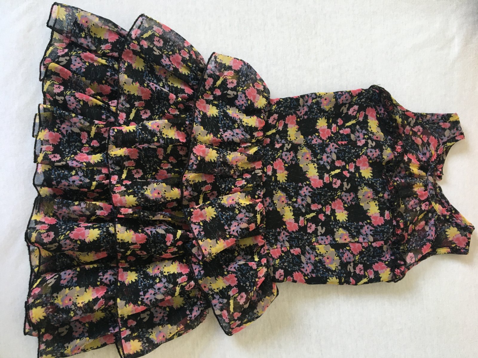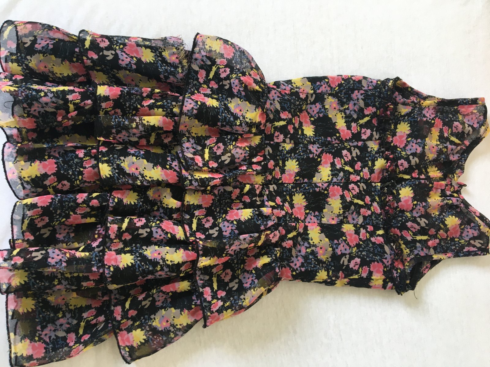 Ľahké letné šatočky s volánikovou sukničkou, kvetinkový vzor na čiernom podklade, s čiernou podšívkou, dĺžka šatočiek je vzadu 57cm, vrchná časť má 27cm. Zapínajú sa vzadu na dosť dlhý zips, takže sa pohodlne obliekajú.
