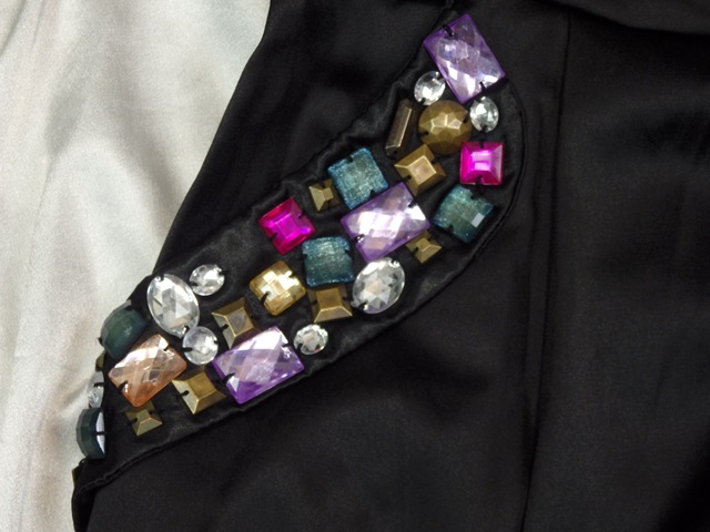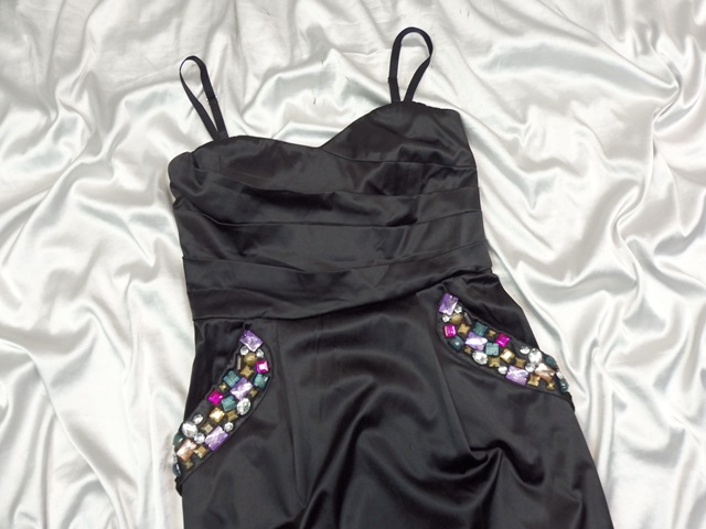 Luxusné čierne šaty s farebnými kamienkami, efektne riasené, v hornom leme silikonový, pásik, materiál saténový, 50% polyester, 47% bavlna, 3% elastan, odoberateľné ramienka, super stav.