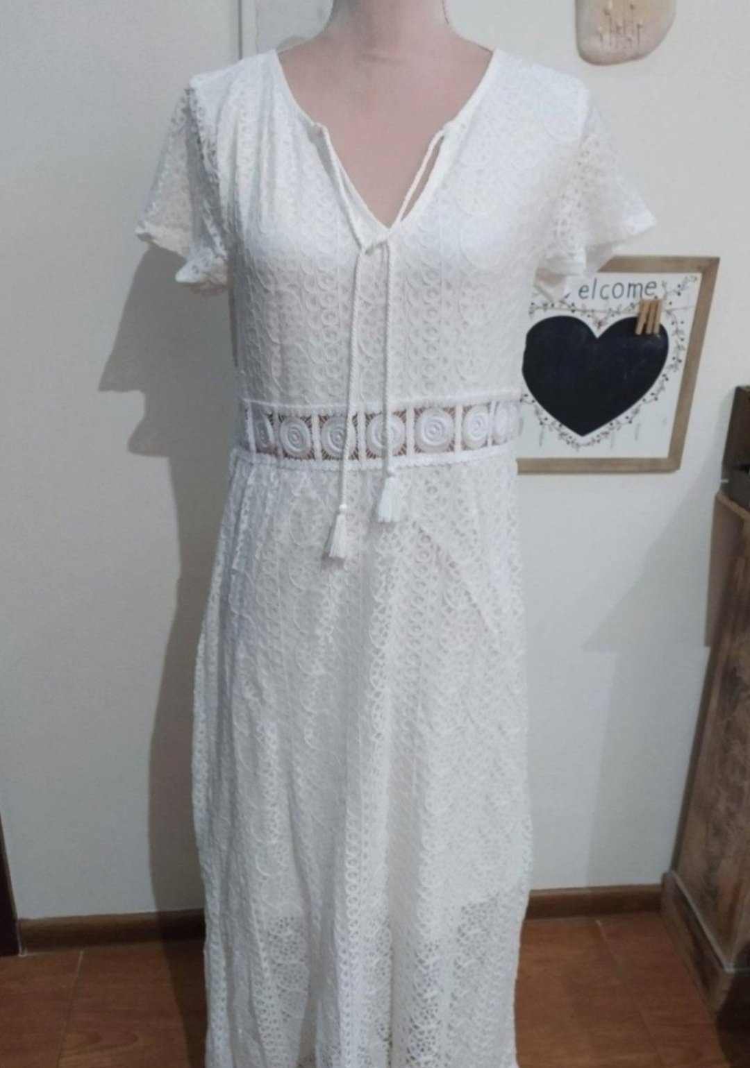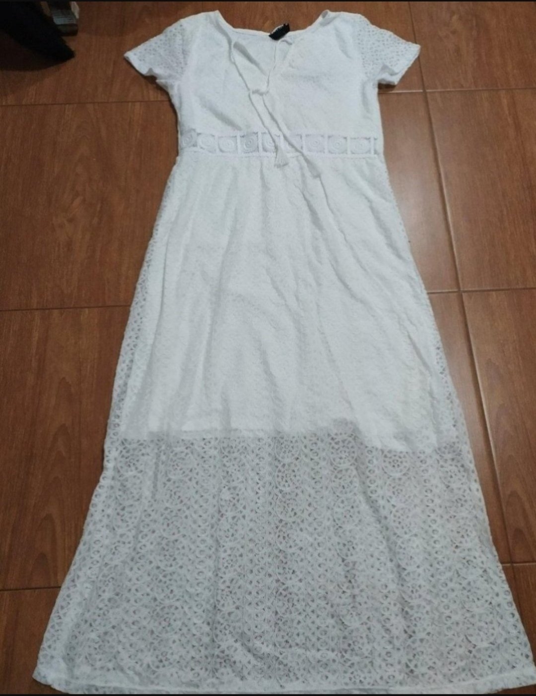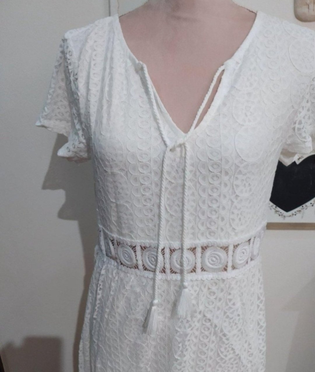 Nové, nenosené šaty zo Sheinu, 100% polyester, vrúbkovanejšia textúra ako je na obrázku. Viac info, fotiek a recenzii môžete nájsť na stránke Shein, pod názvom SHEIN VCAY Guipure Lace Insert Ruffl...