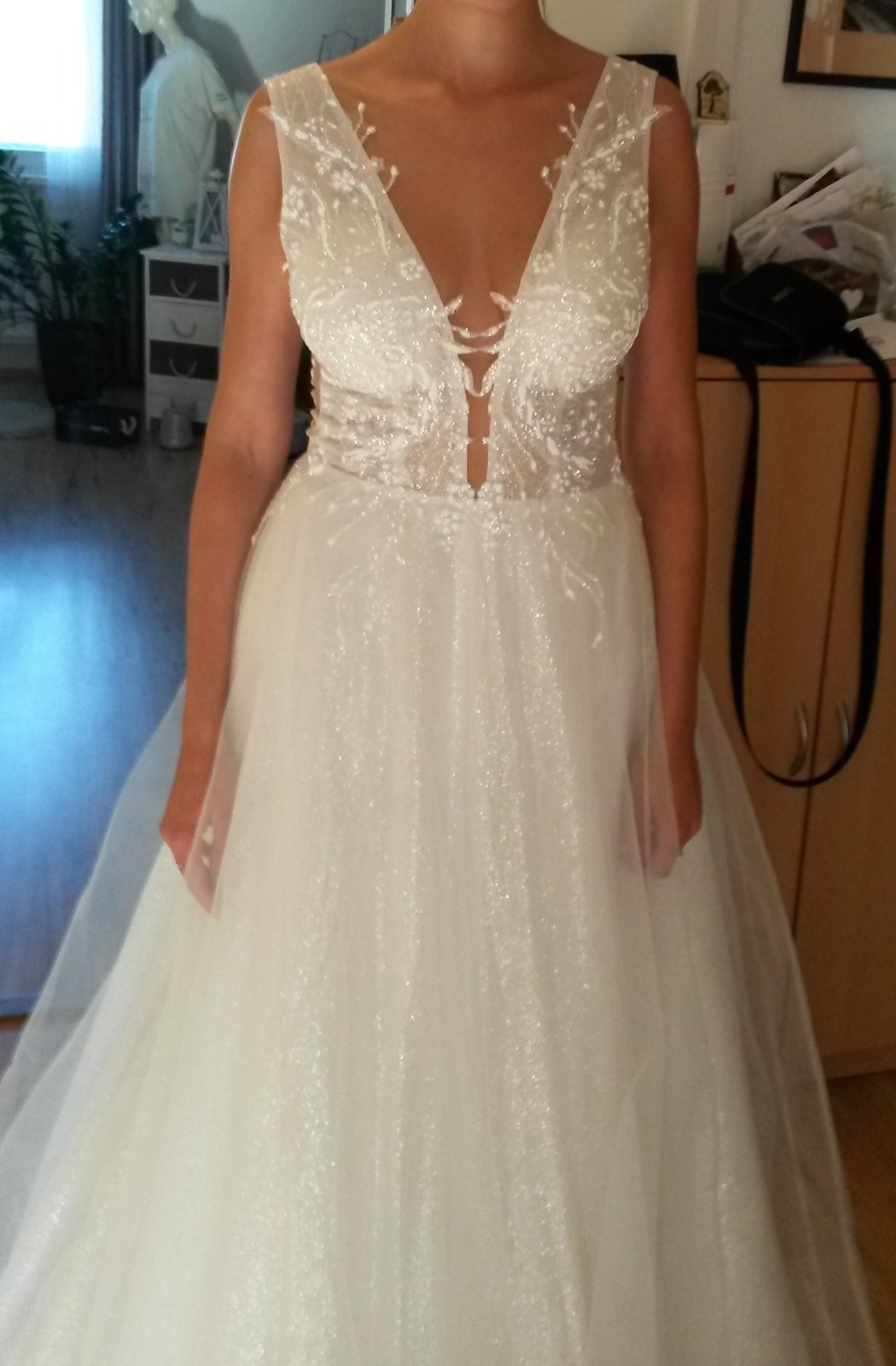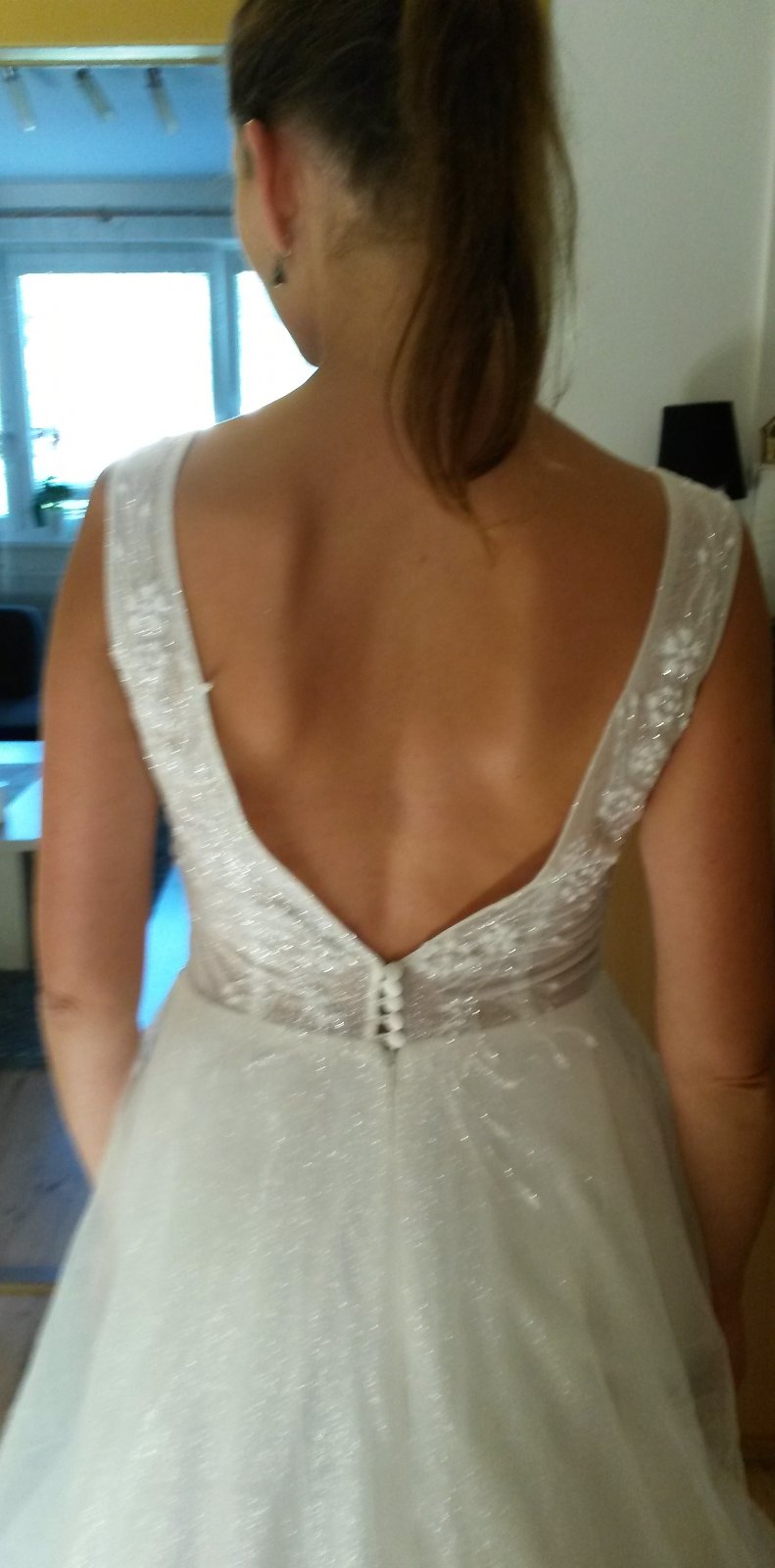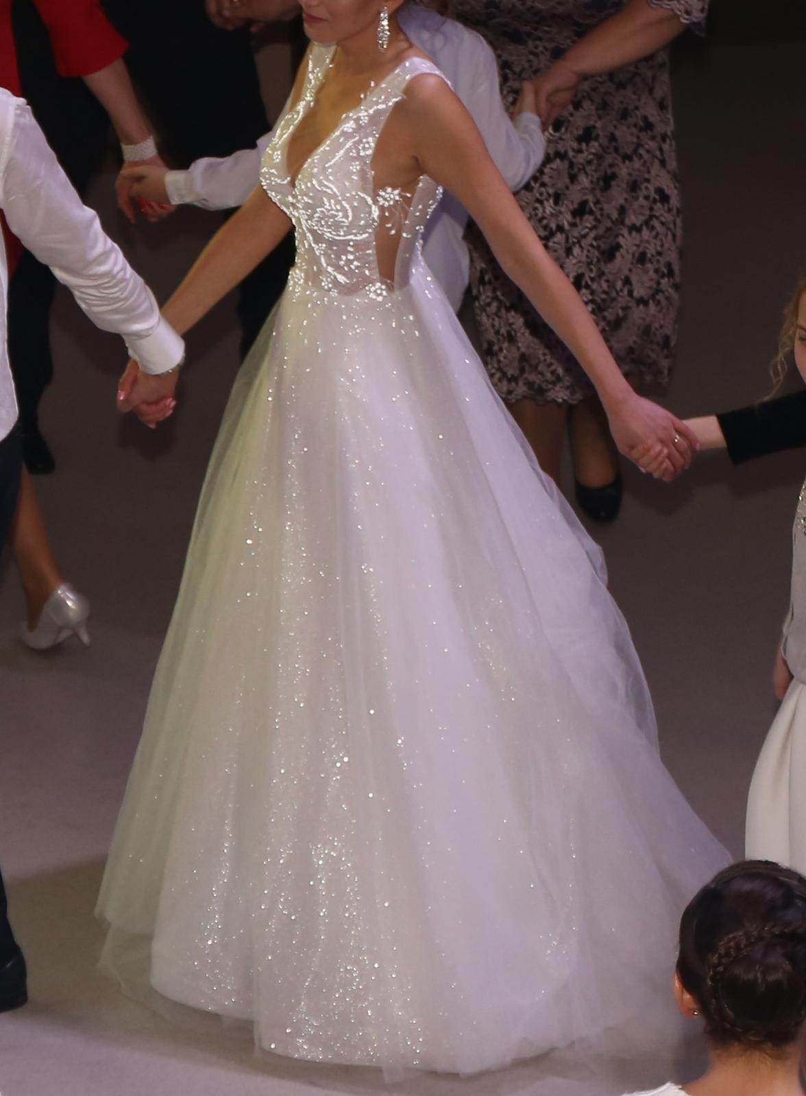 Predám raz oblečené svadobné šaty, som prvá majiteľka. Šaty boli podhnuté na výšku 173 cm + 5 cm opätok, sú však vhodné aj pre vyššiu postavu. Výstrih na šatách som mala mierne upravený - zmenšený, ale úpravy boli robené tak, aby sa dali vrátiť do pôvodného stavu. Veľkosť šiat cca 36, po vrátení do pôvodného stavu možno aj 38, treba vyskúšať. Šaty majú kratšiu vlečku, ktorá sa dá vypnúť. Pod šatami som mala menší kruh (požičaný zo salónu).