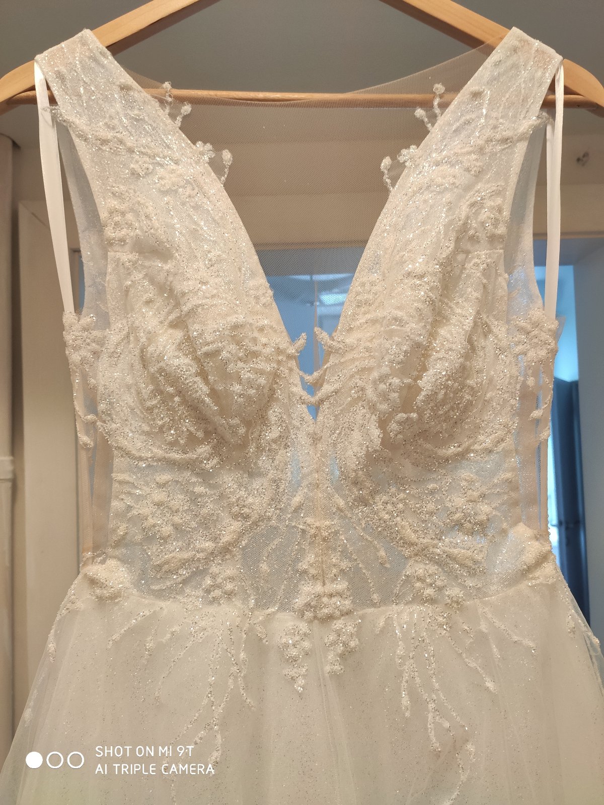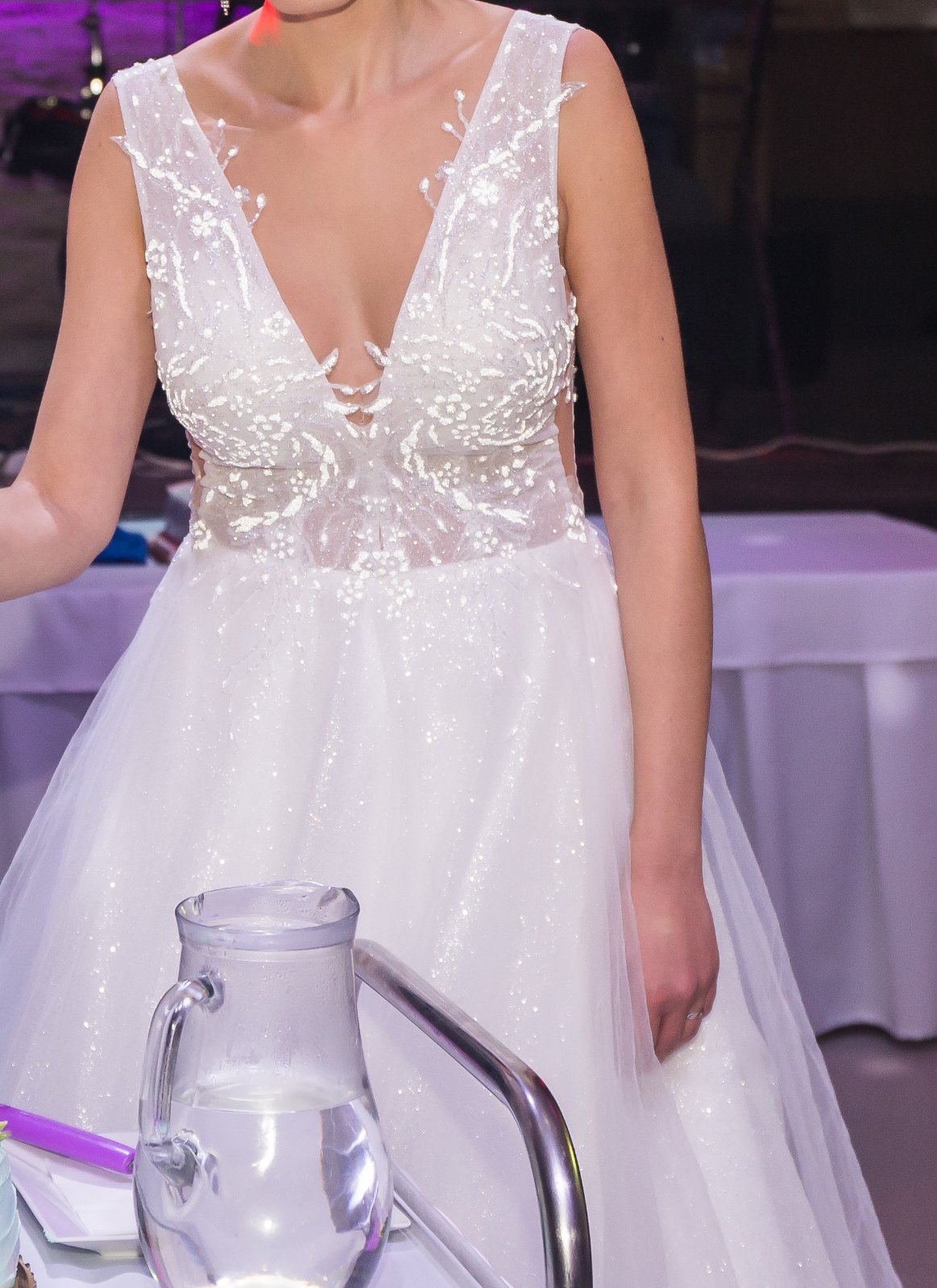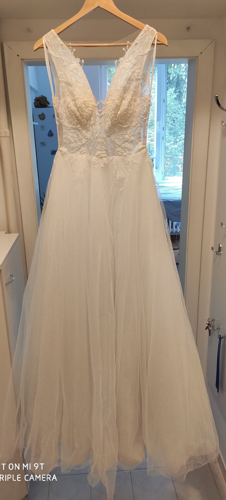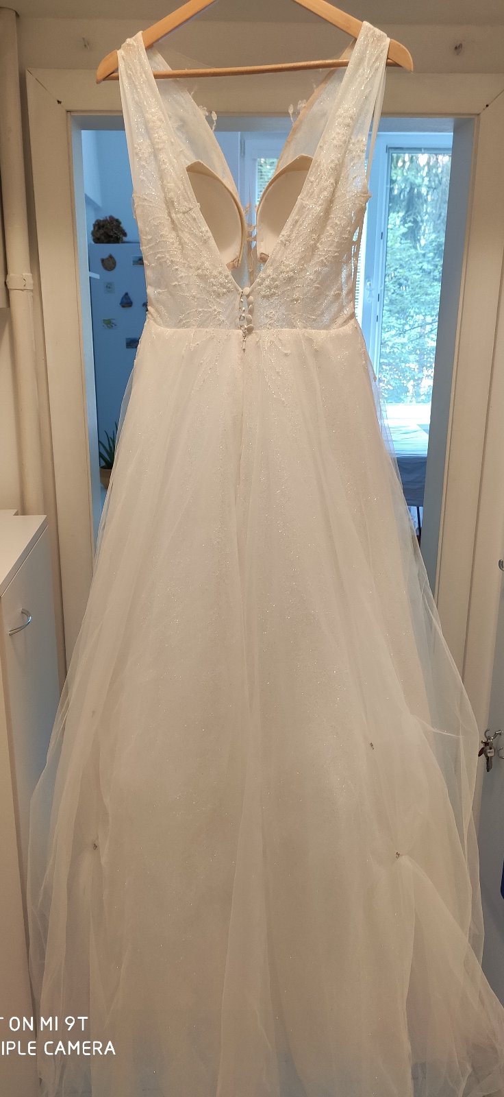 Predám raz oblečené svadobné šaty, som prvá majiteľka. Šaty boli podhnuté na výšku 173 cm + 5 cm opätok, sú však vhodné aj pre vyššiu postavu. Výstrih na šatách som mala mierne upravený - zmenšený, ale úpravy boli robené tak, aby sa dali vrátiť do pôvodného stavu. Veľkosť šiat cca 36, po vrátení do pôvodného stavu možno aj 38, treba vyskúšať. Šaty majú kratšiu vlečku, ktorá sa dá vypnúť. Pod šatami som mala menší kruh (požičaný zo salónu).