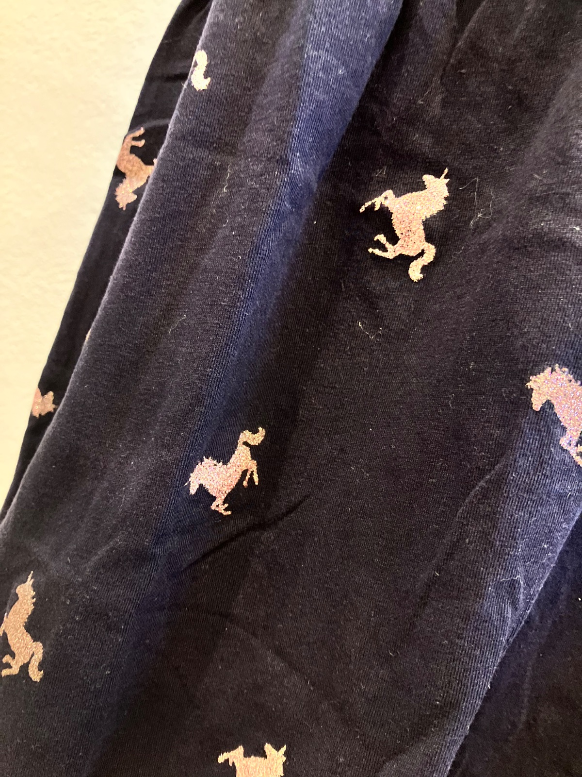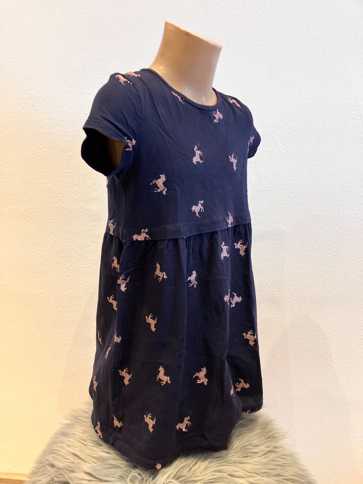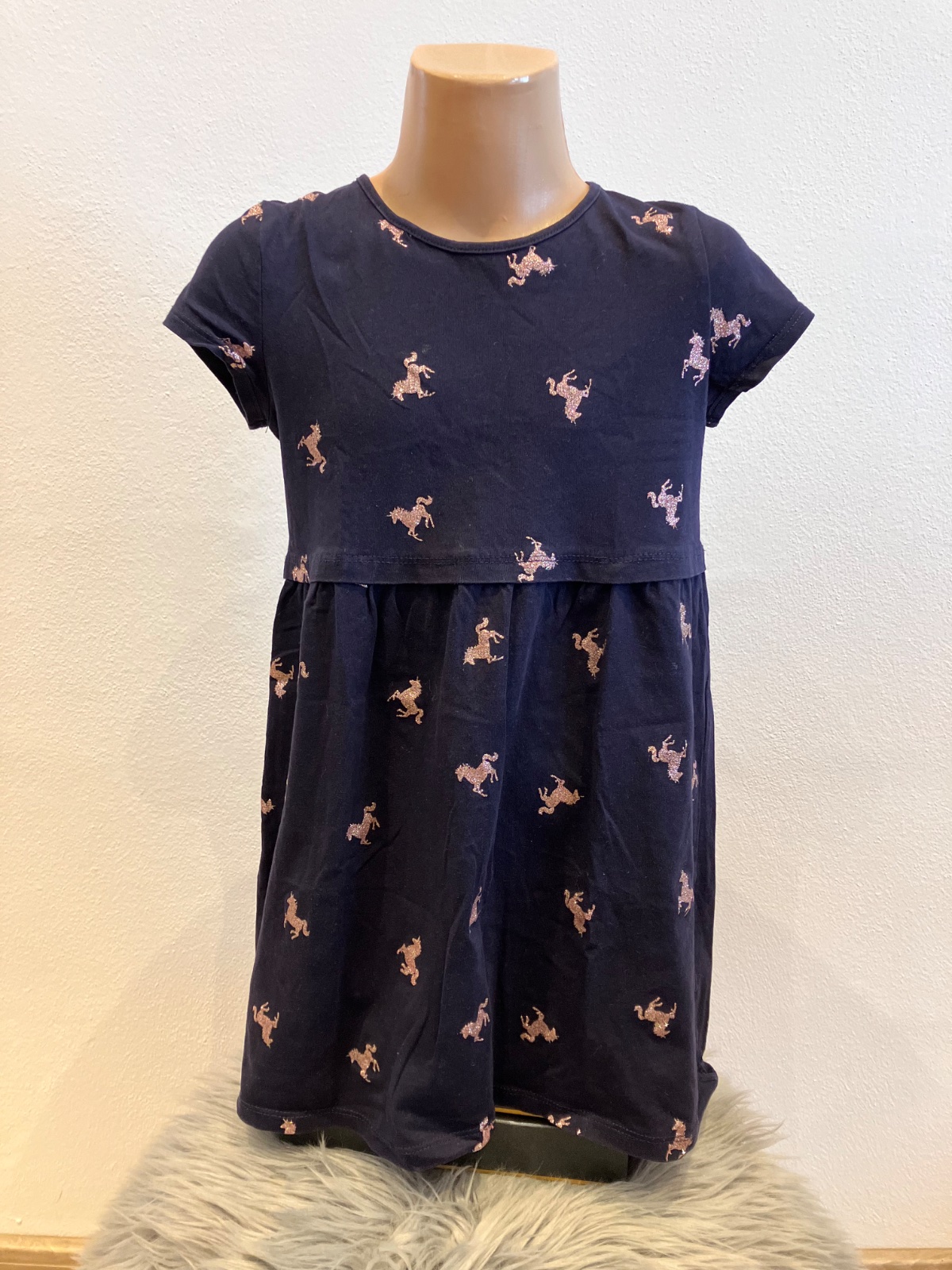 Dievčenské šaty s krátkym rukávom a vzorom jednorožca, tmavomodré s trblietavým ružovým vzorom, okrúhly výstrih, elastické, materiál 100%bavlna.