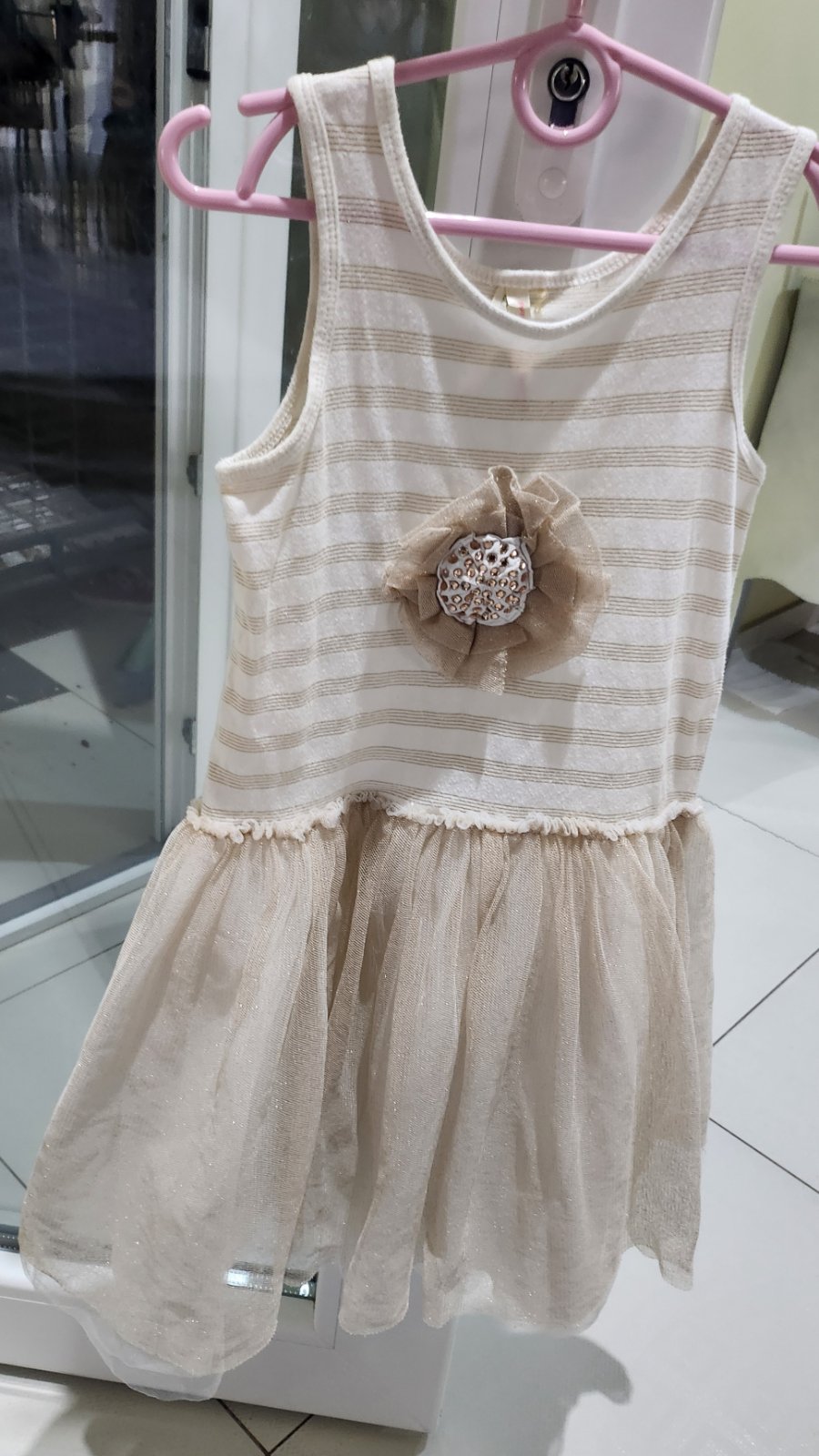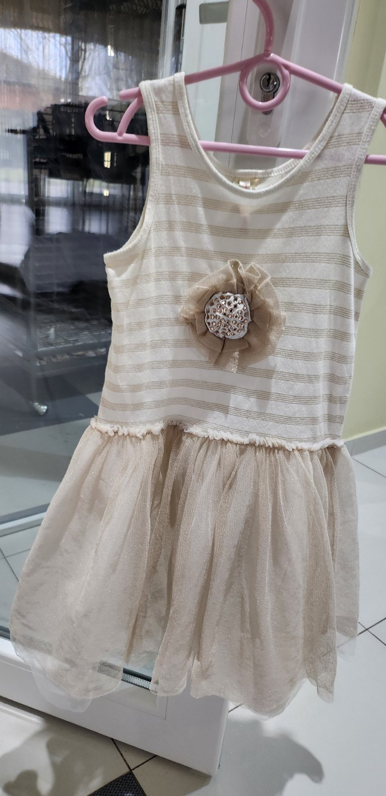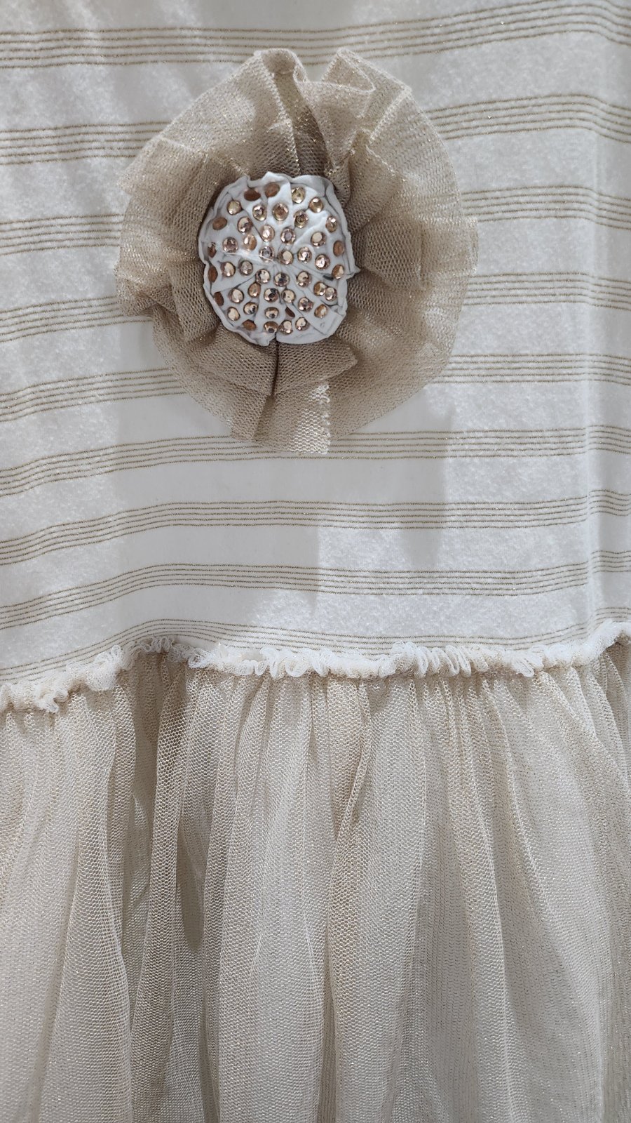 Krásne lesklé šaty zo zlatými detailami.Na hrudi je kvietok s kamienkami,sukňa je lesklá najmä na slnku,svetlé.Sú značky Breeze