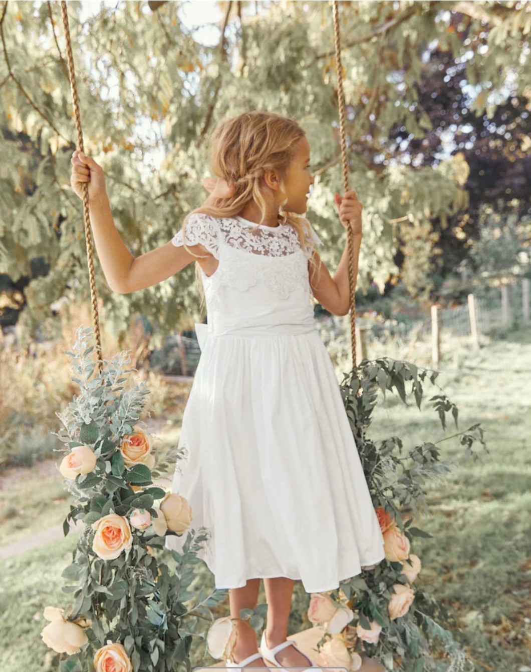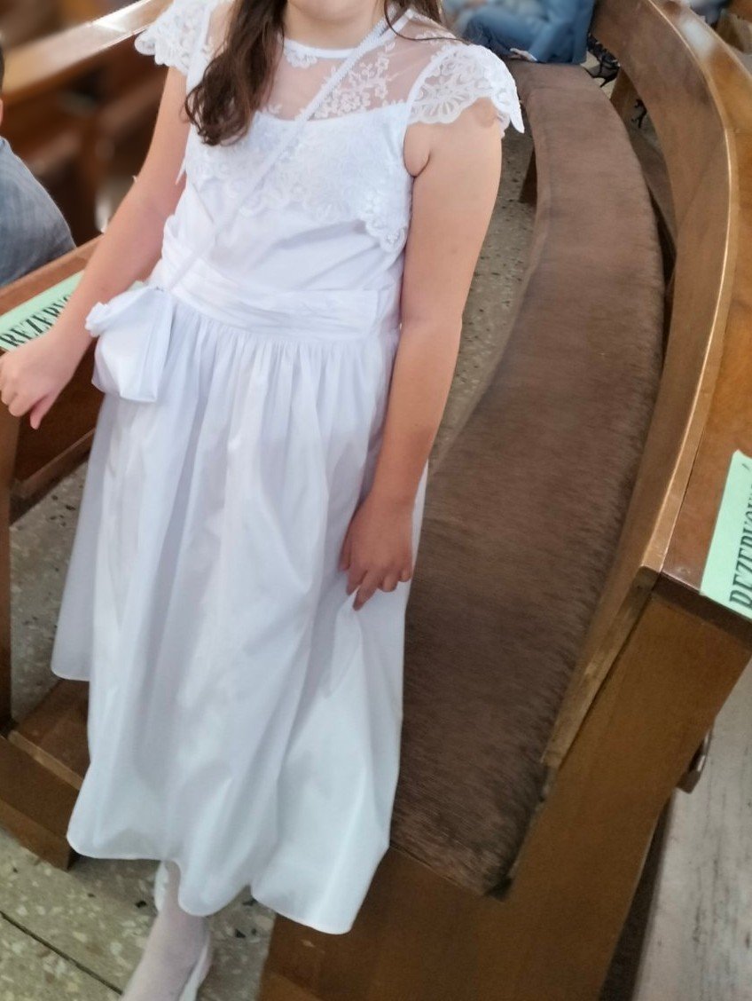 Spoločenské šaty v snehobielej farbe. Patrí k nim aj spodnička. Oblečené iba raz na sväté prijímanie. Bez poškodenia a známok nosenia. Sú ako nové. Pôvodná cena bola 120€.