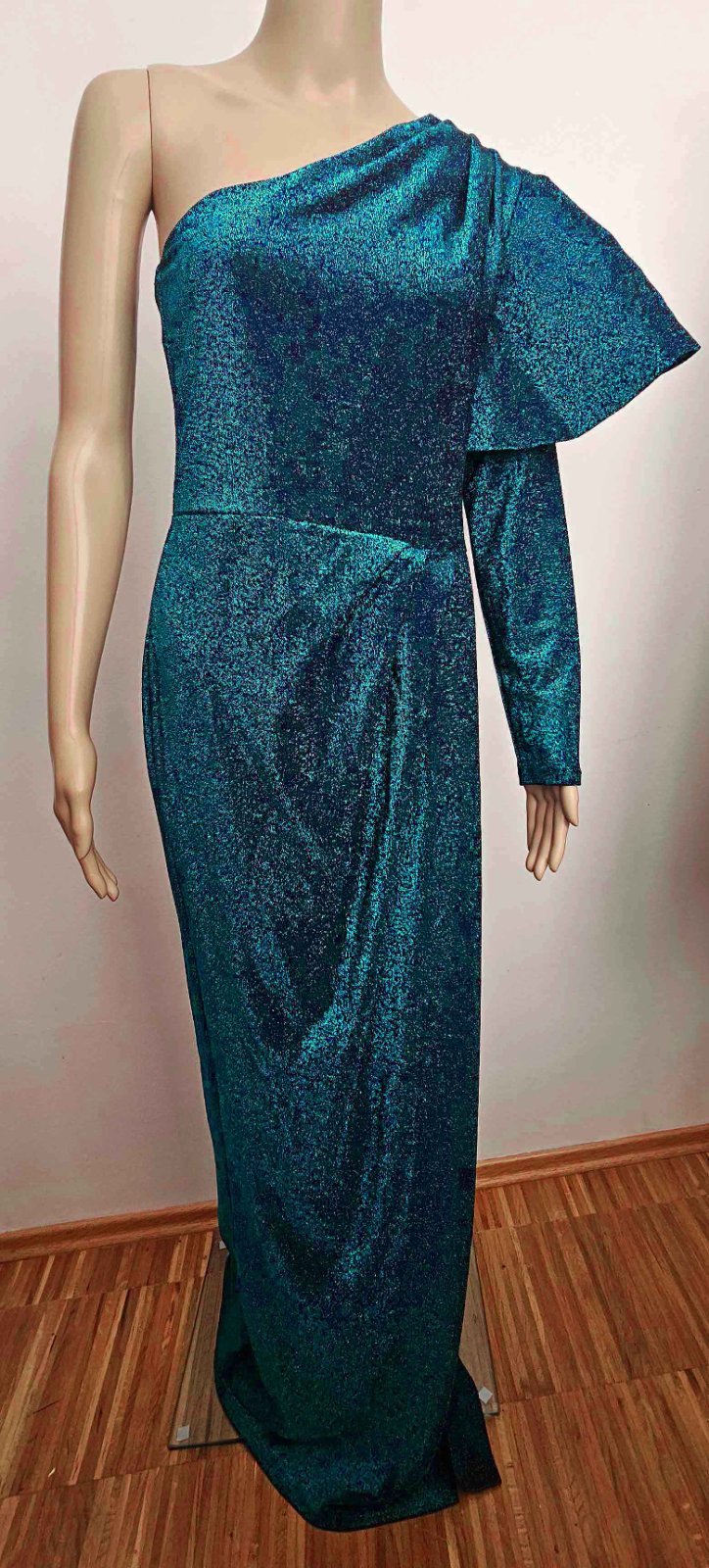 Dĺžka cca 155 cm, šírka v hrudníku max cca 55x2 cm, šírka v páse max cca 50x2 cm. Farba sýta tmavo tyrkysová.
