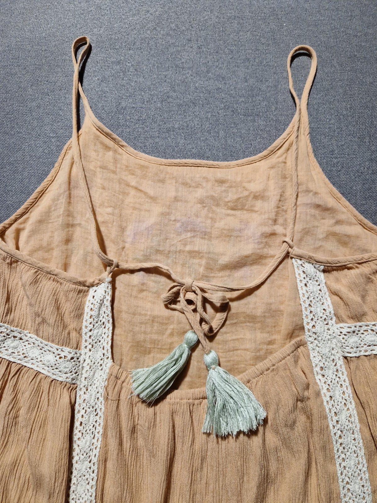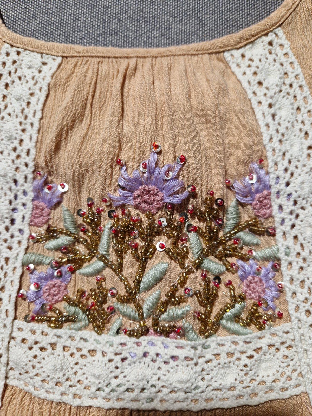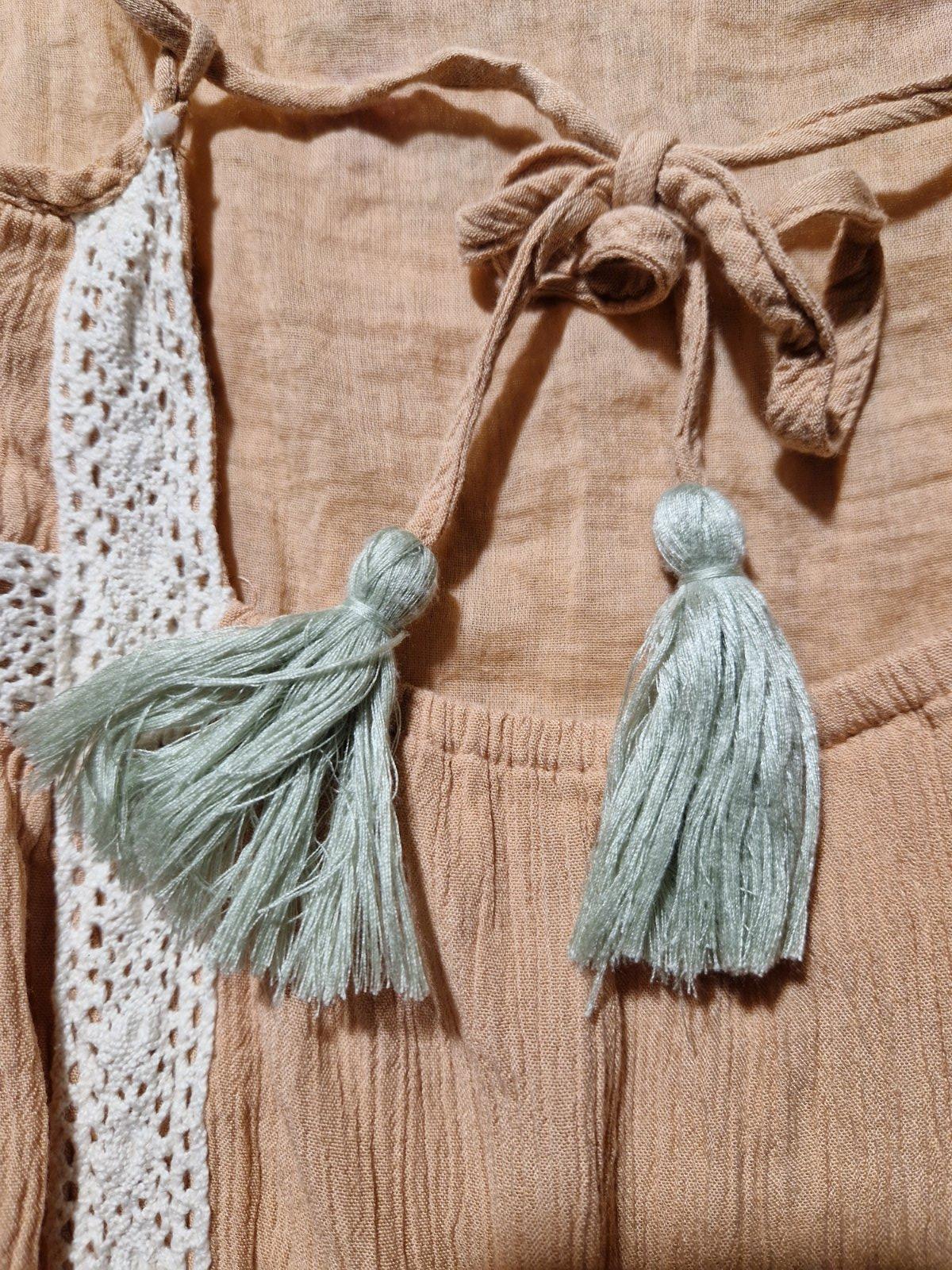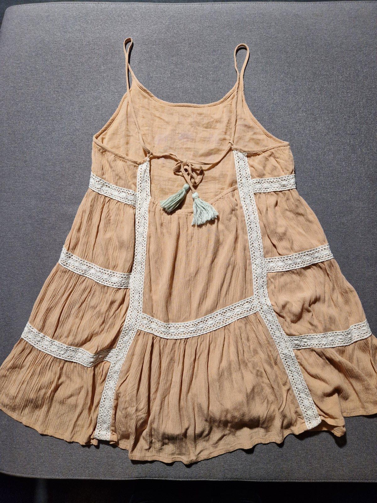 Mnou nenosené. Super stav. Akurát na pravej výšivke chýbajú navrchu gorálky, viď foto. Podšité. Zaujímavo riešené. Na chrbáte viazačka. Skôr na plnší dekolt. Ja mám menší hrudník a tým pádom mi vzadu v časti pod viazačkou odstávajú. Je tam gumka, takže sa ešte natiahnu pri plnšej postave. Vrchný materiál krepový nakrčený. Krásna púdrovoružová farba.