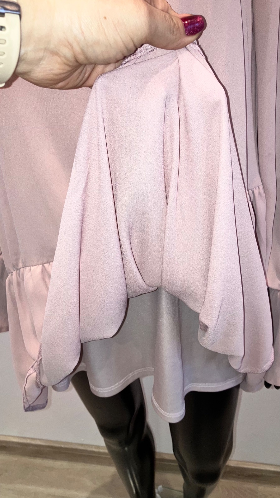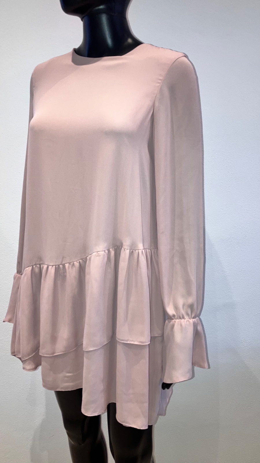 Dámske šaty s dlhým rukávom a volánmi, na konci rukáva na gumičku, zapínanie vzadu na jeden gombík, podšité. Rukáv je priesvitný. Nie sú elastické.