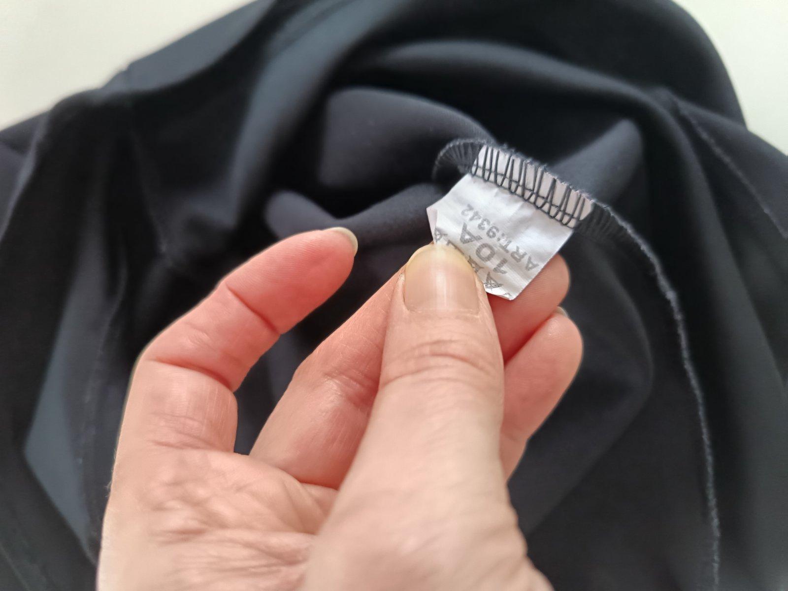Čierne šaty, strih do Áčka rukávy sú z bieleho šifonu s čiernymi bodkami, pod krkom tiež šifonova mašlička na viazanie, sedia veľmi pekne, veľkosť písaná na 10rokov, ale sú menšie