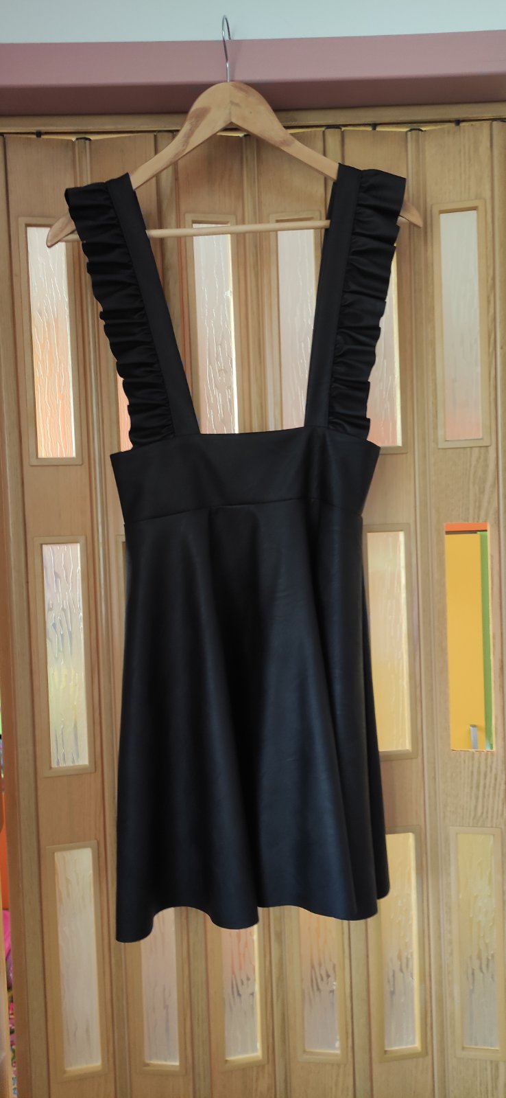 Kožené šaty na ramienka vhodné nosiť pod ňou nejaký top alebo blúzku .dĺžka šiat 85cm.dlzka sukne 55cm.obvod pásu 66cm.nosene iba 1krat.