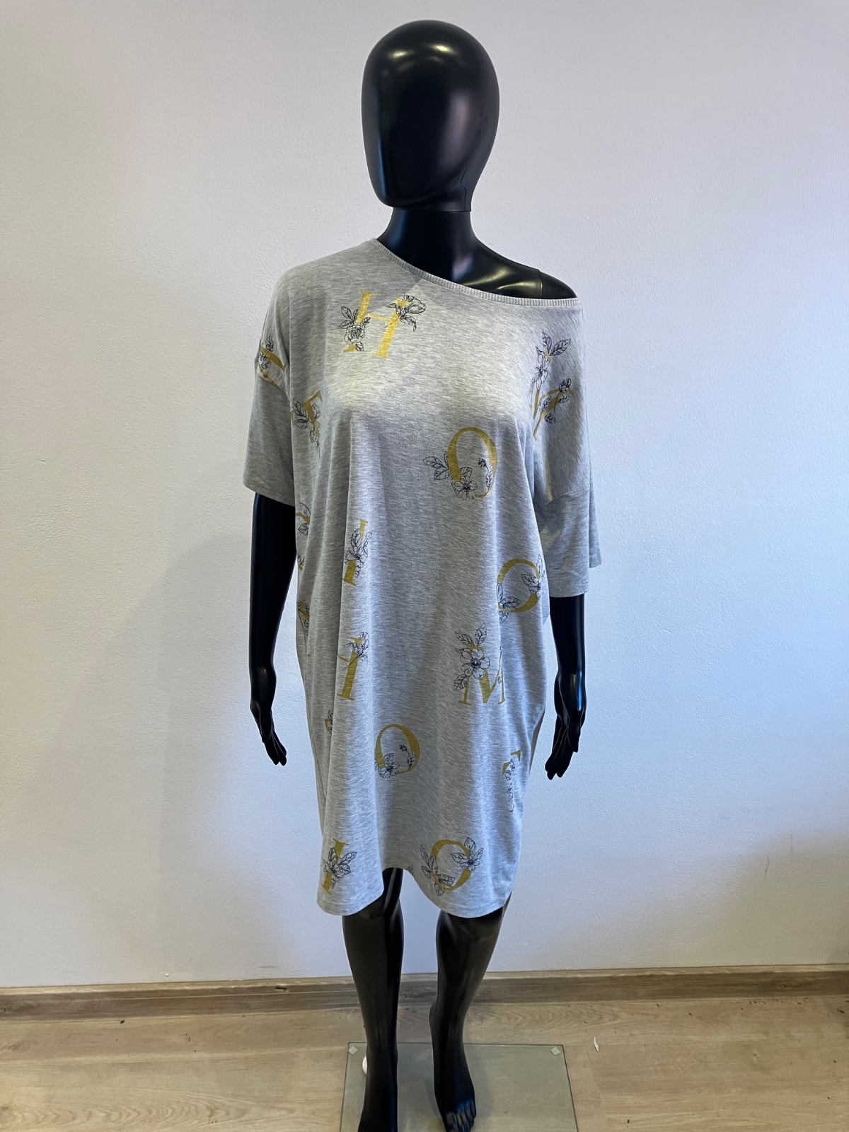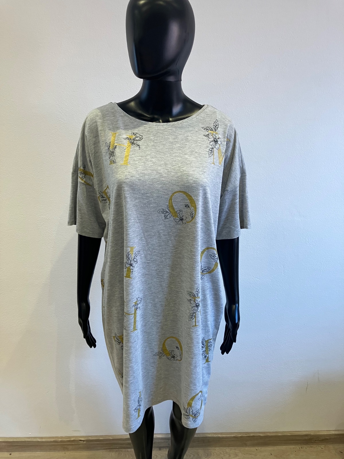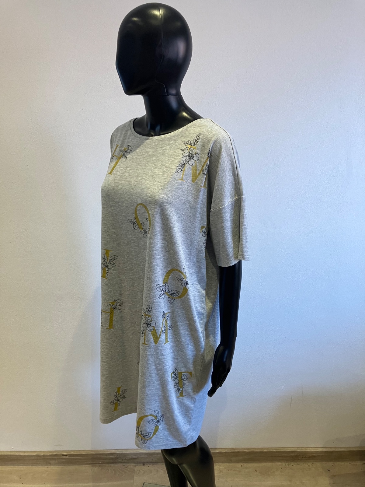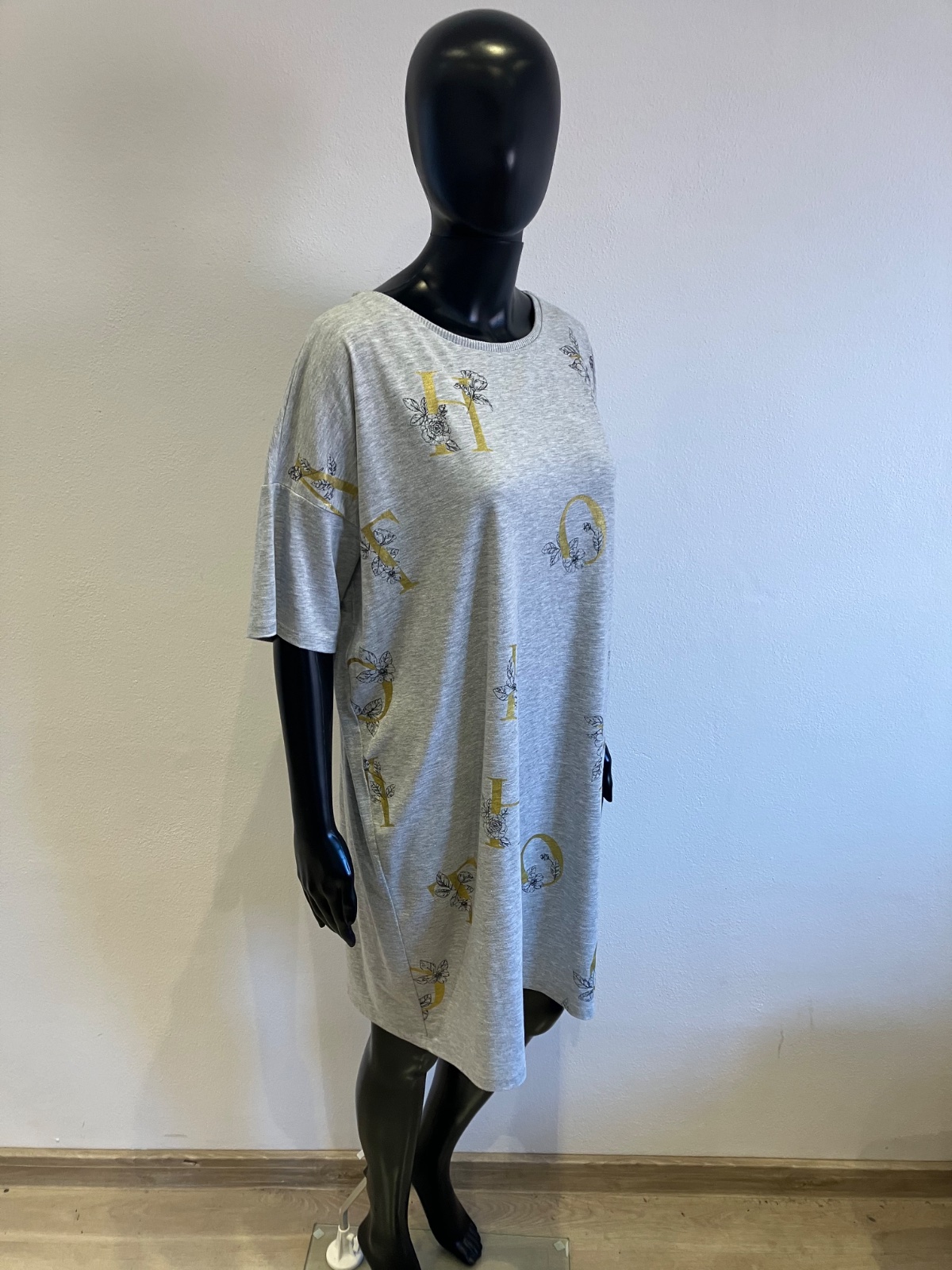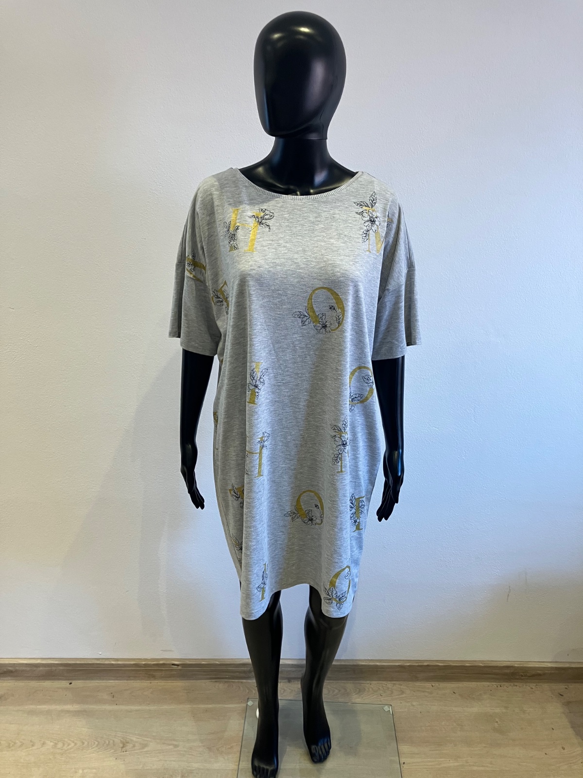 Dámske šaty s krátkym rukávom, okrúhly výstrih, elastické, tenké, farba sivá, nápis zlato čierny.