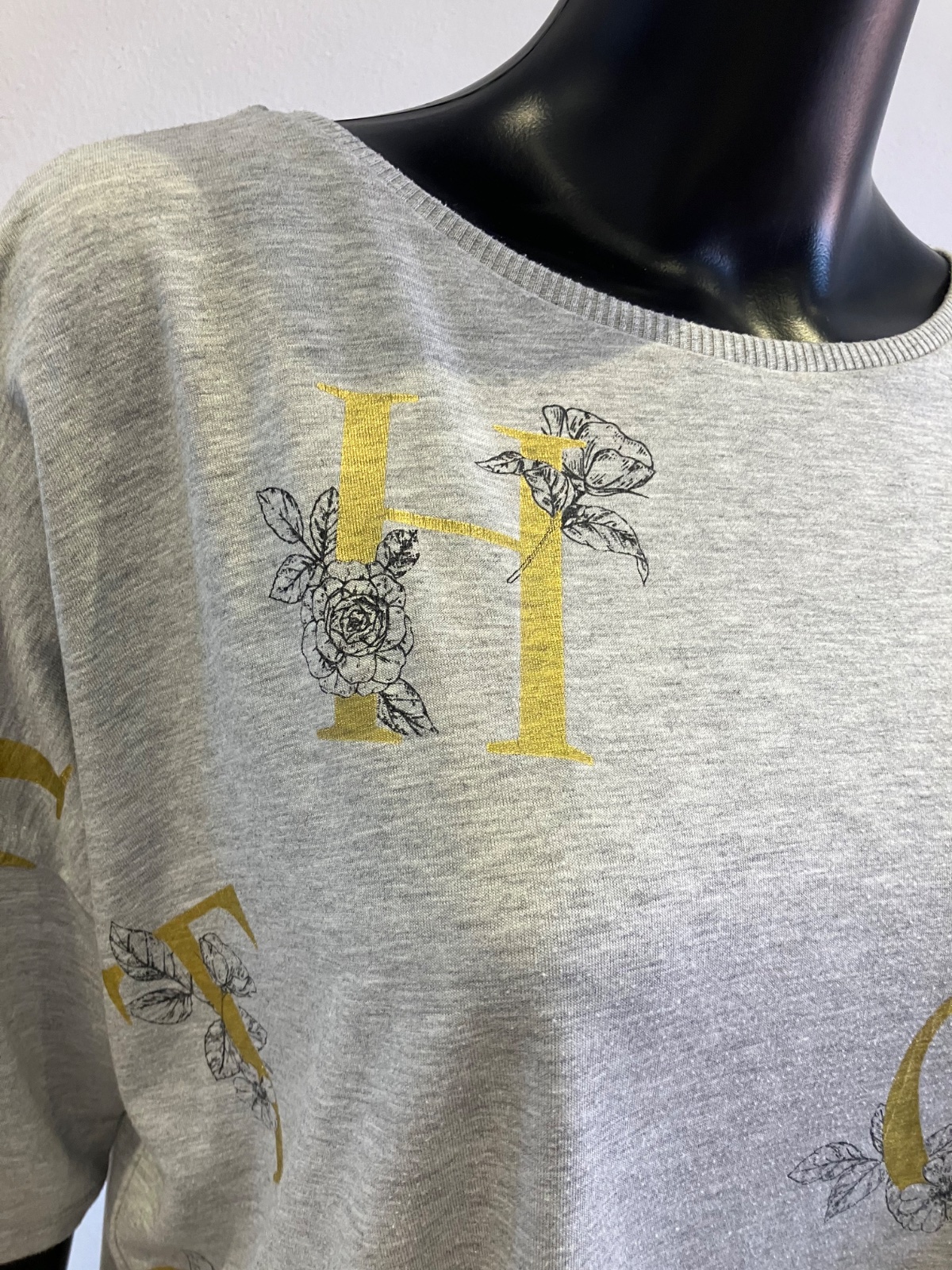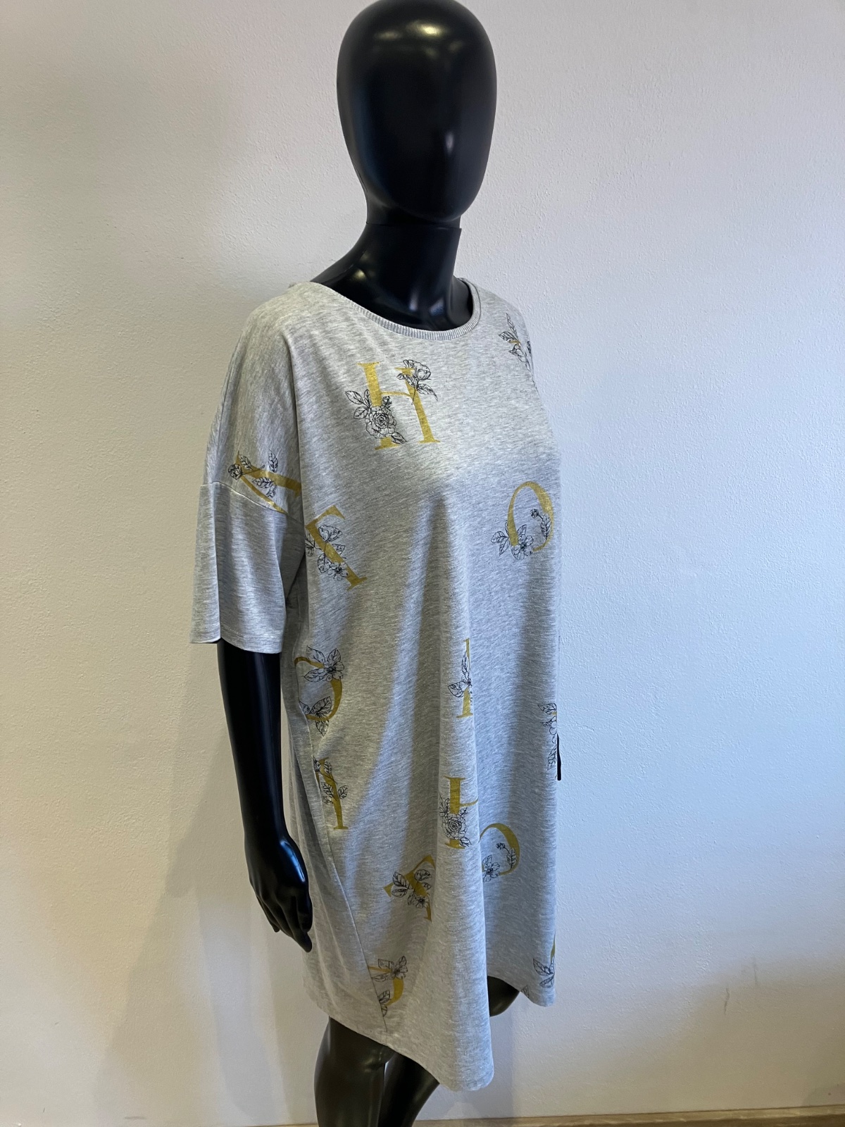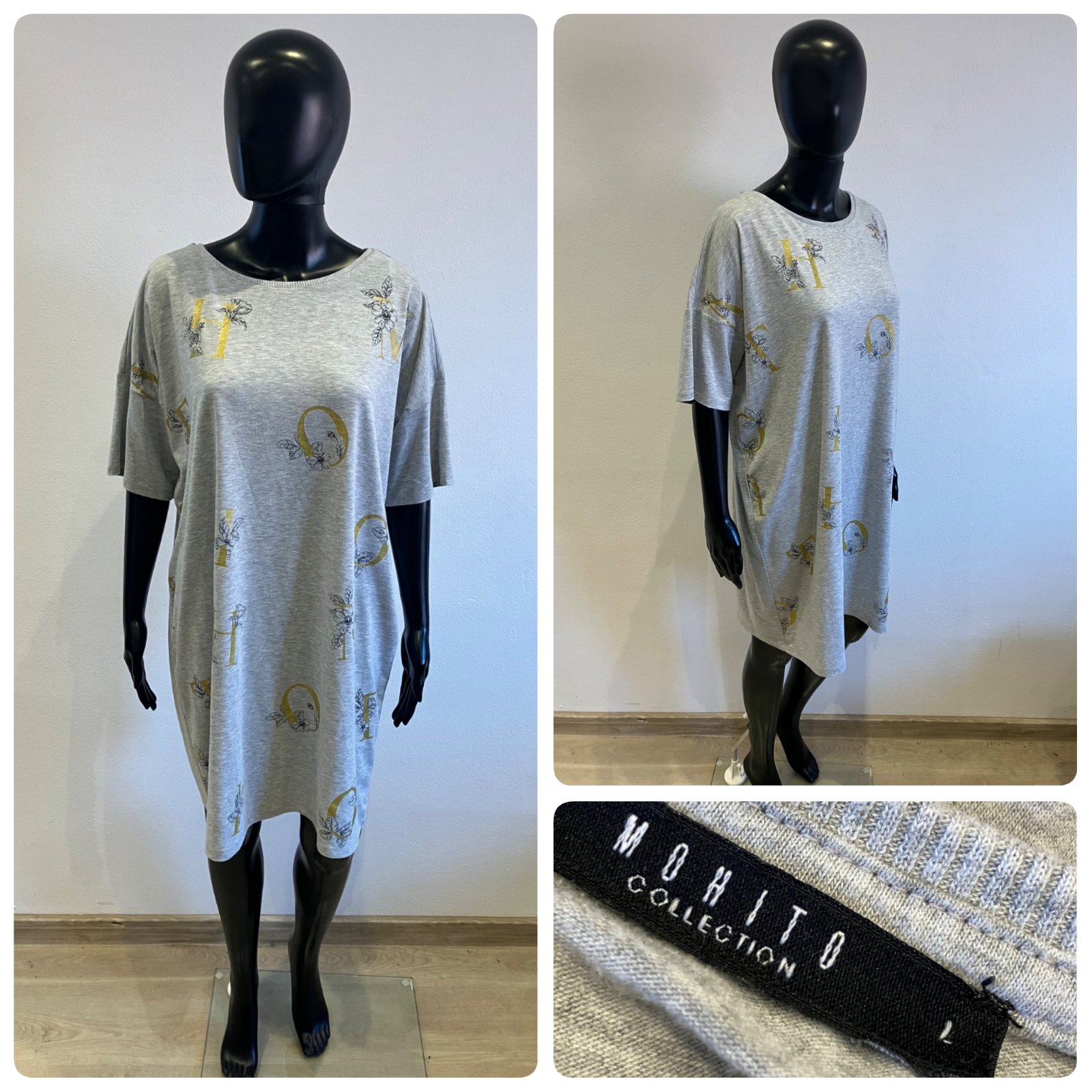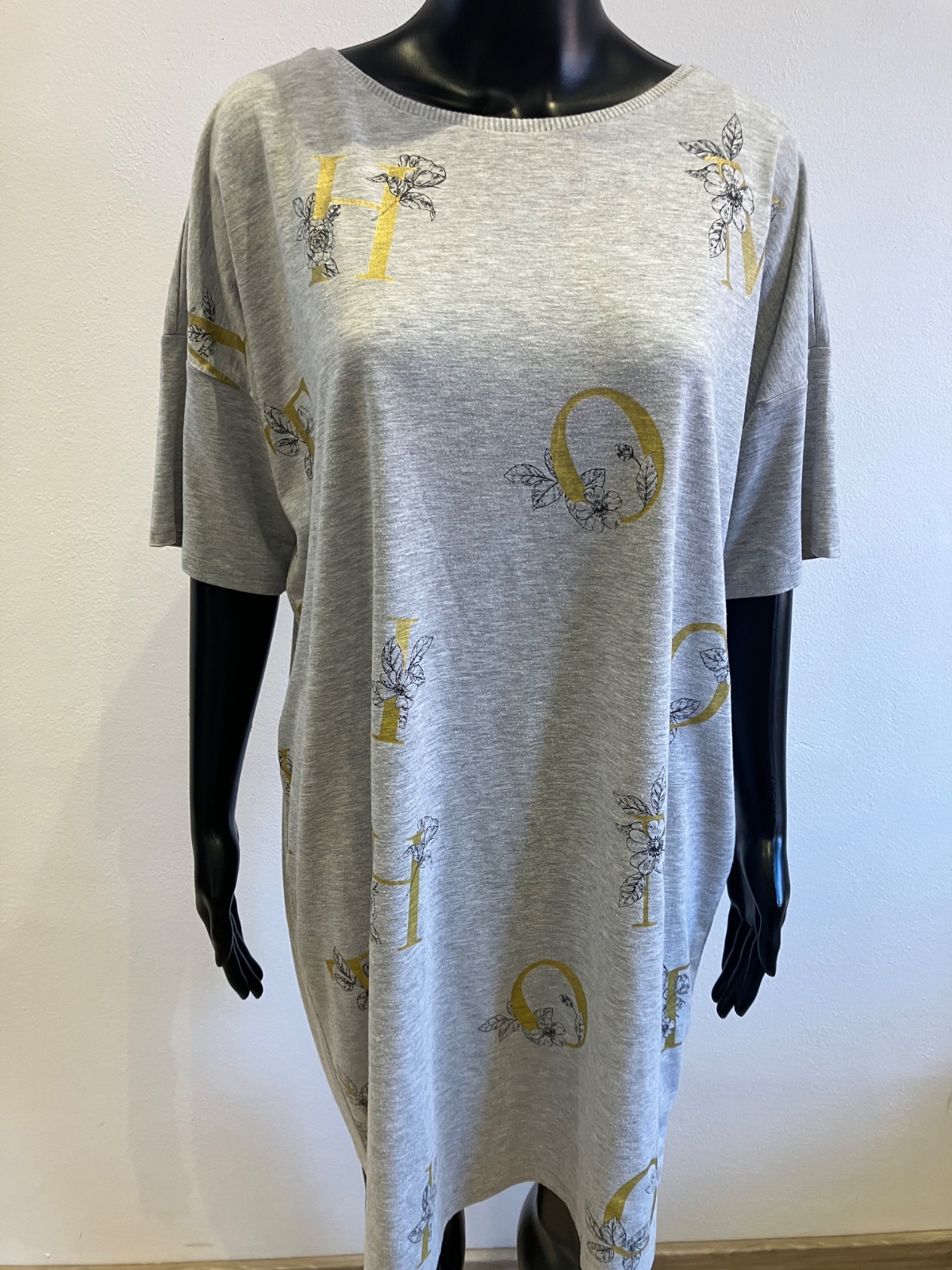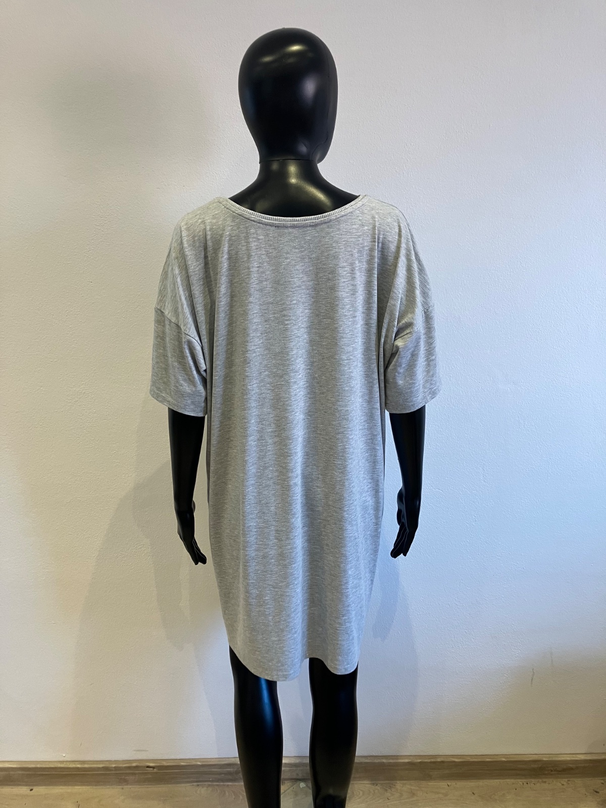 Dámske šaty s krátkym rukávom, okrúhly výstrih, elastické, tenké, farba sivá, nápis zlato čierny.