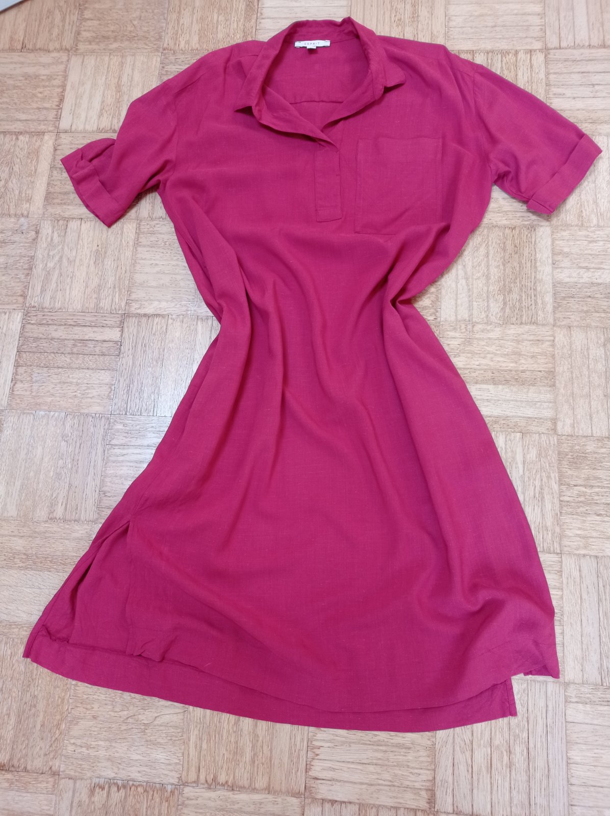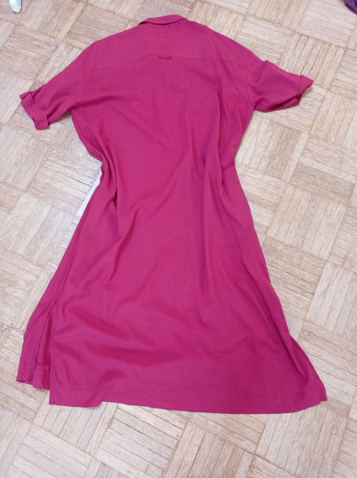 Košeľové šaty Esprit iba oprane a ozehlene, sú mi veľké. Nosím veľkosť 38 až 40. Sedia na veľkosť 42. Nemala som ich oblečené, iba vyskúšané. Top stav. Farba skôr bordová, látka veľmi príjemná.