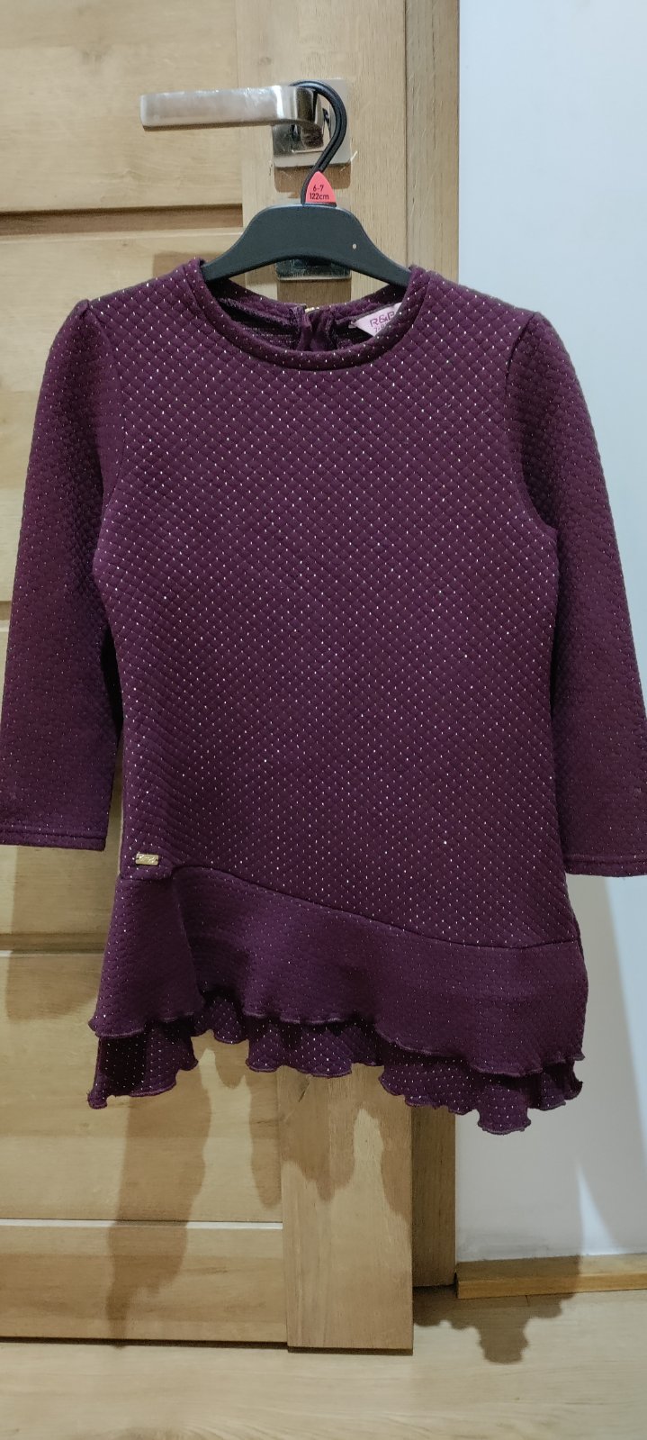 predám používané, nepoškodené dievčenské elastické šaty peknej bordovej farby s dlhým rukávom veľkosť cca 134cm, podľa výšky dievčatka s ozdobou guličiek na rukávoch, obliekanie cez krk, celková dĺ...