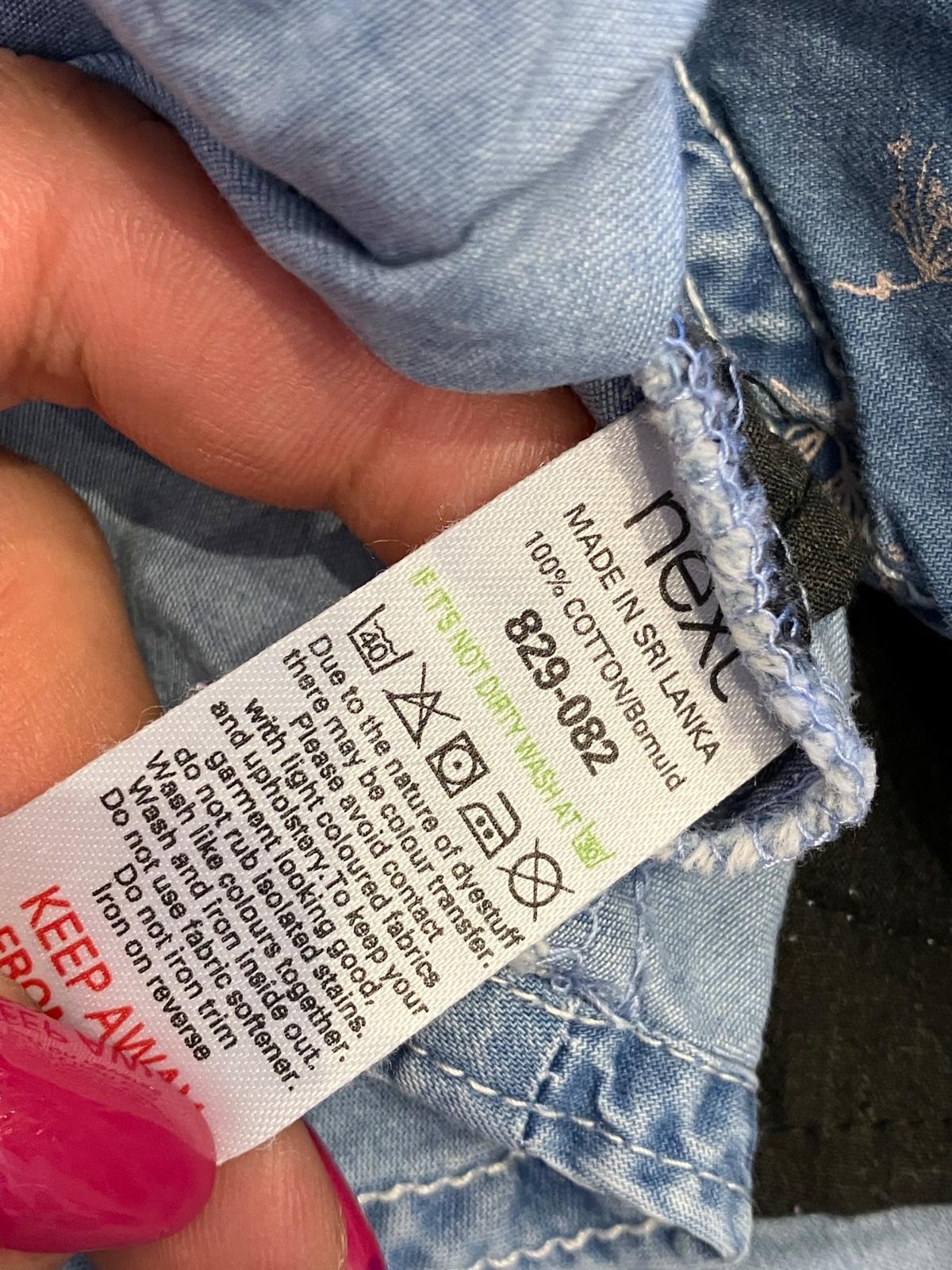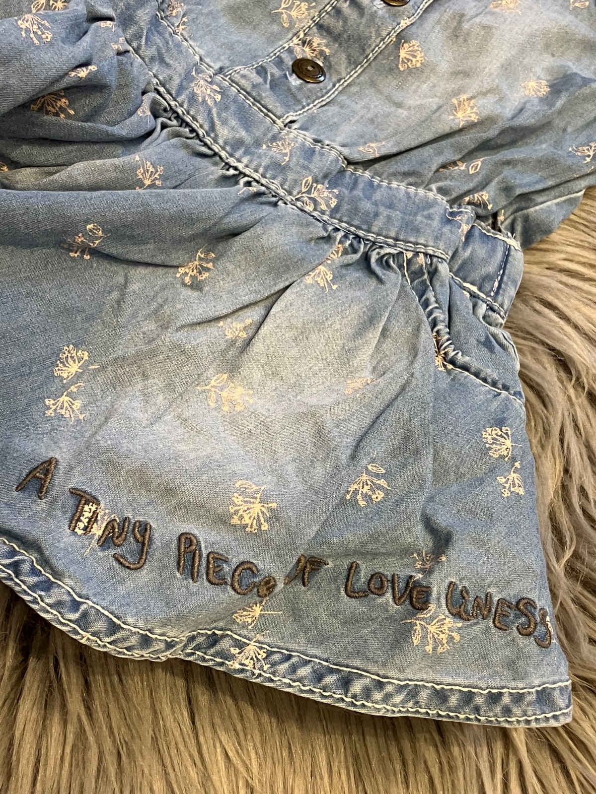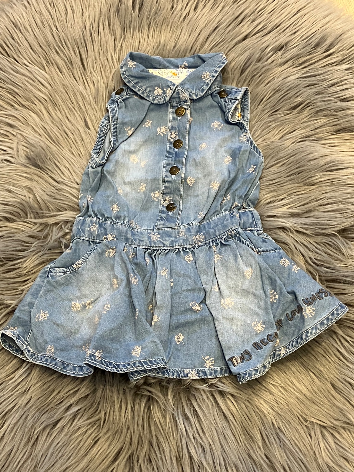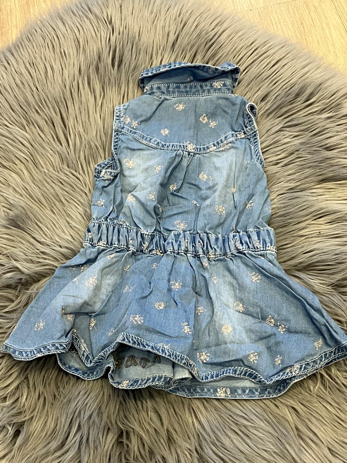 Dievčenské rifľové šaty bez rukávov, zapínanie na gombíky, dve bočné vrecká, jemne elastické, farba svetlomodro biela, materiál 100% bavlna.