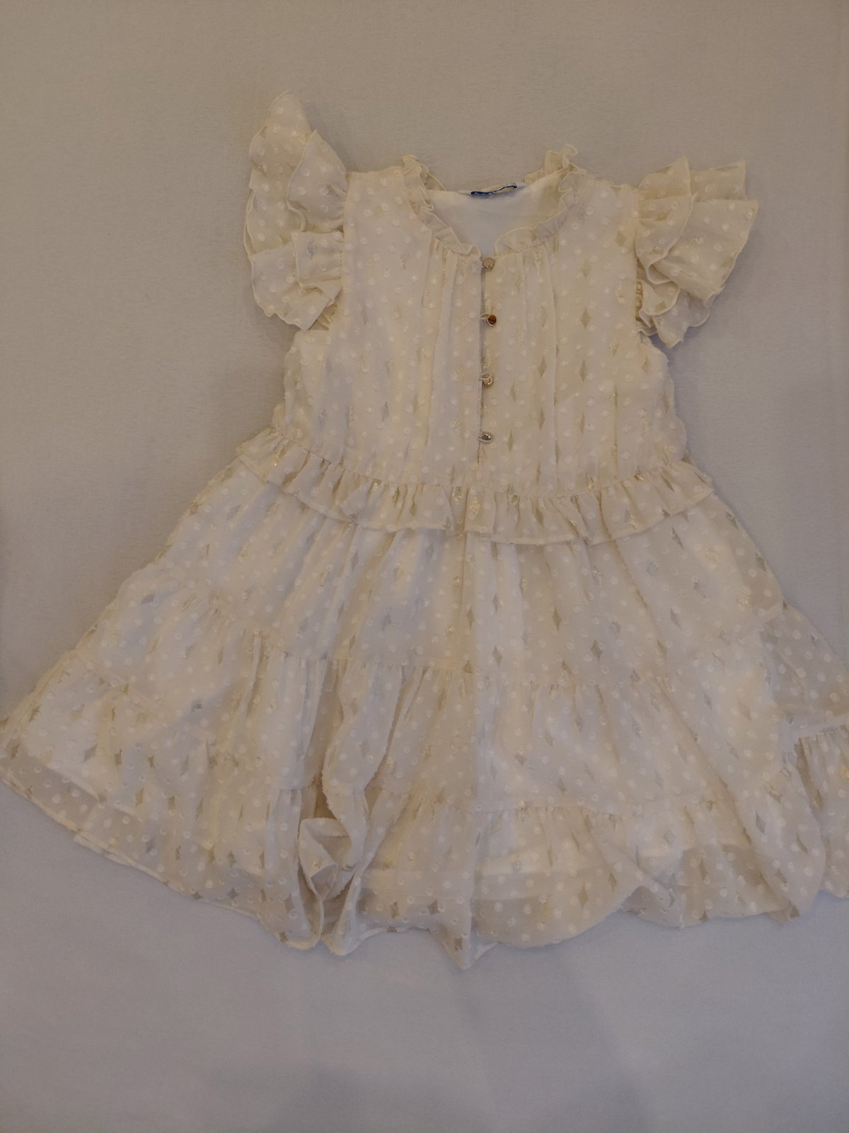 Predám krásne šaty zn.Mayoral v.116,ale sedia na 110.Šaty sú z hrubšieho materiálu.Majú krásne plisované kvietky.
