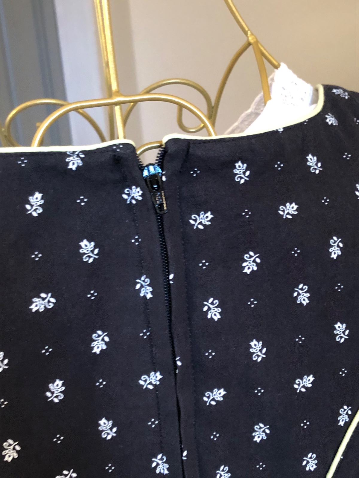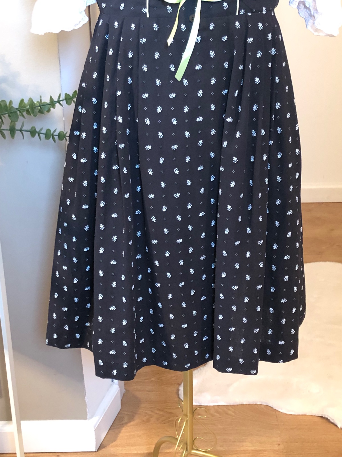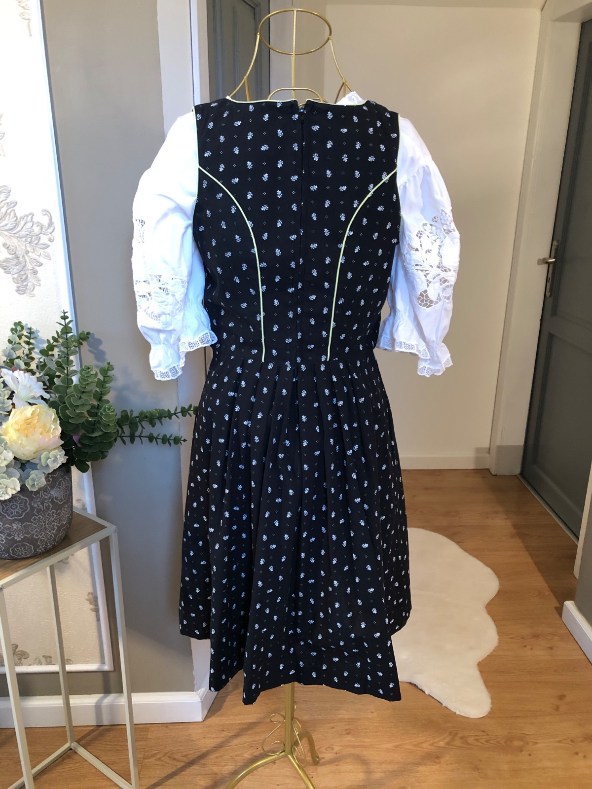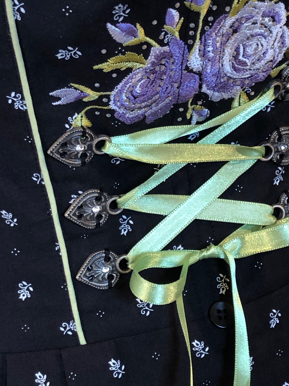 Luxusný kroj čiernej farby s drobným vzorom, vzadu zips, vpredu výšivky a snurovačka, bez blúzky, predáva sa zvlášť, bez zástery.