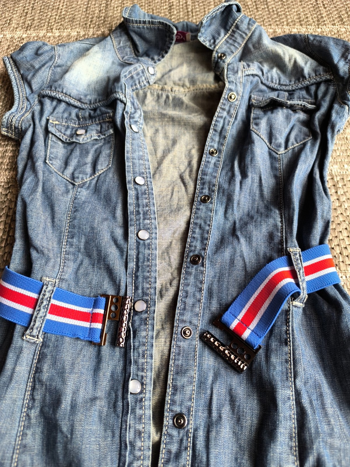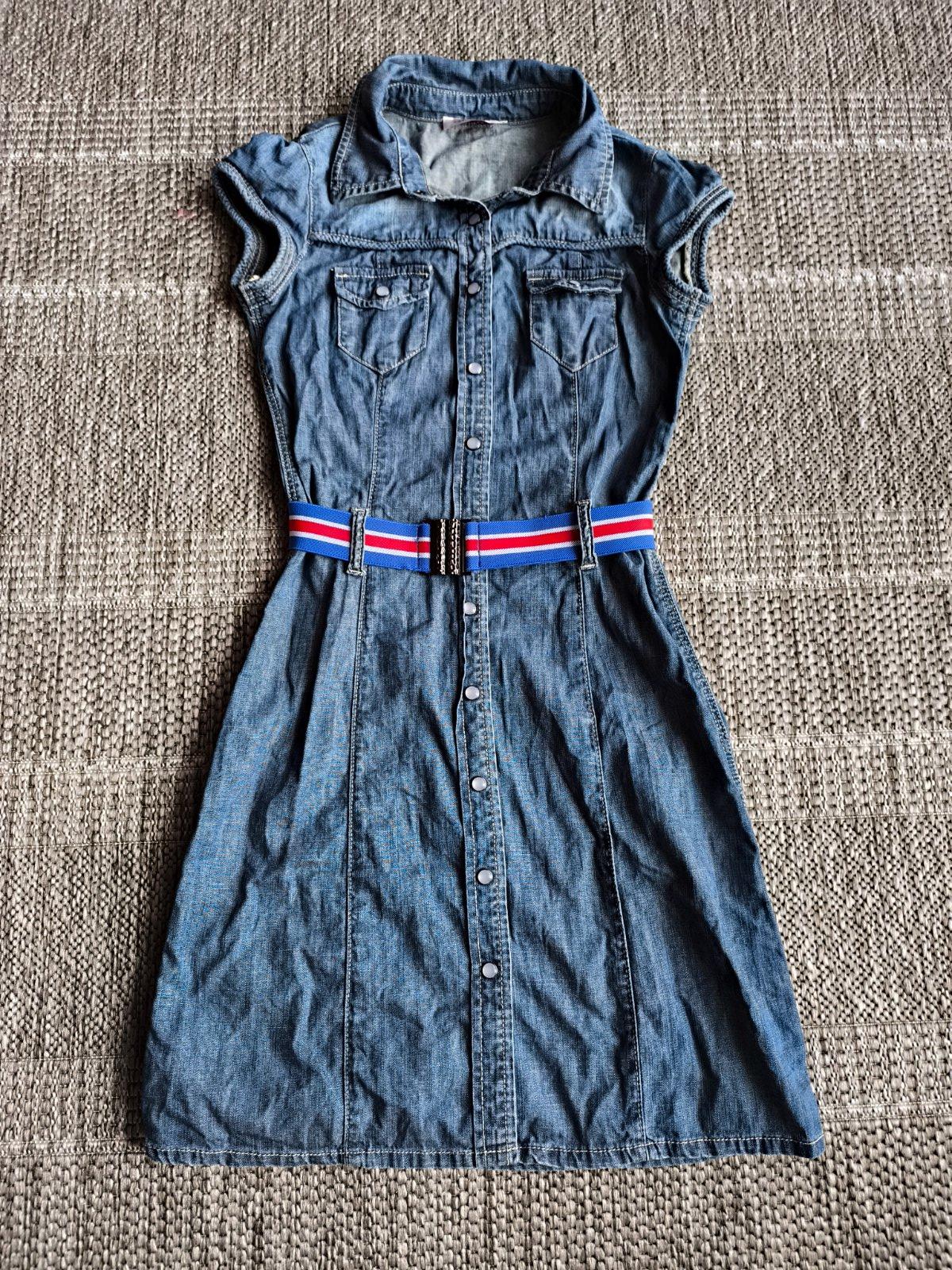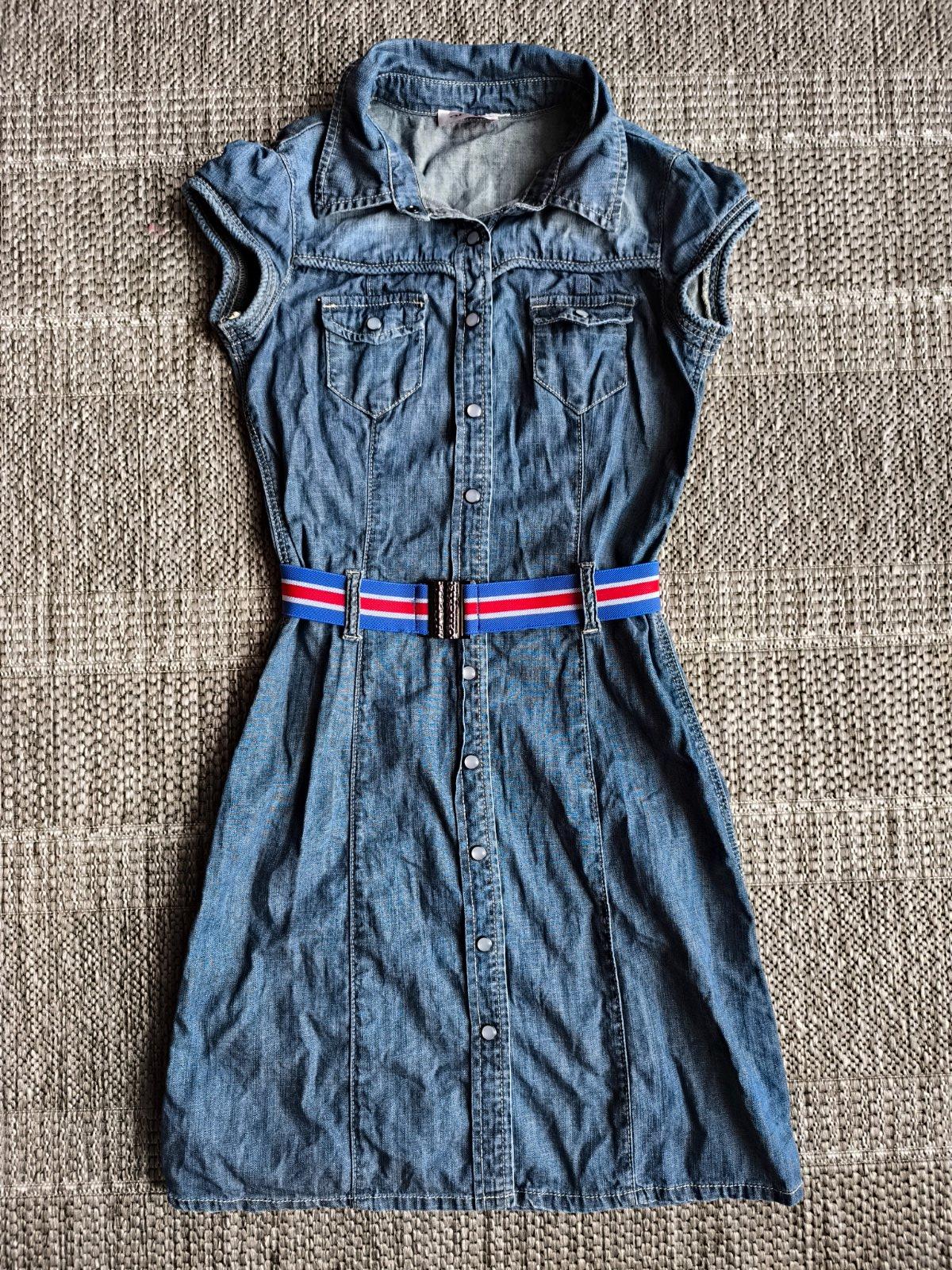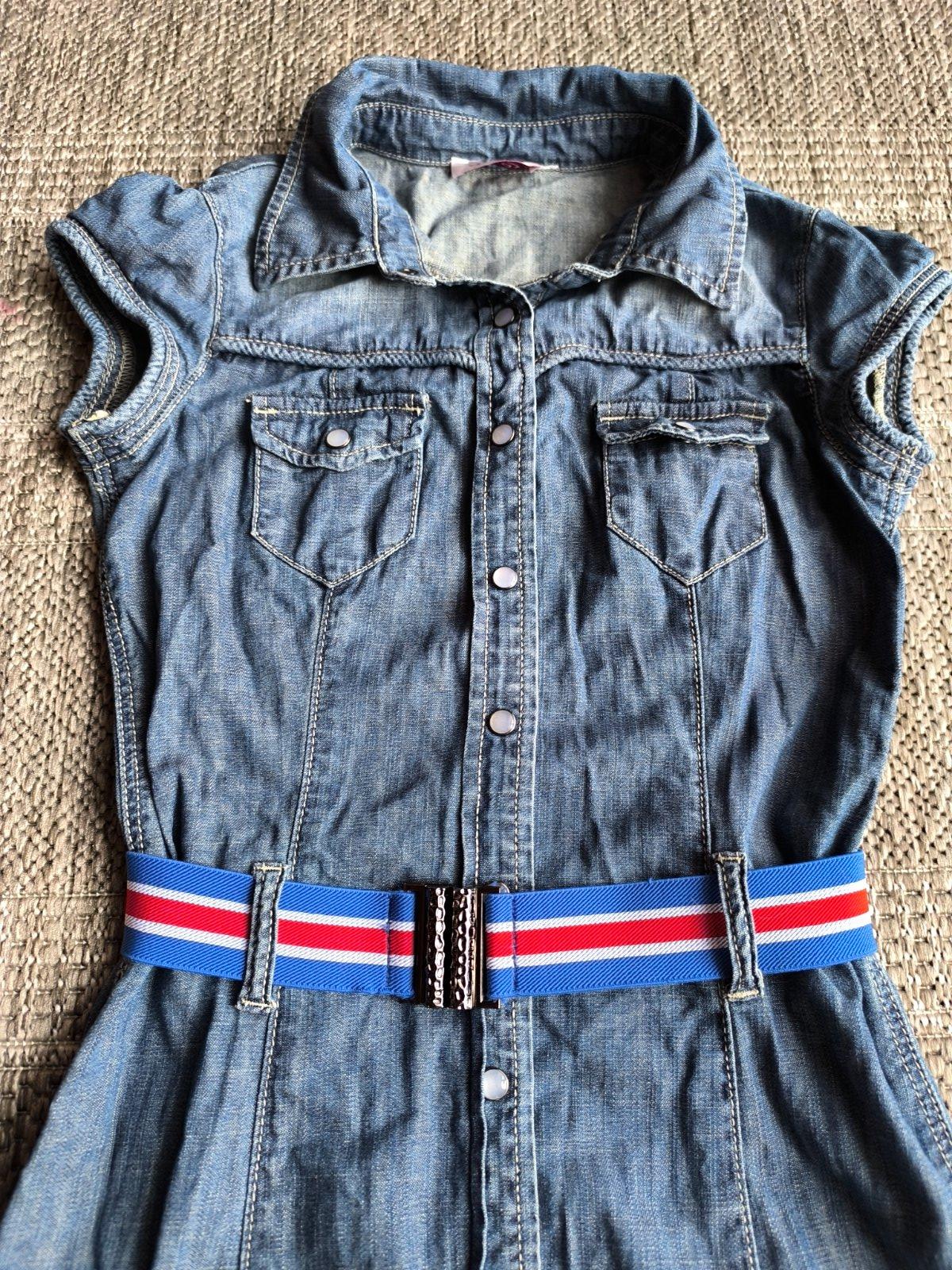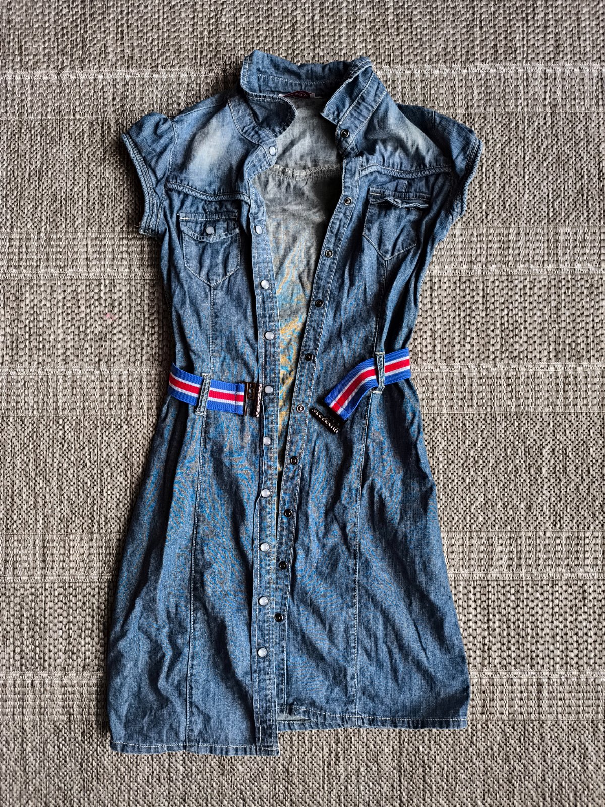 Krátke šaty, celorozopínacie, s opaskom. Materiál je jeansovina, rifľovina, 100% bavlna. Veľkosť 34/36, ale vhodné cca od 10 rokov aj pre teenagerky. Dajú sa nosiť celoročne. V lete samostatne, v zime napríklad na rolák a pančušky, vyzerá to super. Sú vo veľmi dobrom stave. Dľžka 90cm, šírka cez hrudník 40cm, v páse 36cm, cez boky 45cm.