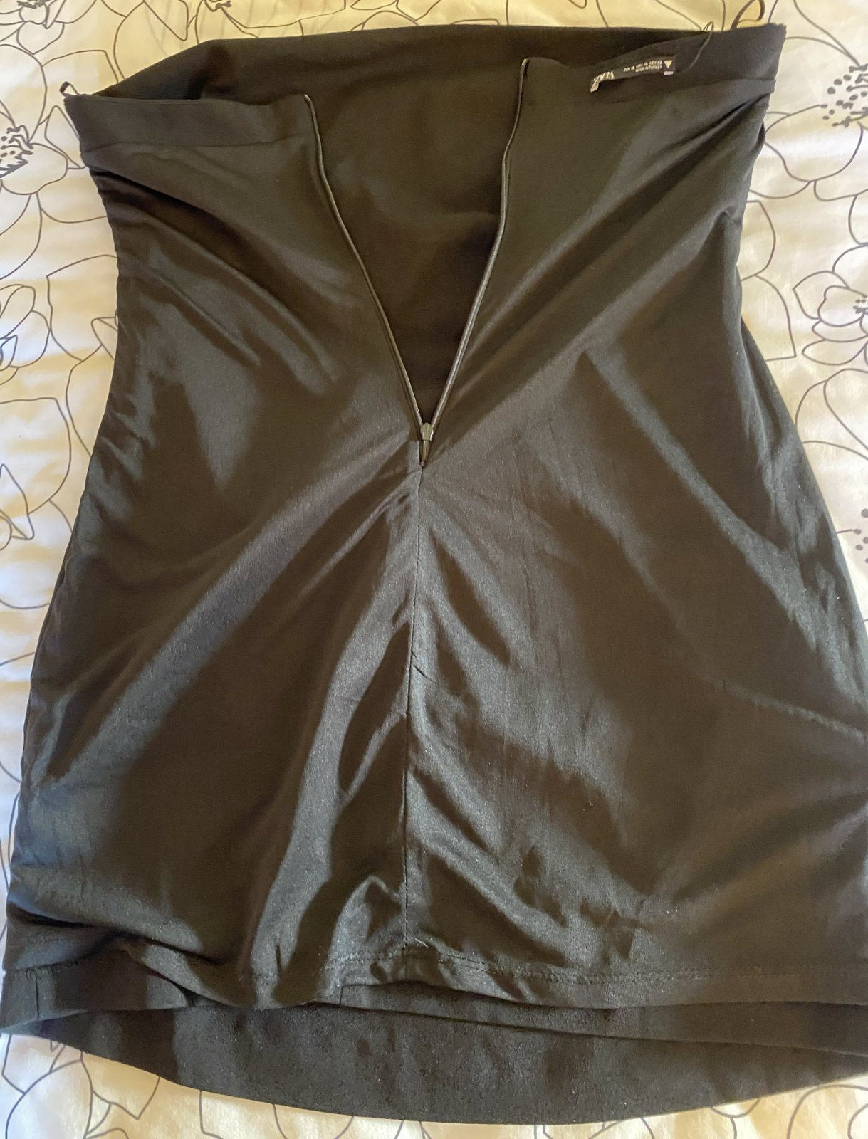 Podšité šaty Zara - predĺžený top bez ramienok, písaná v. XL, dávam L/XL - premerajte, kupované bez skúšania, pre nás malé - nenosené, iba osprchované a vyskúšané, sýta čierna farba, z vnútornej strany celé podšité, na zadnej strane vrchná časť cez stred zips dĺžka 30cm, materiál vonkajšia časť: 97% polyester, 3% elastan, materiál vnútorná časť - podšívka: 100% polyester. Miery merané v kľude: dĺžka vpredu cez stred: cca 77cm, dĺžka cez stred zadná časť v mieste zipsu: 65cm, šírka vrchná časť: 46cmx2, šírka zúžená časť: 43cmx2šírka, spodná časť: 56cmx2.