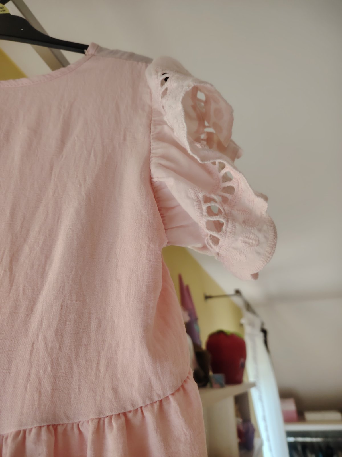 Veľmi dobrý stav! Dievčenské šaty s krátkym rukávom a potlačou Barbie, tylová sukňa s lesklými striebornými srdiečkami, farba svetlo ružová, okrúhly výstrih, elastické, pás na gumu, materiál 100% b...