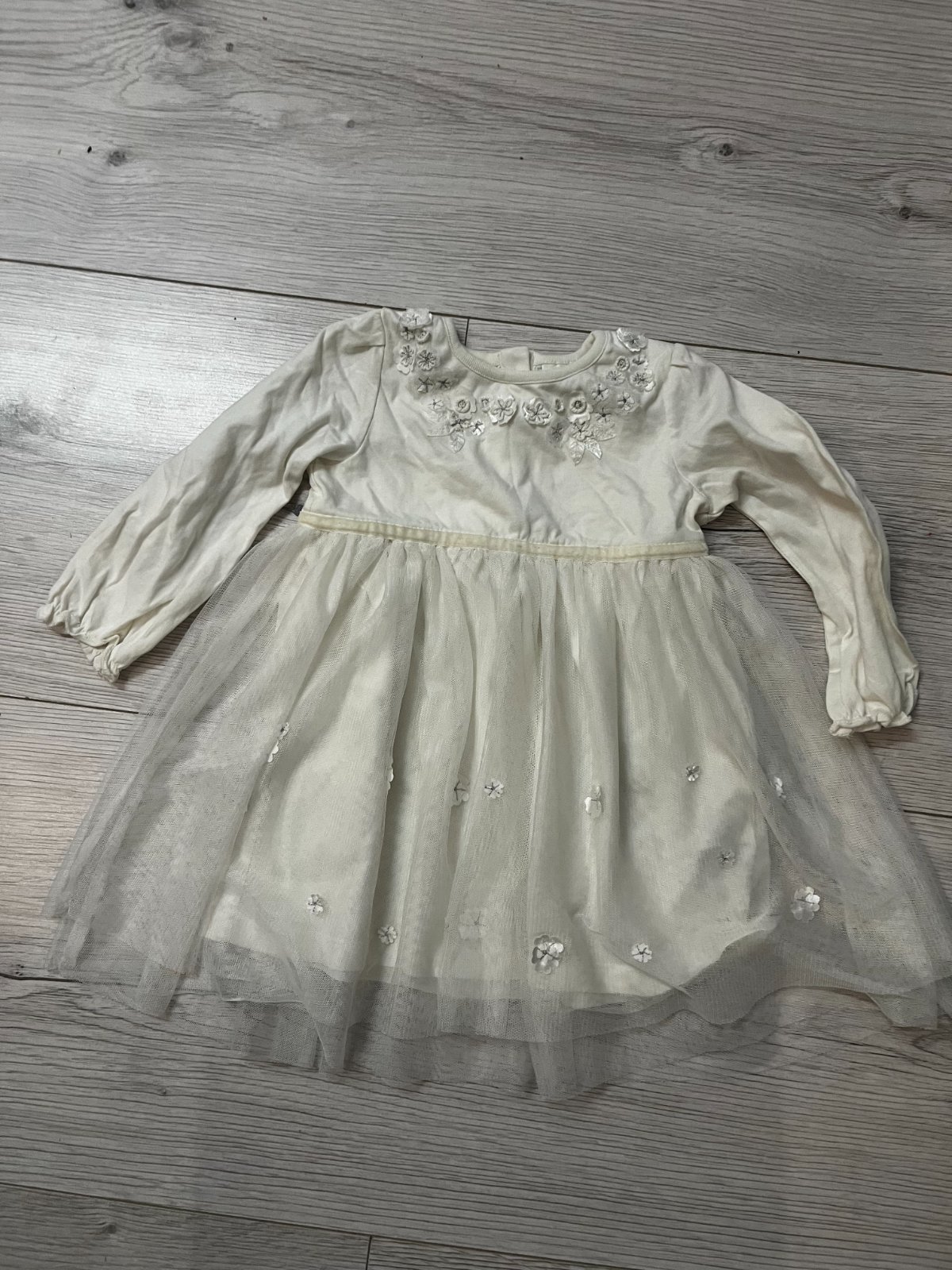 Predám biele slávnostné šaty s dlhým rukávom a tylovou sukňou značky Next, veľkosť: 80 (9 - 12 mesiacov)