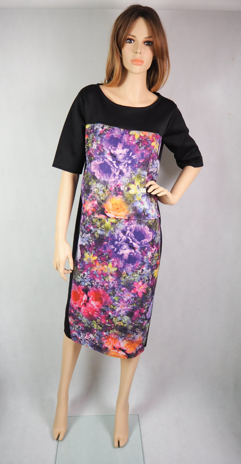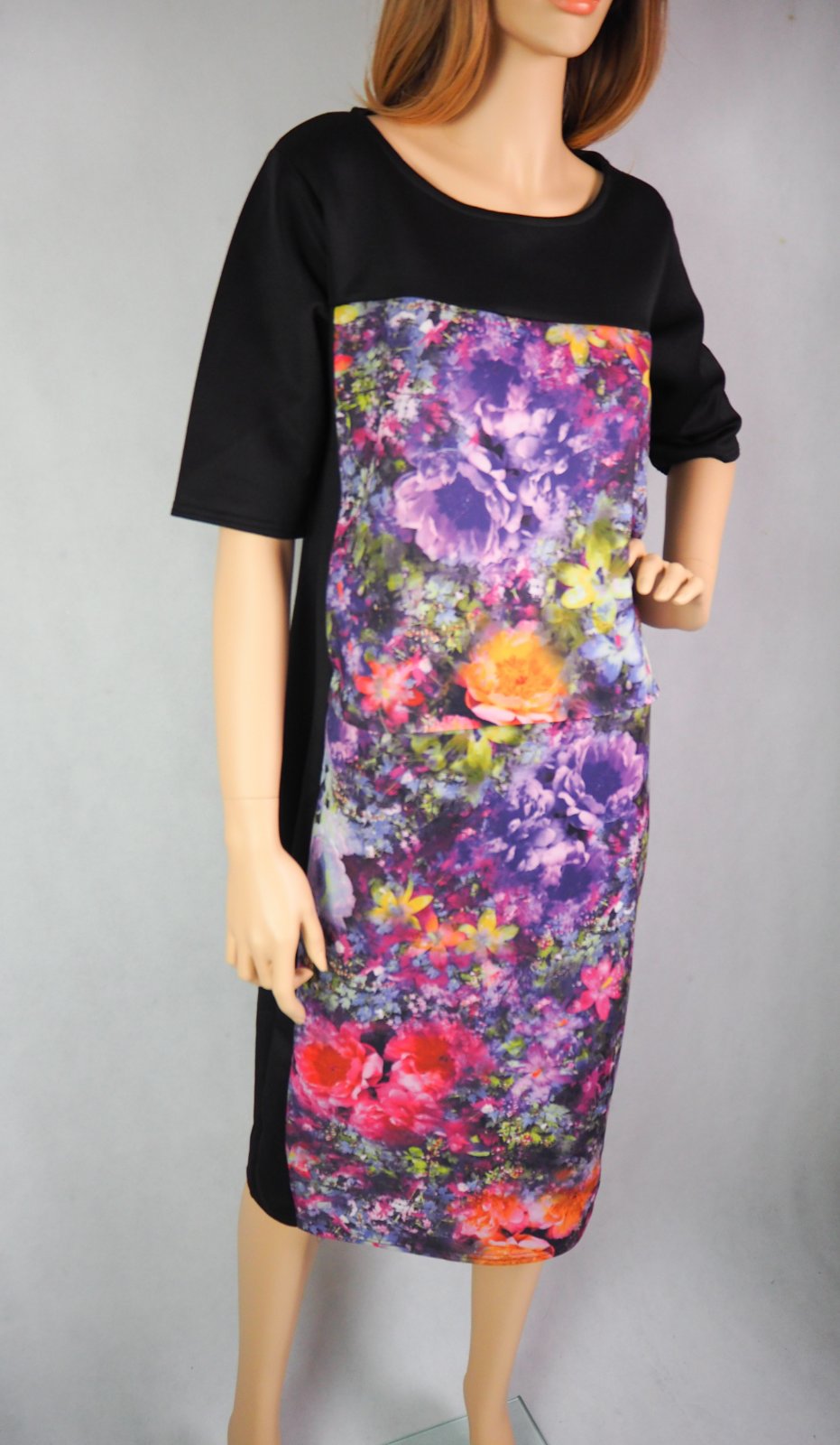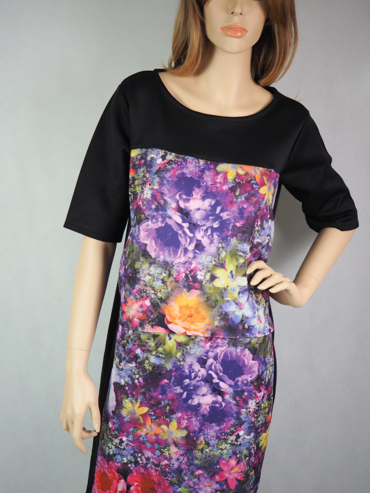 Kvalitné čierne šaty s farebným predným dielom, stredne hrubý materiál 100% polyester, super stav.