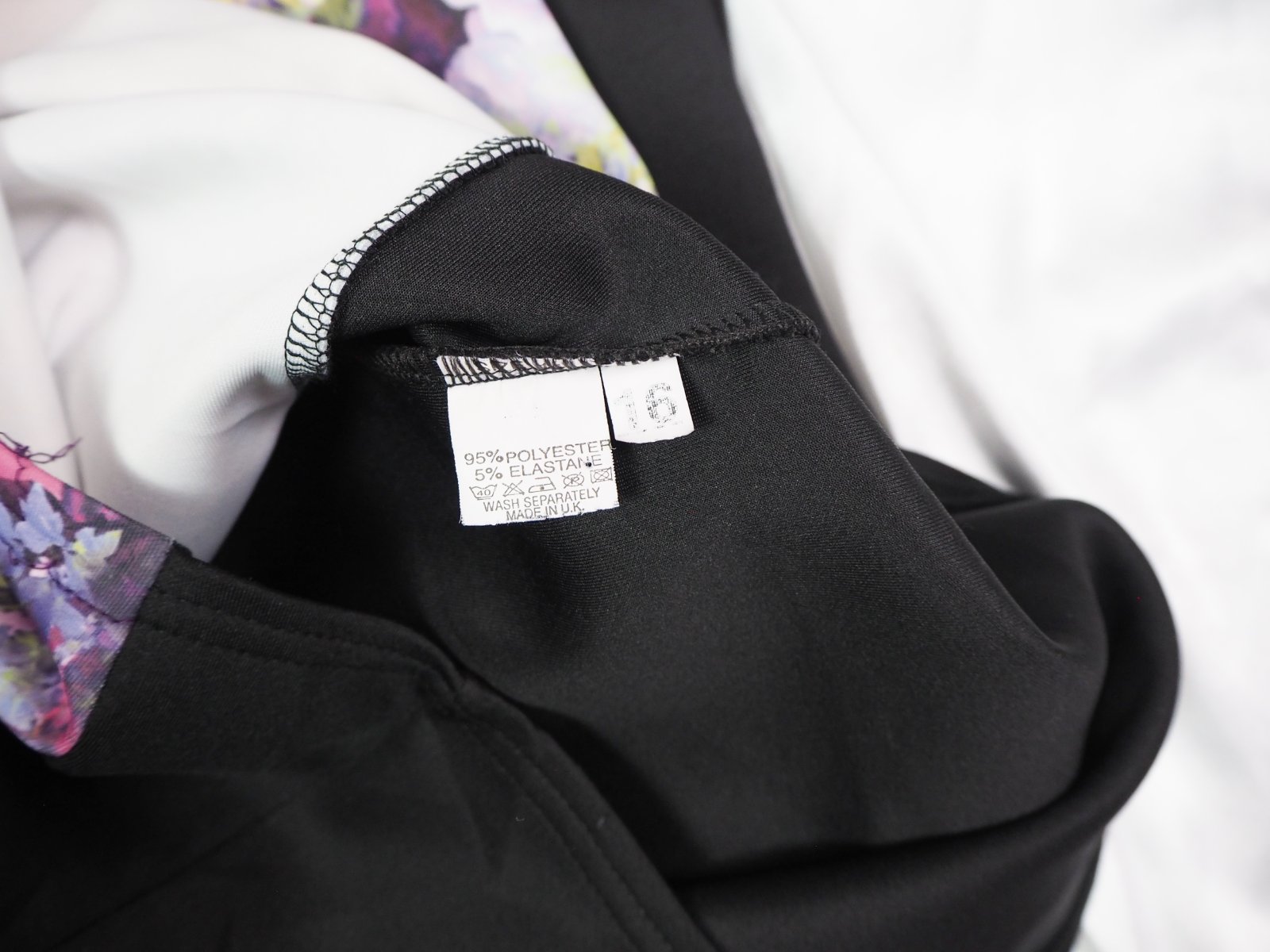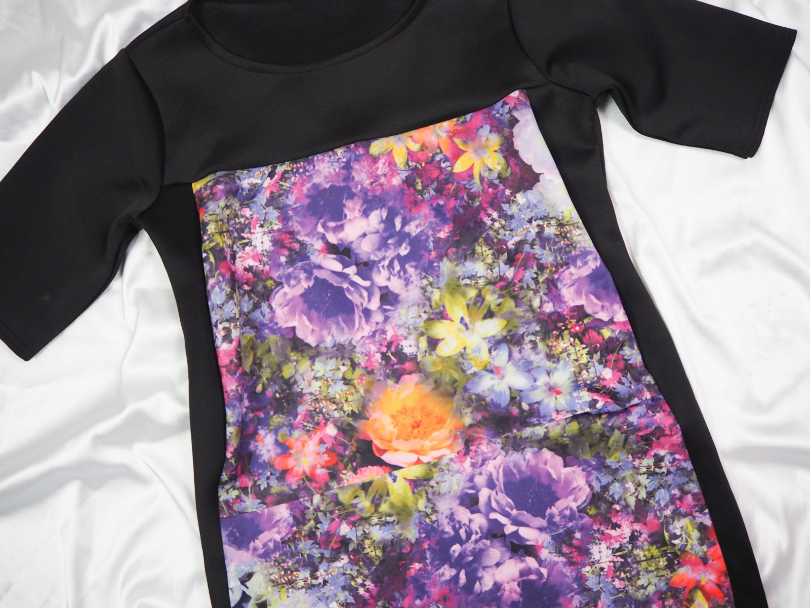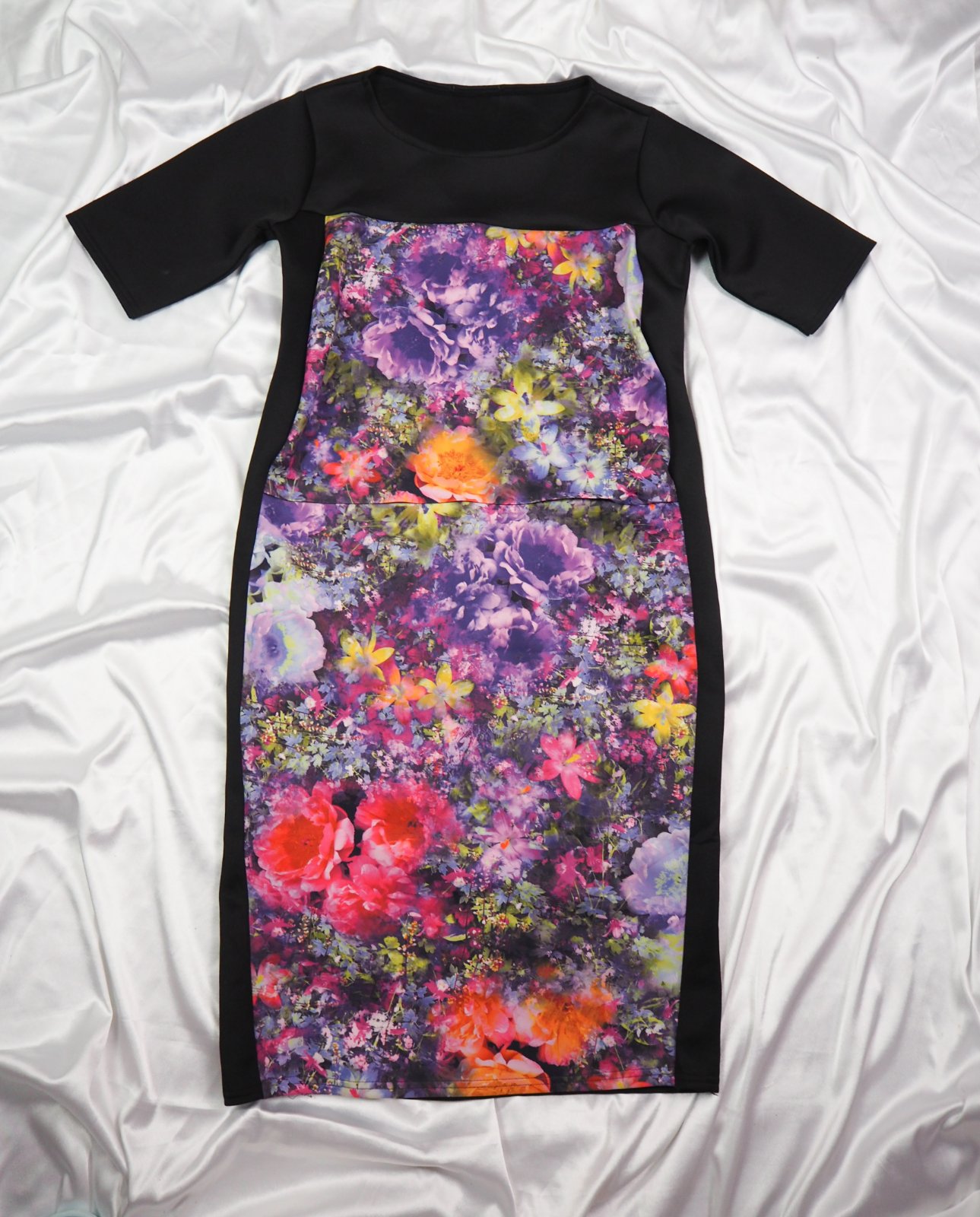 Kvalitné čierne šaty s farebným predným dielom, stredne hrubý materiál 100% polyester, super stav.