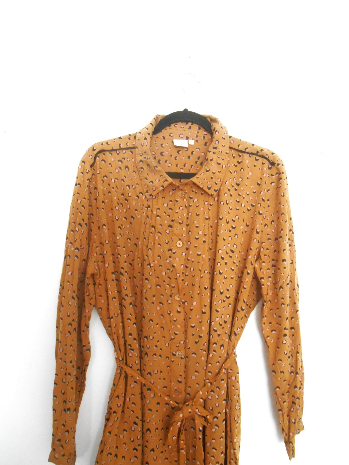 zachovalý stav, 100% viskóza, hnedá farba, zapínanie na gombíky, opasok, v hornej časti protizáhyby, dve otvorené vrecká, voľný strih, vhodné aj pre tehuľky