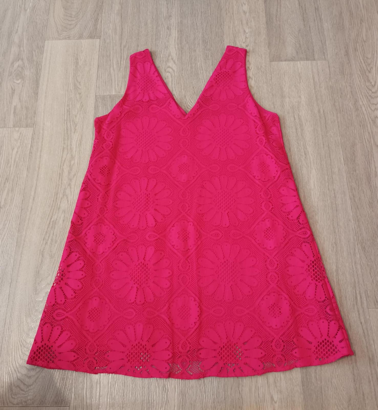 Pekné čipkované šaty zn. Desigual, veľ. XL, ružovej farby, s podšívkou, materiál PAD + elastan, dĺžka 90 cm, cez prsia 2x 51 cm, výborný stav.
