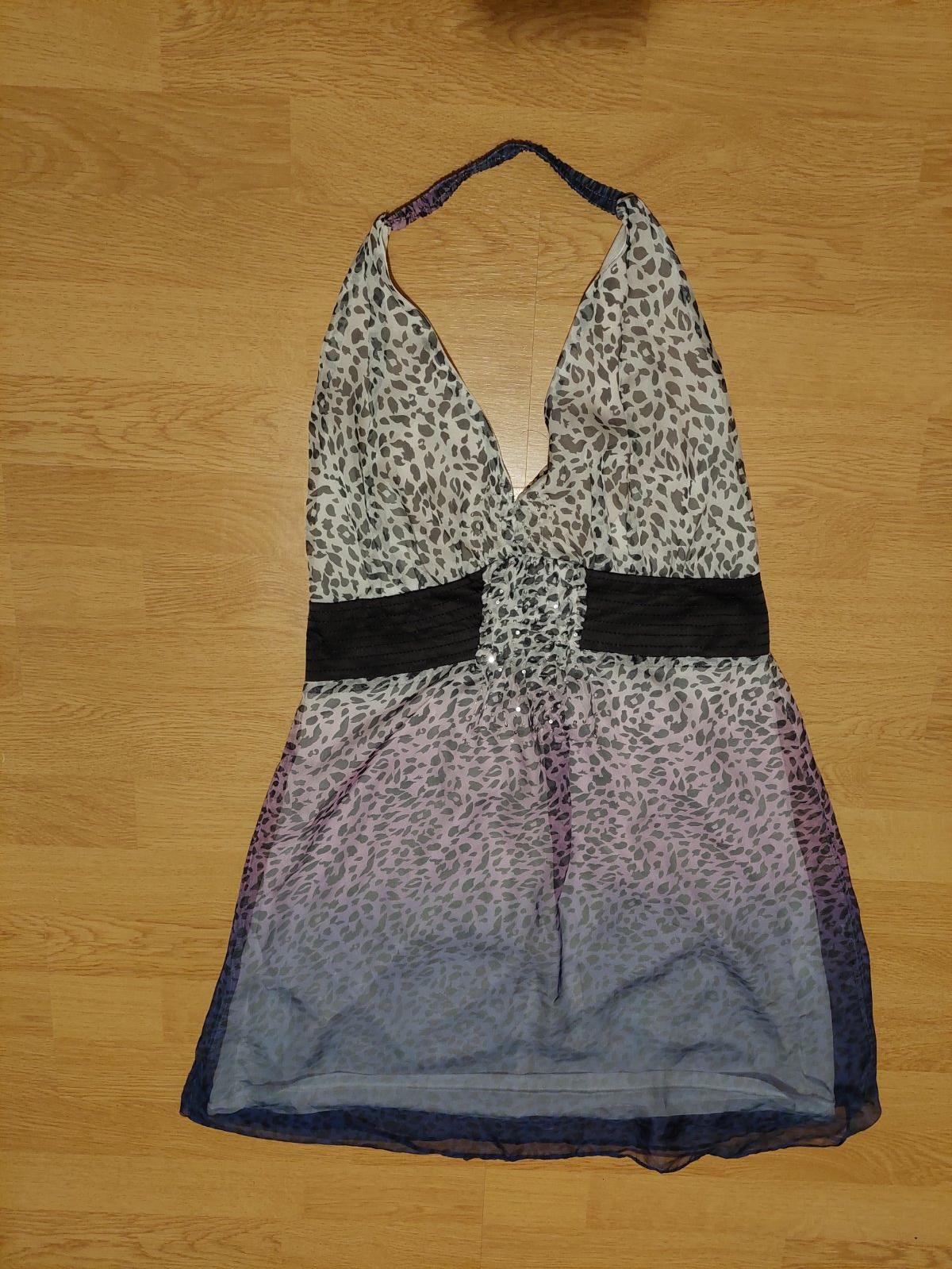 Farba prechadza z fialovej do modrej. 1x oblecene. Vzadu je elasticky pas takze cez prsia su prisposobitelne. Podsite,nepresvitaju.