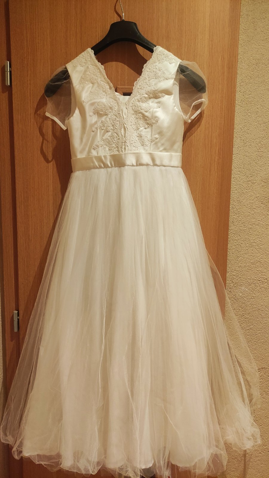 Šaty na prvé sväté prijímanie z bieleho saténu. Spodok šiat je vyrobený z bavlnenej podšívky, dodatočne zakončenej tylom. Krásna aplikácia ukončená perlami v páse. Krátke rukávy. Dlhé členkové...
