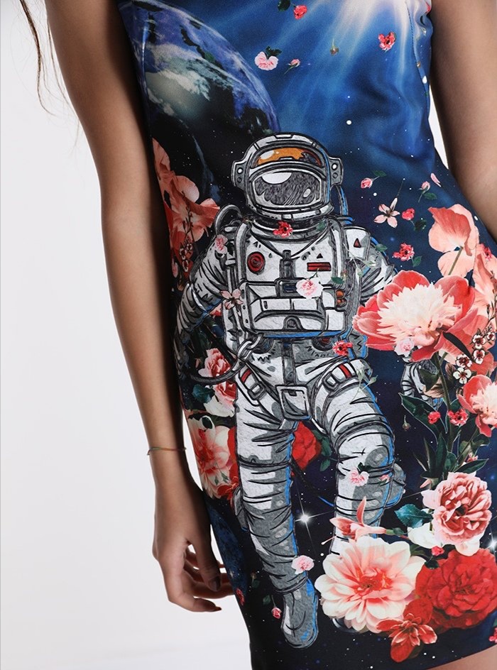 Nové, nenosené šaty s motívom kozmonauta vo vesmíre doplneným kolážou ruží. Nezvyčajné, zaujímavé, hravé, vhodné pre dámu, ktorá sa nebojí zaujať. Veľkosť M. Materiál: 95% polyester, 5% elastan. Šaty sú z pevného materiálu, veľmi precízne a kvalitne šité, vyrobené a dovezené z Talianska.