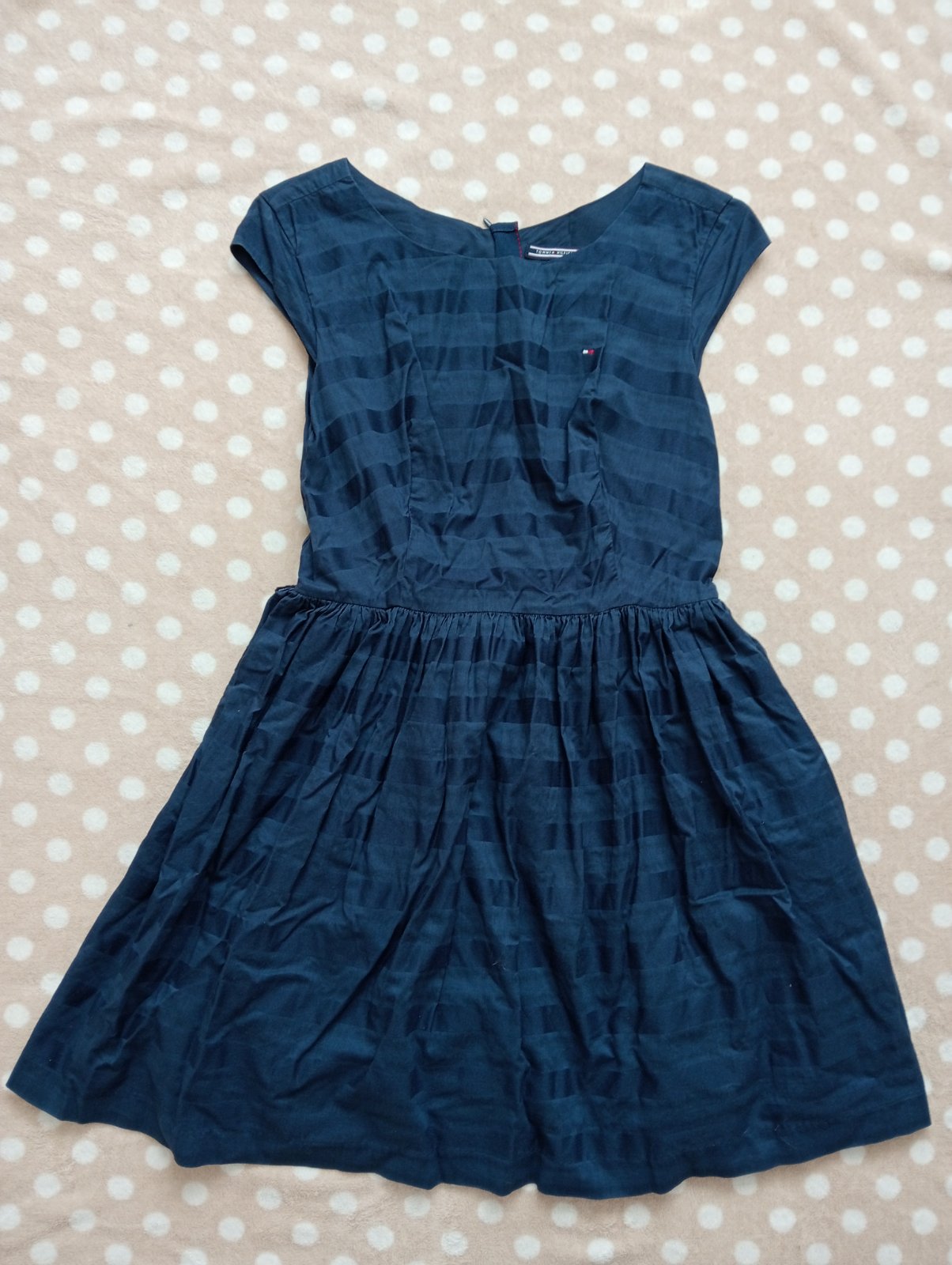 Predám šaty zn. Tommy Hilfiger vo výbornom stave. Kupované na MK, oblečené na jednu príležitosť. Bavlnené so spodničkou, dve funkčné vrecká po bokoch, zapínanie na zips vzadu. Majú pútka na opasok, ale žiadny k nim nebol. Pásikavý vzor, pekne sa na svetle lesknú. Dĺžka 80 CM, šírka v páse 34 CM, šírka plecia 38 CM. Bez poškodení.