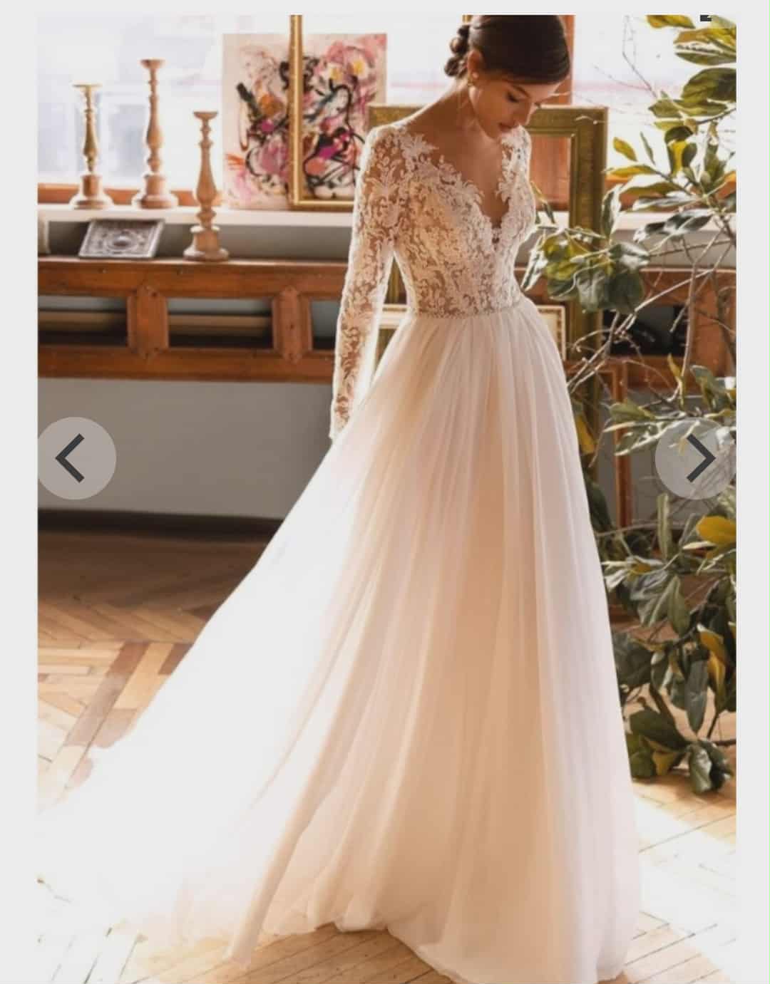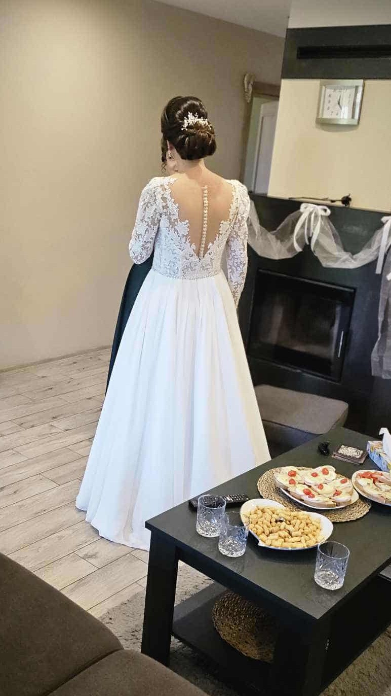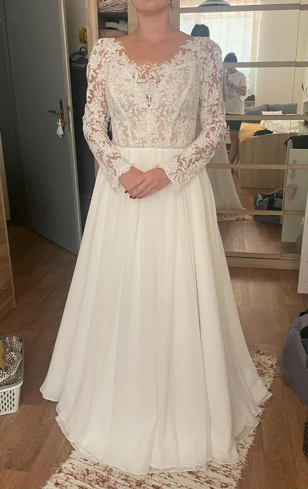 Krásne svadobné šaty Jasmine Empire, veľ. 38 - 40. S kruhom a dlhým závojom. Majú krásny chrbát na gombíky. Šaty sú ľahké a pohodlné, čipkovaný rukáv vhodný na jesennú / zimnú svadbu.