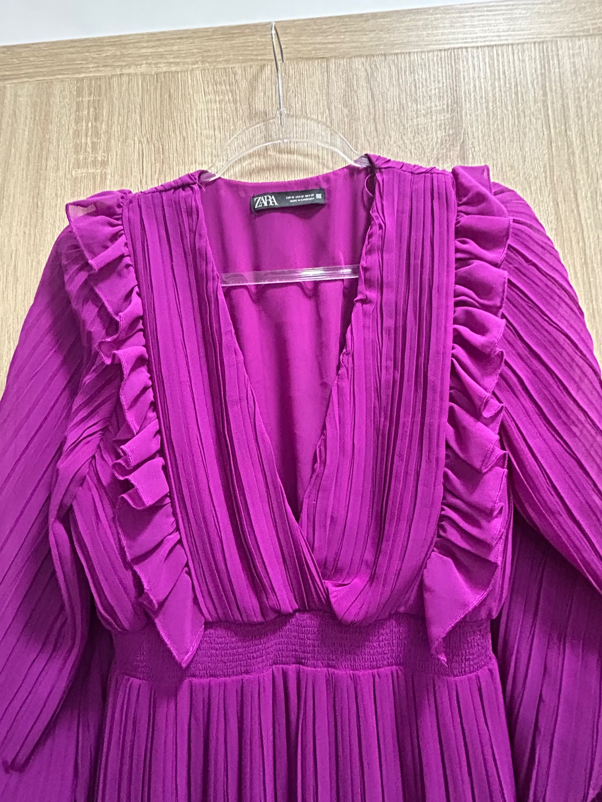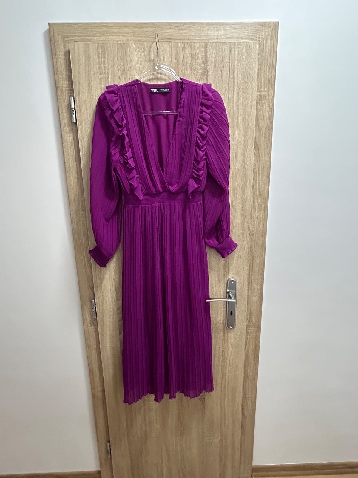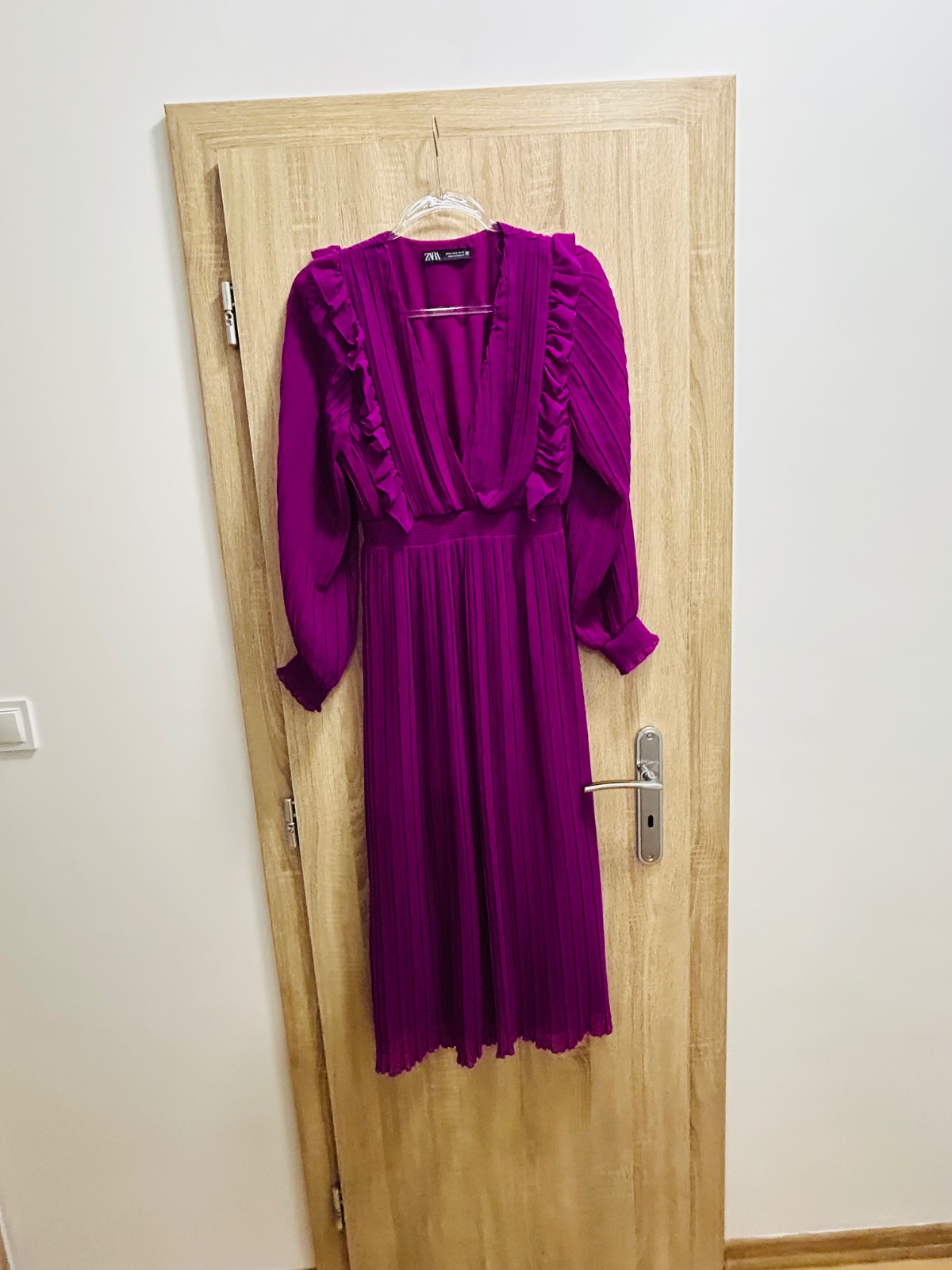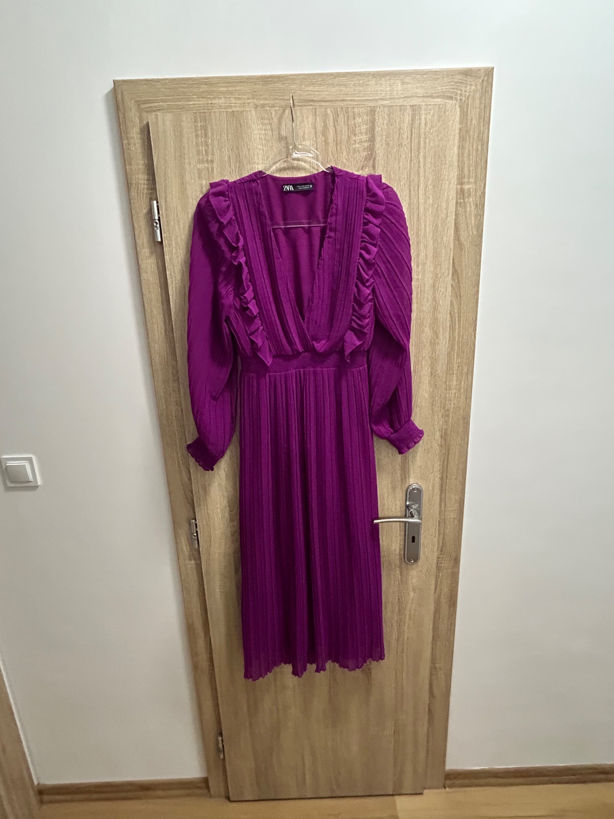 Raz oblečené šaty v top stave. Rukávy nariasené po bokoch , dlzka od ramena 33cm, šírka pod pazuchami 47cm, pas 2x 39cm, dolu šírka 69cm, dlžka 86cm Nekrčia sa, držia tvar, vzadu je zips, strih do ...