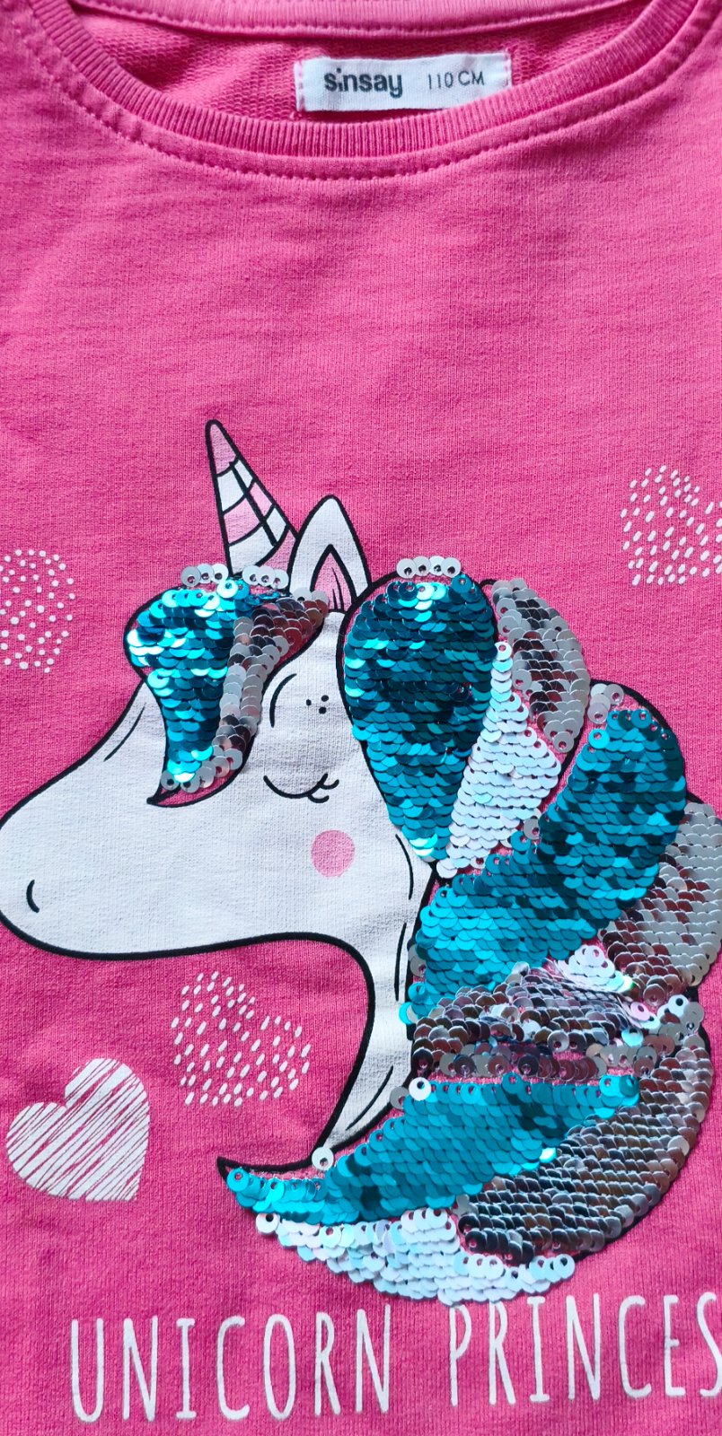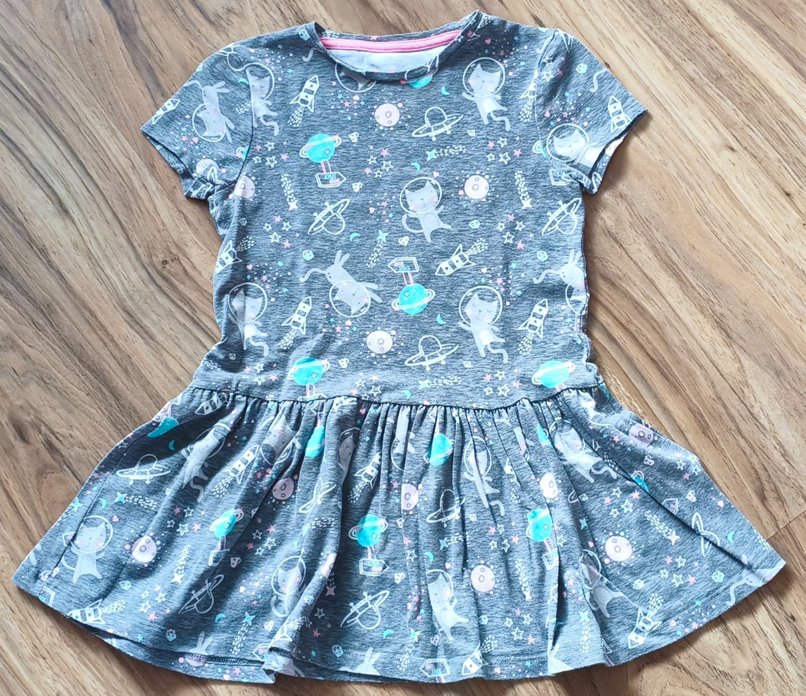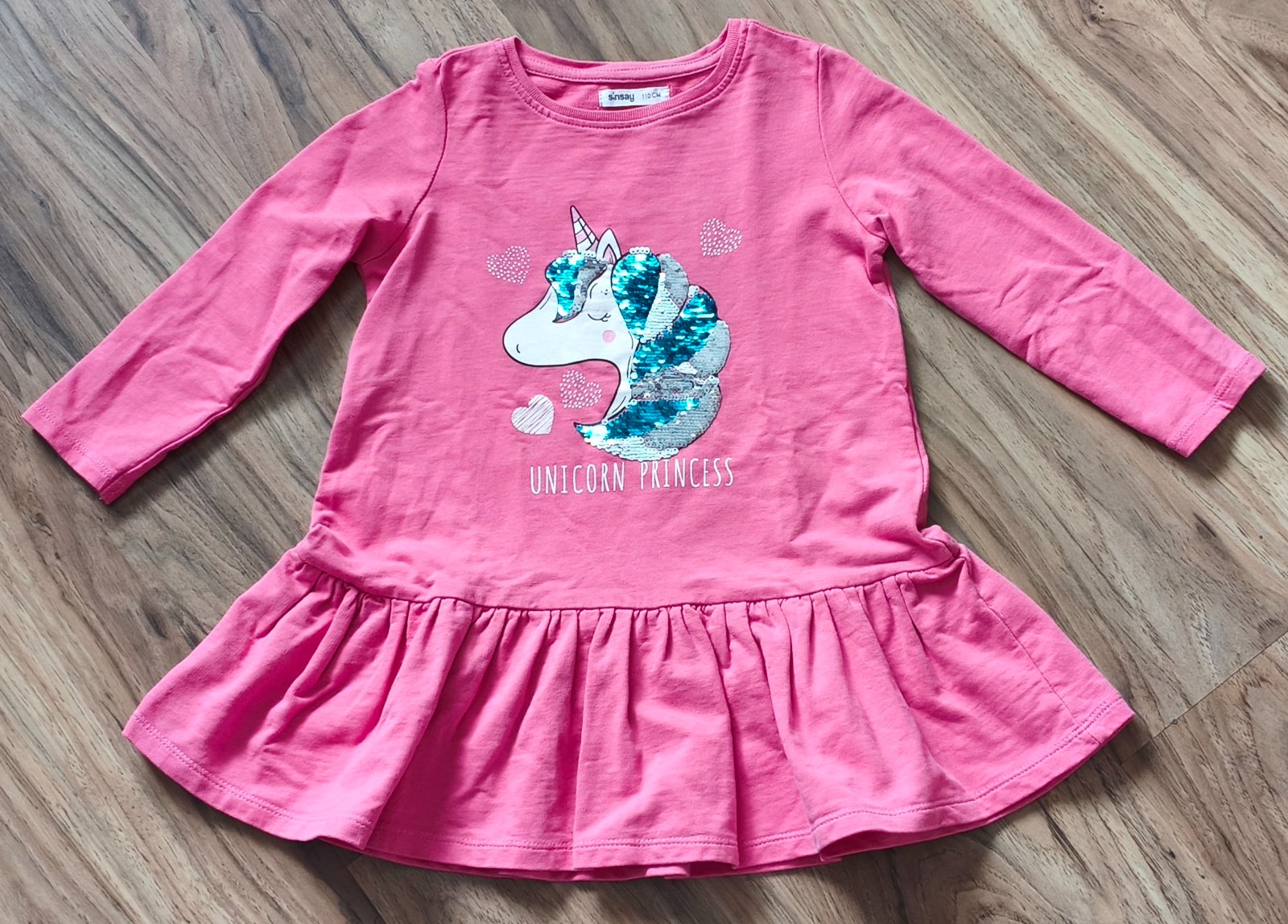 Inzerat je AKTUALNY!!! Tričkošaty, top stav, velkosť uvedená 110/116, dlžka 55 cm, šírka v podpazuší 2x 32 cm, rukáv od krku 42 cm. Kuk aj ostatné moje inzeráty, predávam po dcérke :-)