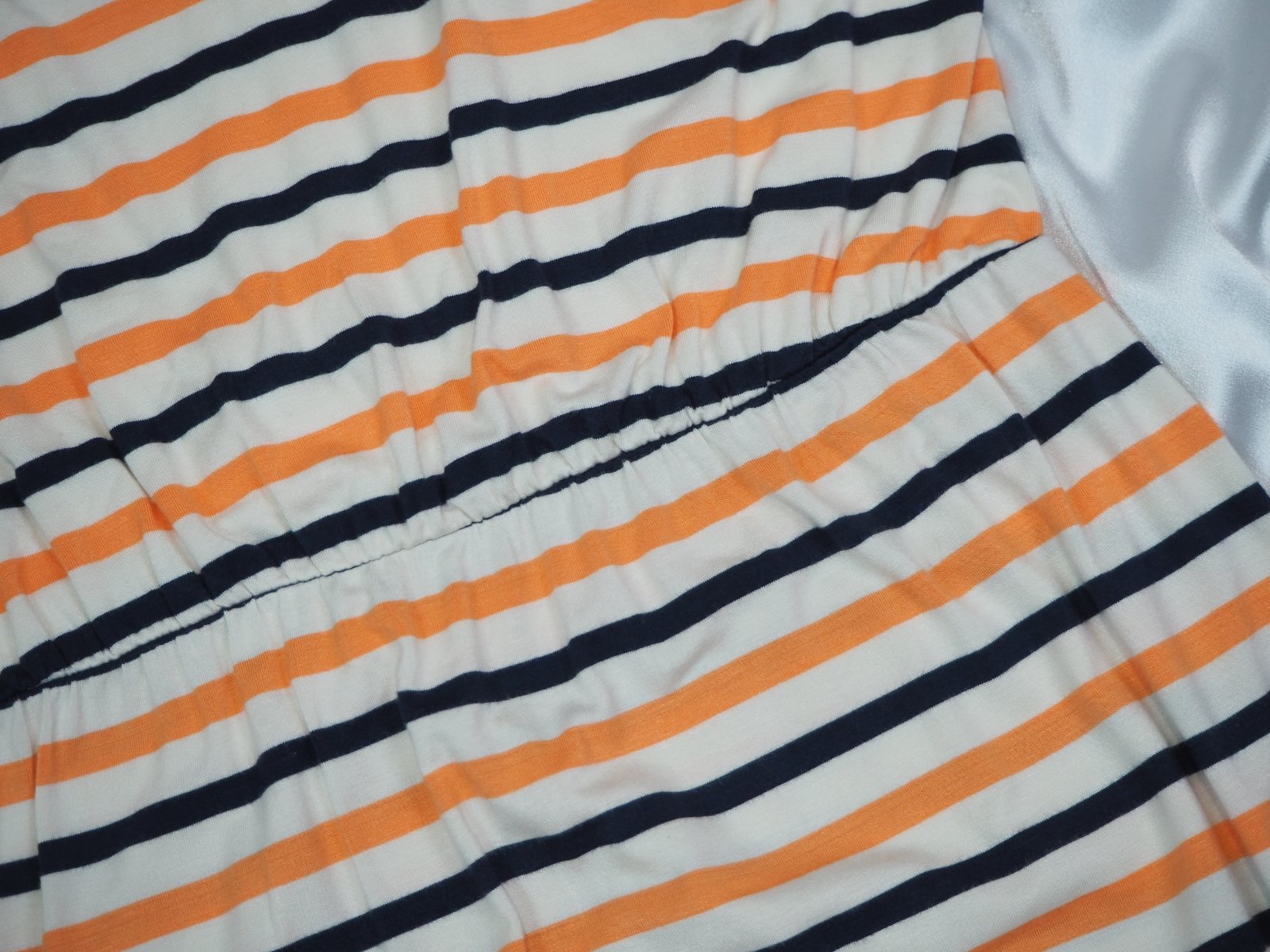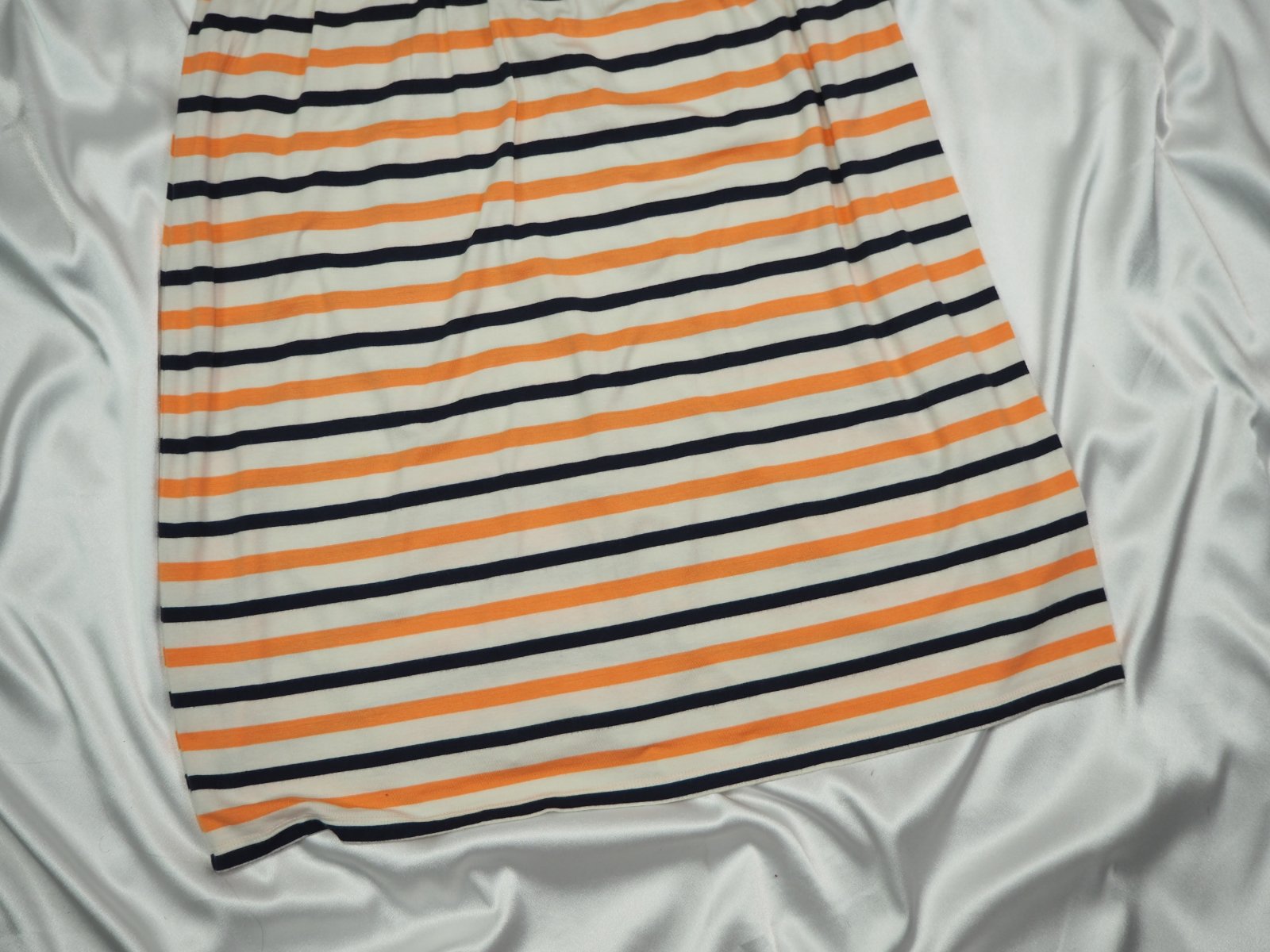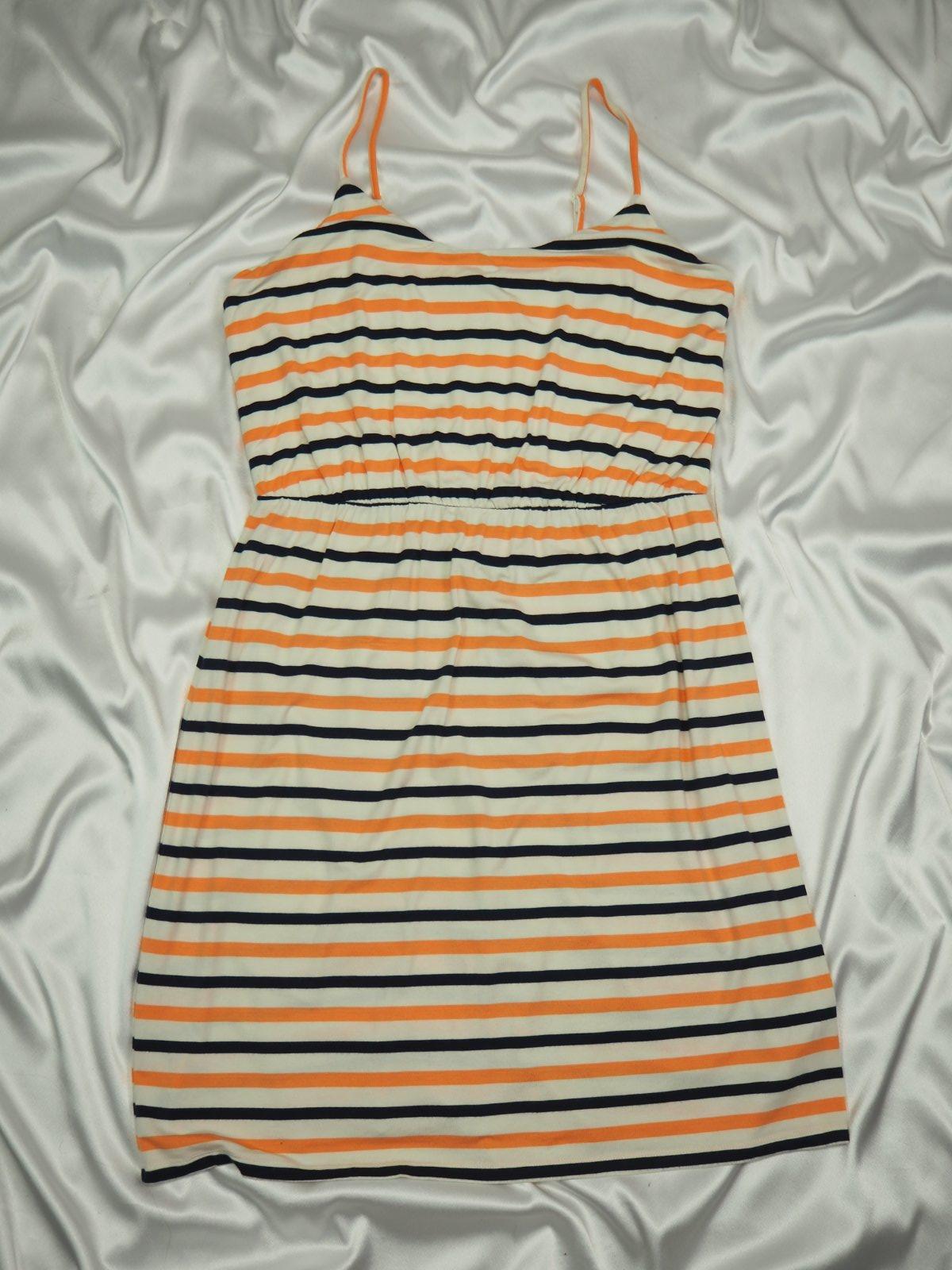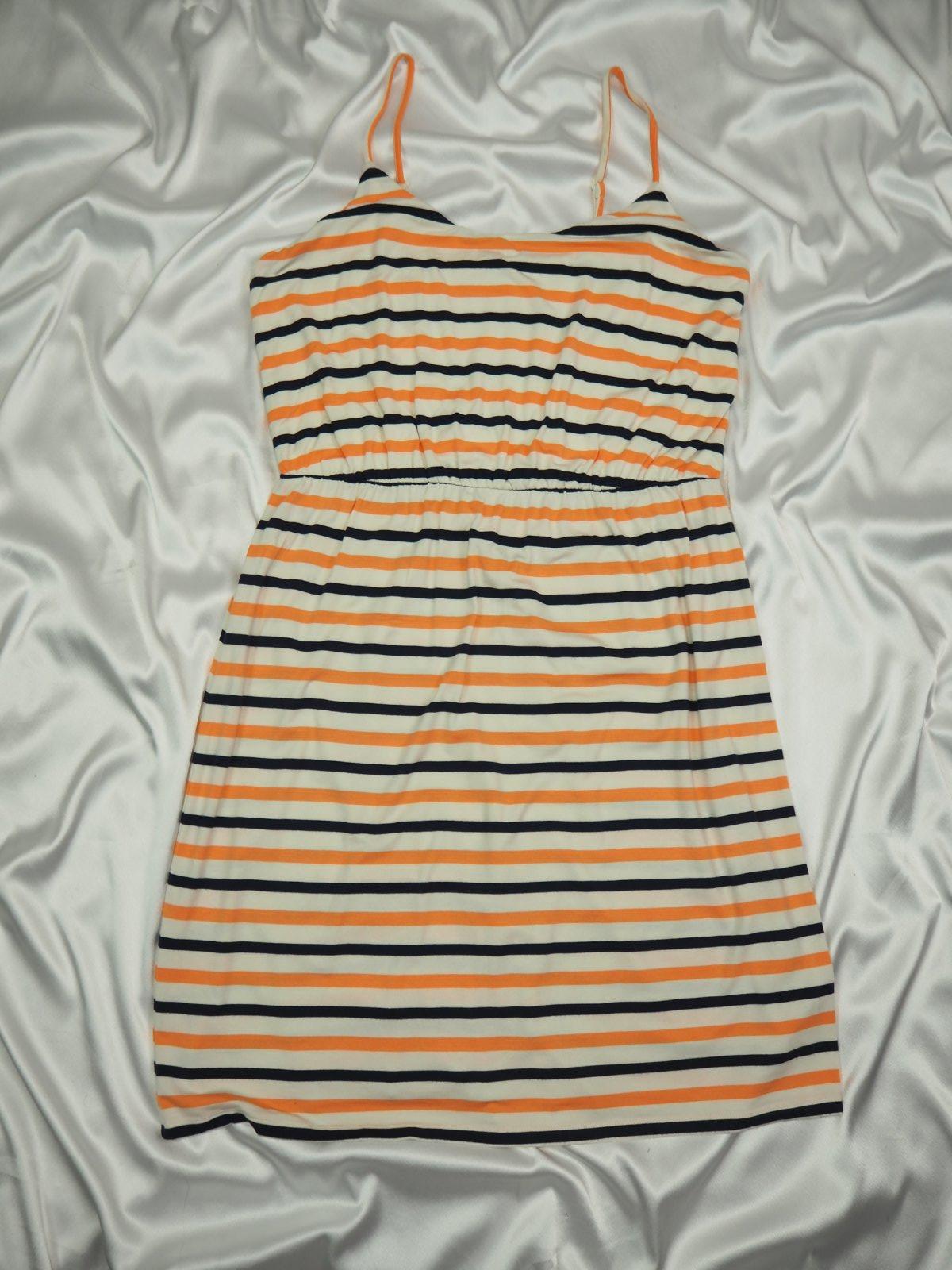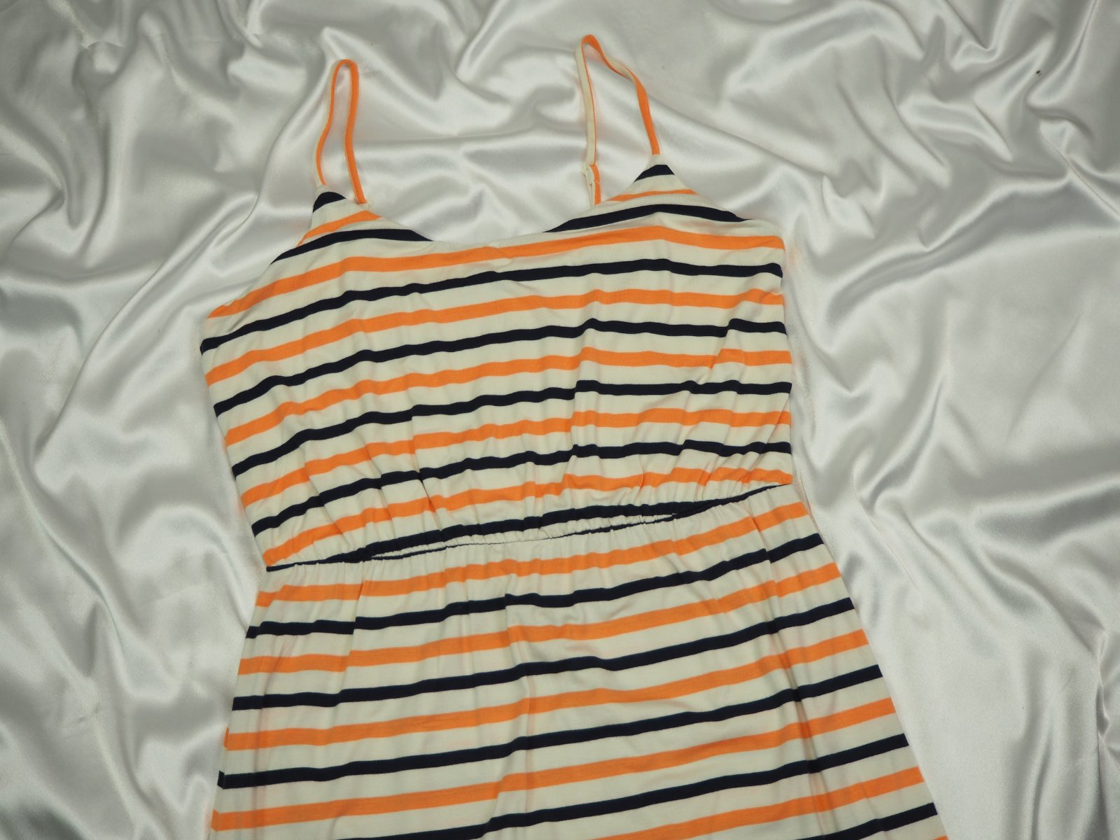 Kvalitné letné šaty, pásikované, bielo-oranžovo-čierny pasik, v páse gumka, materiál 95% viskóza, 5% elastan, super stav.