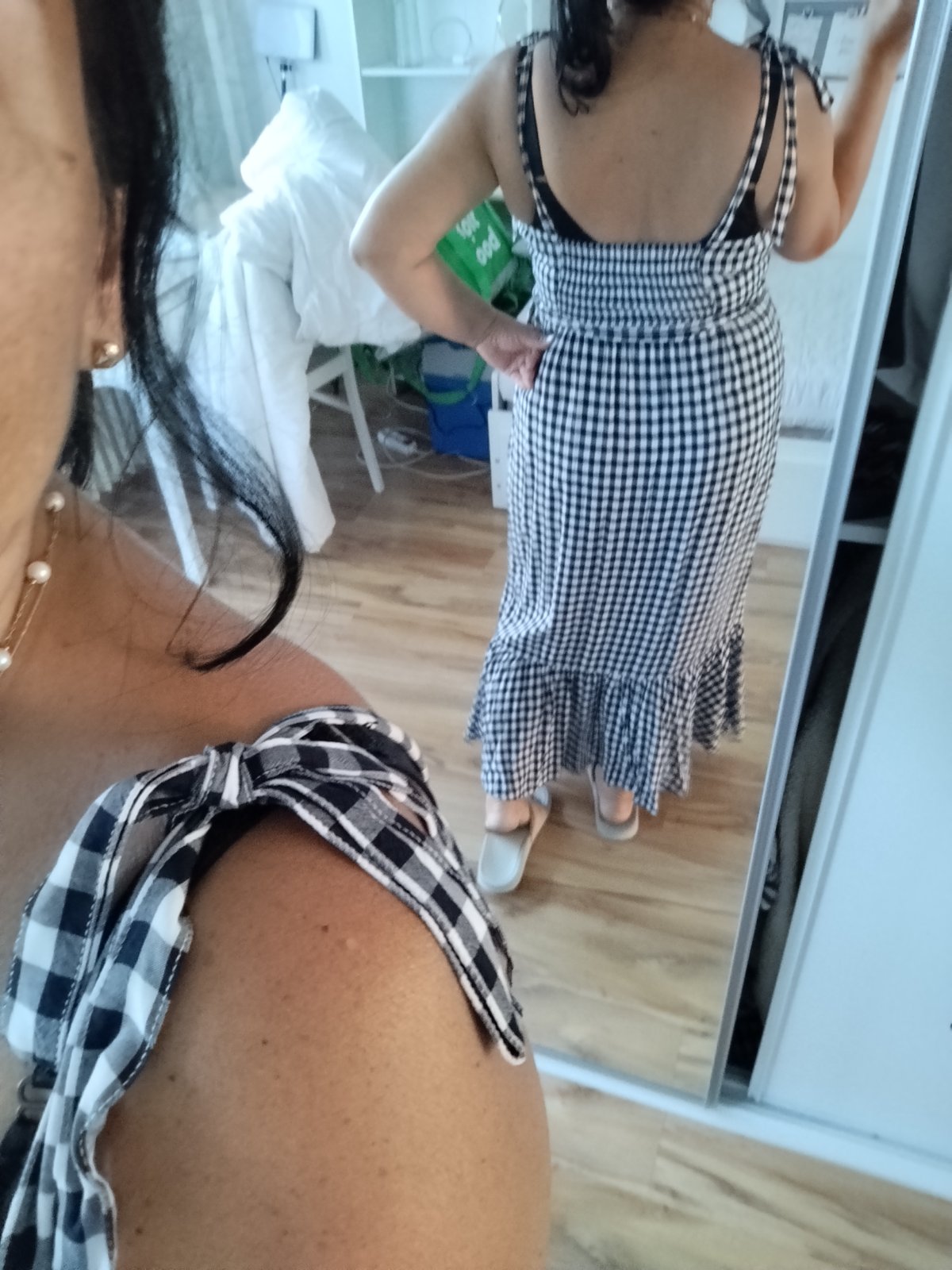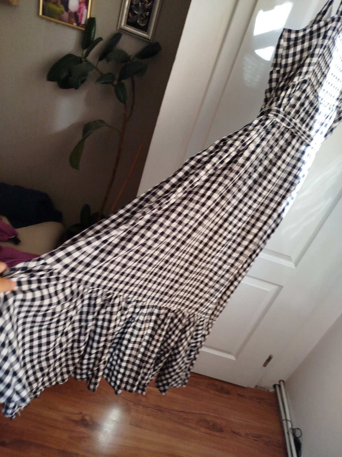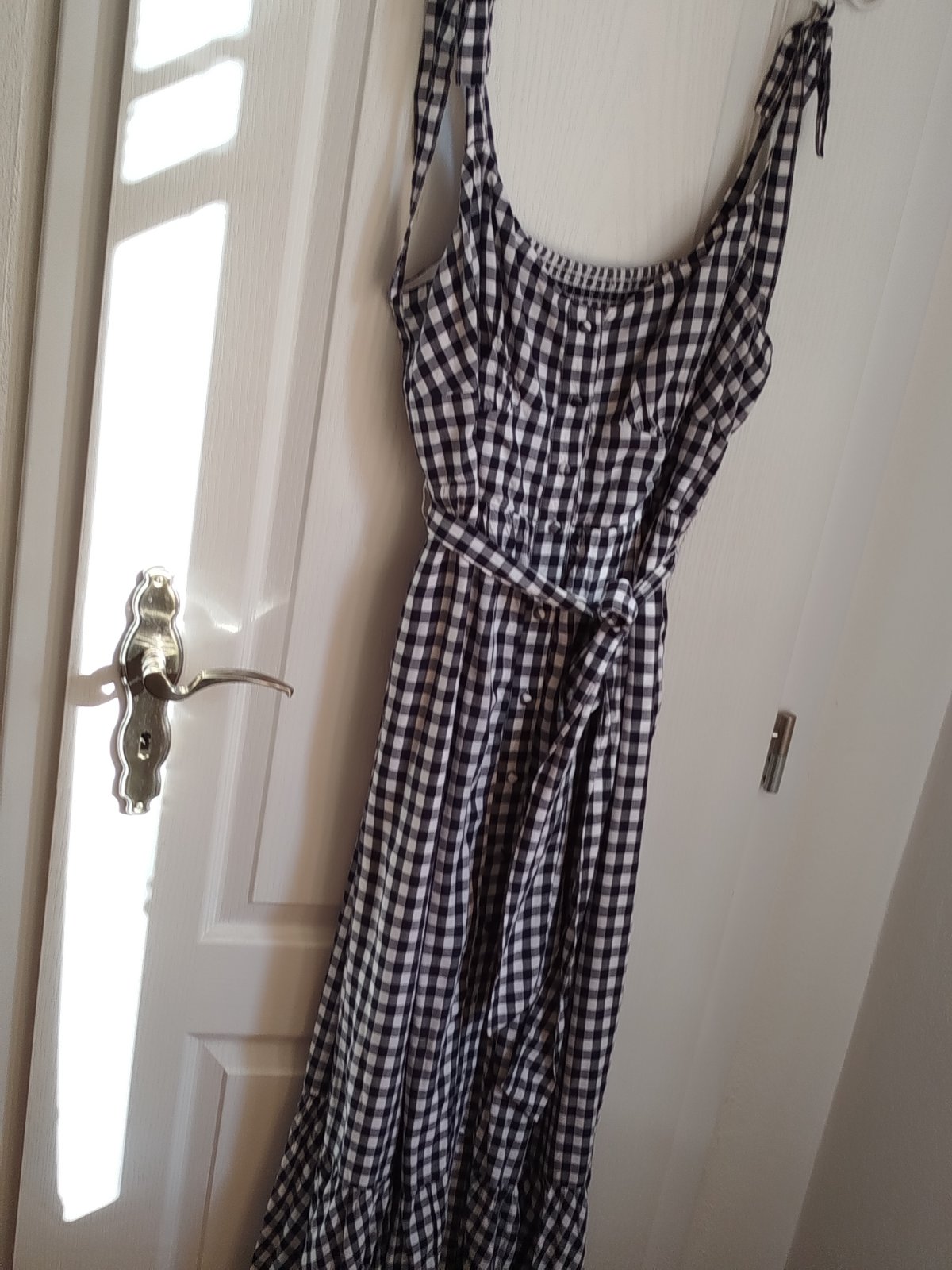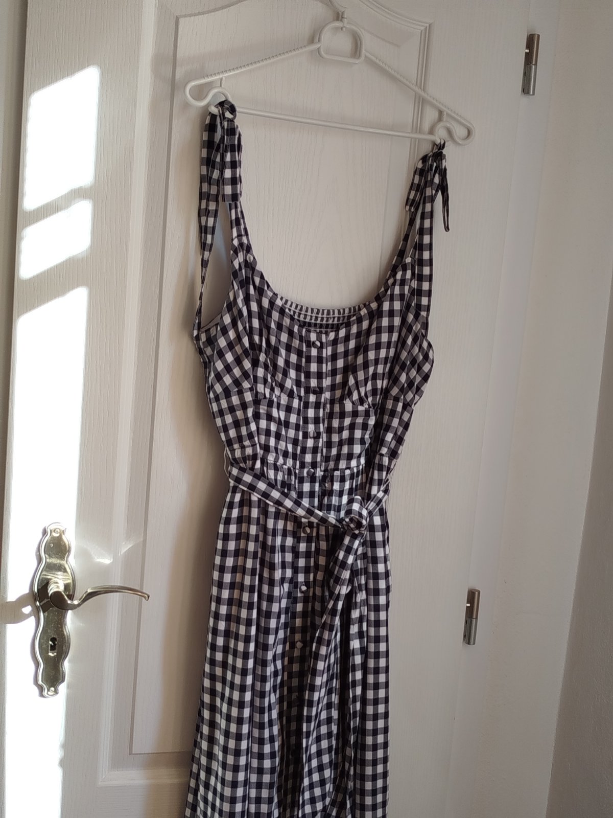 Krásne šaty podsite málo nosené bez poškodenia sú kvalitné padave ženské dole volán na ramenách mašle,dĺžka 140cm šírka pod pazuchami v kľude cca 50x2cm majú vzadu široké jemne gumky tak sa prispôsobia aj na 60x 2 cm pás 45x 2cm píšu c.12 sadnú aj na Xl