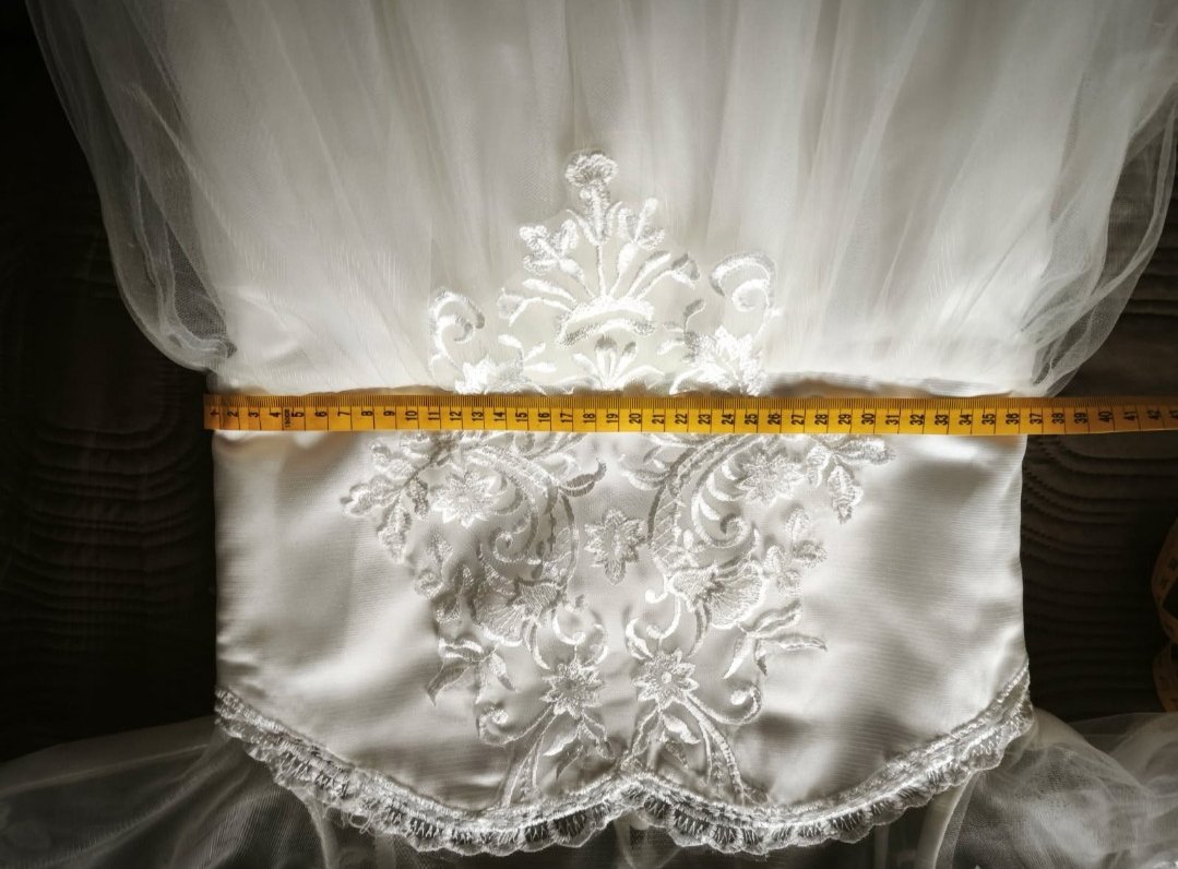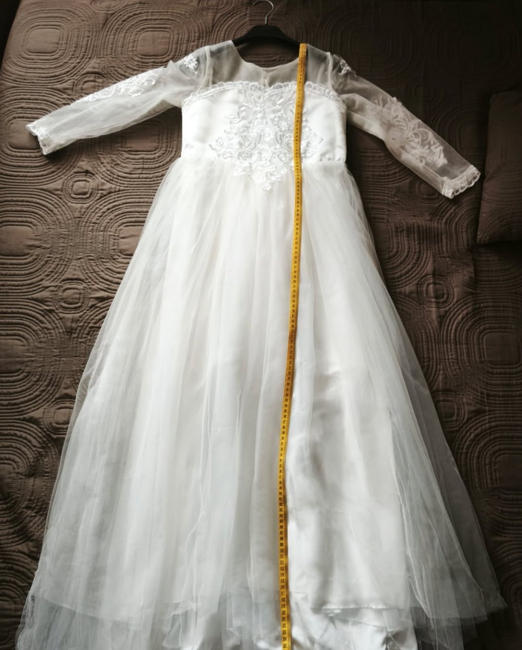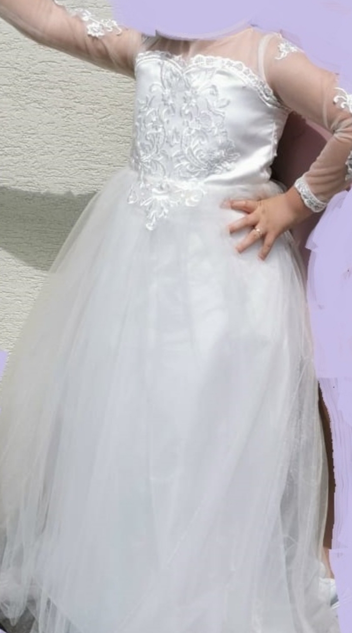 Slávnostné šaty zo saténu a jemného viacvrstvového tylu, bohato zdobené vyšívanou čipkou. Saténová spodnica zabezpečuje komfort, tylová sukňa objem a ľahkosť. Priehľadné tylové rukávy s čipkovou výšivkou, zapínanie na potiahnuté gombíky, vzadu saténová mašľa.dohoda možná