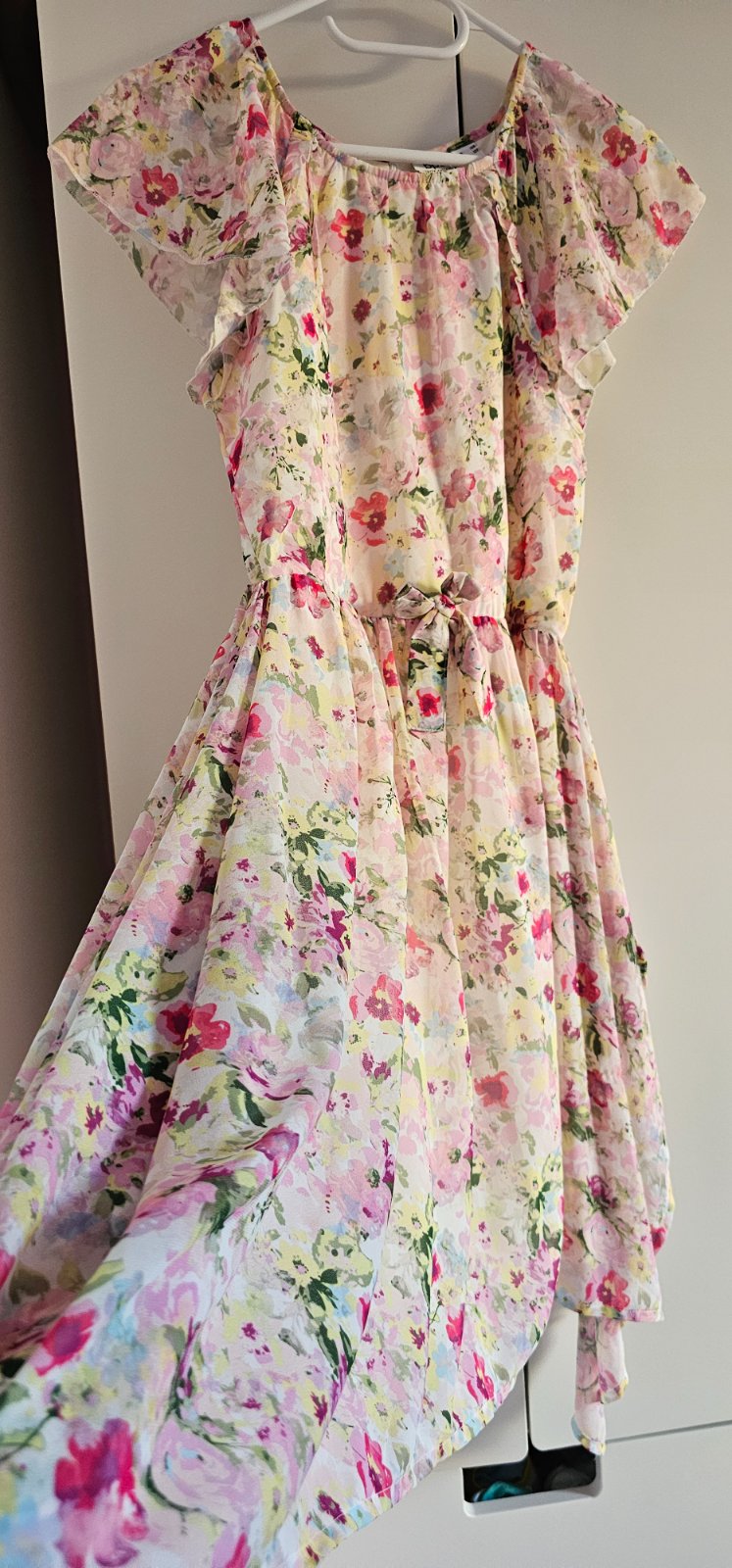 Romantické letné šaty s asymetrickou sukňou. Vrchná látka je priehľadná, ale sú podšité.l, v páse majú gumičku. Je to jemný kvietkovaný vzor, ideálne na letnú rodinnú oslavu, do kostola alebo na začiatok školského roka.
