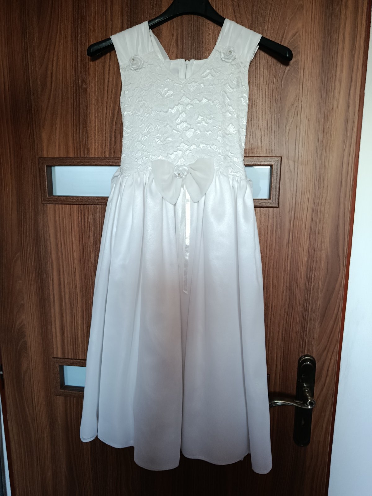 Kvalitné šaty na prvé sväté prijímanie zo svadobného salónu (foto nižšie). Vzadu je zapísanie na zip a mašľu, takže sa dajú pekne prispôsobiť a mašľa pôsobí veľmi pekným dojmom. Majú krátke rukávik...