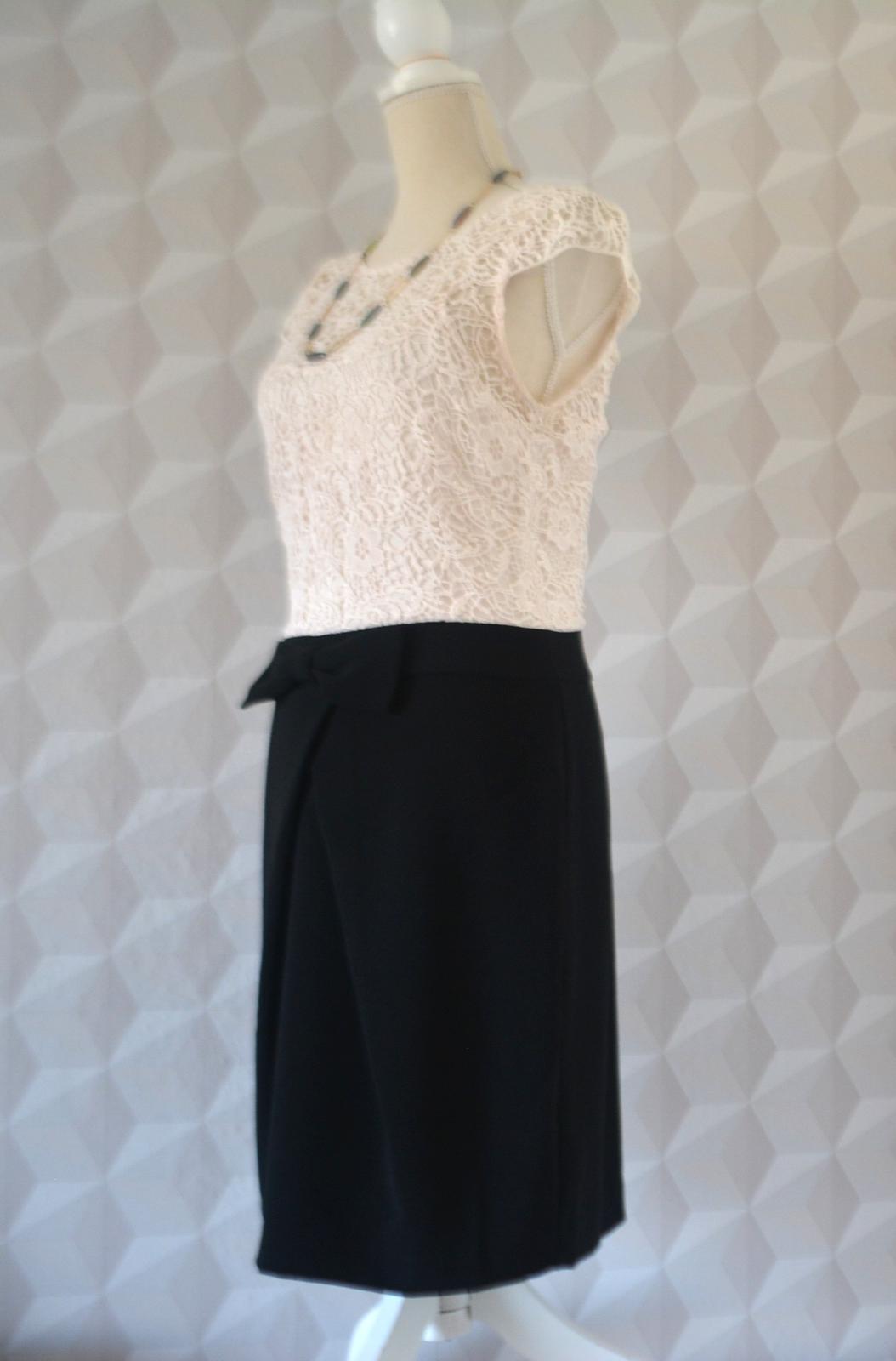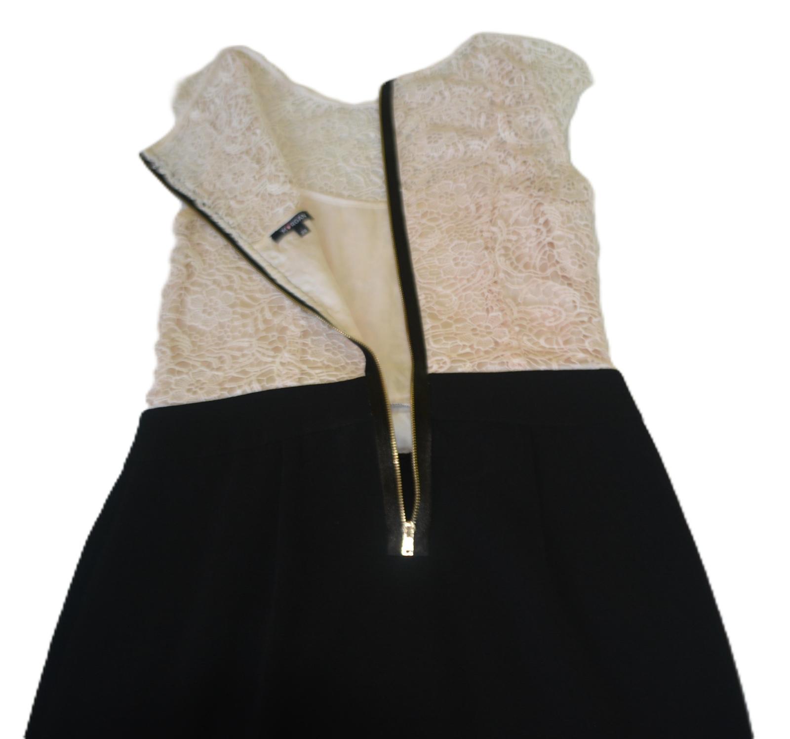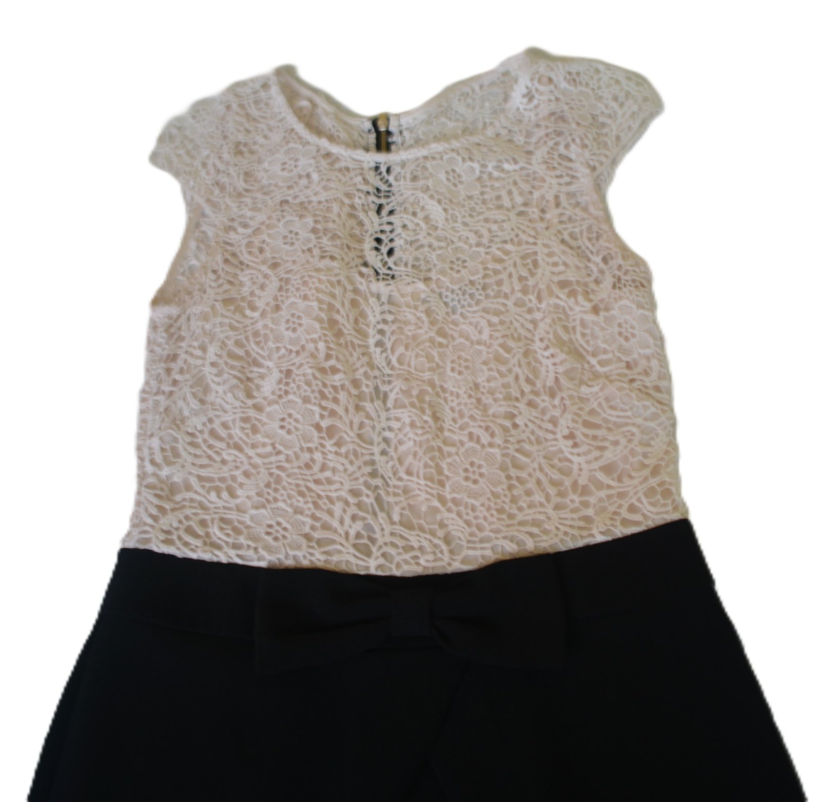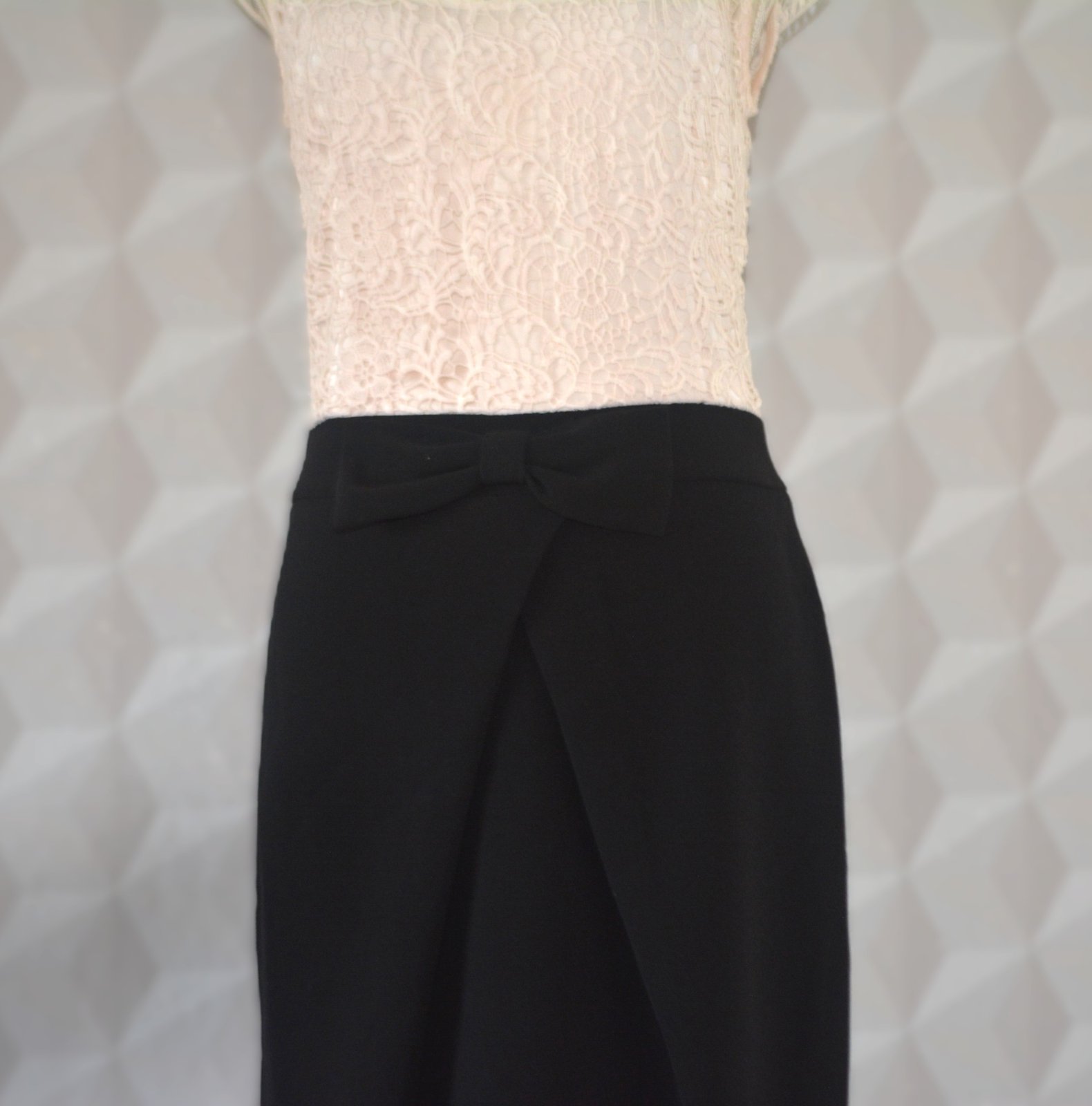 Vrchná časť z hrubšej - akoby paličkovanej čipky, spodná je elastická látka, v páse vpredu mašľa. Zapínanú sa vzadu na dlhý zips.