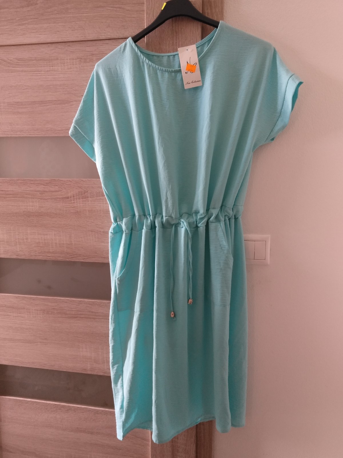 Farba je medzi svetlomodru a zelenou ako na foto. Krásne v top stave. Dĺžka 86 cm. Cez prsia 44x2 ale sú elasticke ja mam 96cm cez prsia a v pohode mi sedia