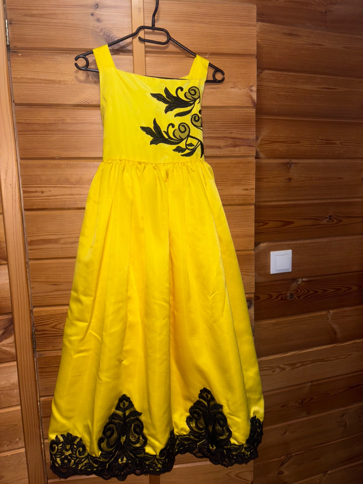 Nádherne šaty, oblečené na oslave, krásna žiarivá žltá