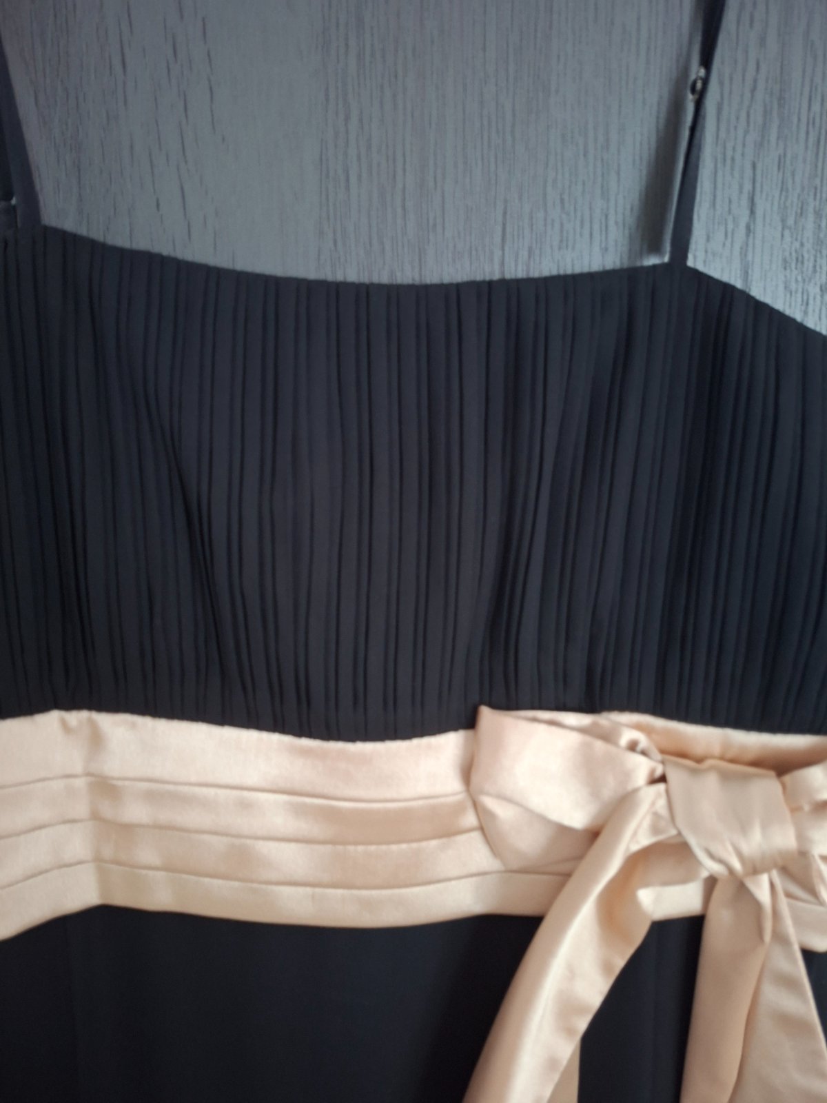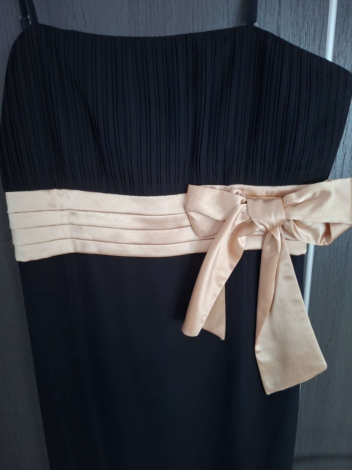 V dobrom stave. Na ramienka, ktore sa dajú posúvať. Zips je vzadu. Vpredu je potrebné vyčistiť na stuhe fliaciky. Sú ale take ze ked sa oblečú tak ich velmo nevidno. Spodná časť stuhy ide ako keby pod prsiami. Veľkosť L