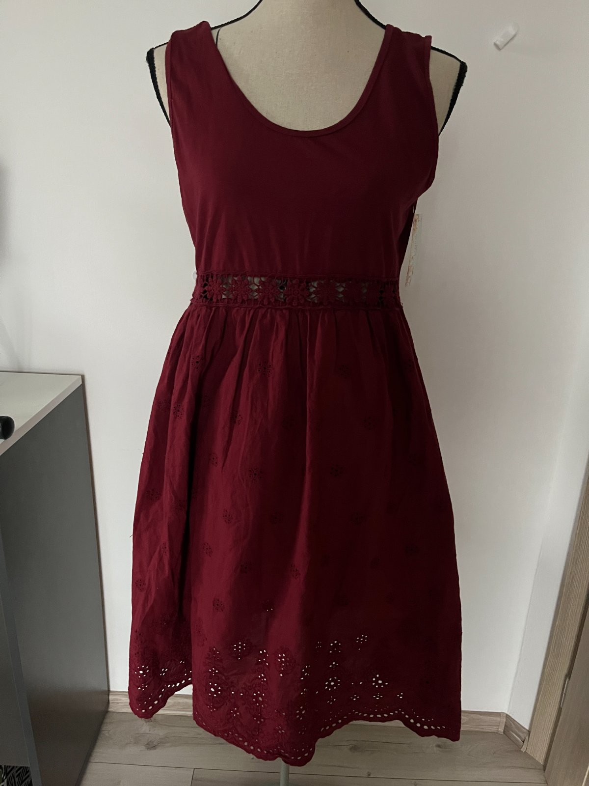 Šaty s dvojdielnym efektom. Suknička má podšívku takže nepresvitá. Suknička je áčkového strihu a sú na nej detaily s kvietkami. Vrchná časť je na ramienka a pod prsiami majú šaty čipkovaný pás. Sú veľmi elastické a vzdušné. Dĺžka je nad kolená, takže sú vhodné na vyššie aj nižšie baby. Sadnú od XS po L.