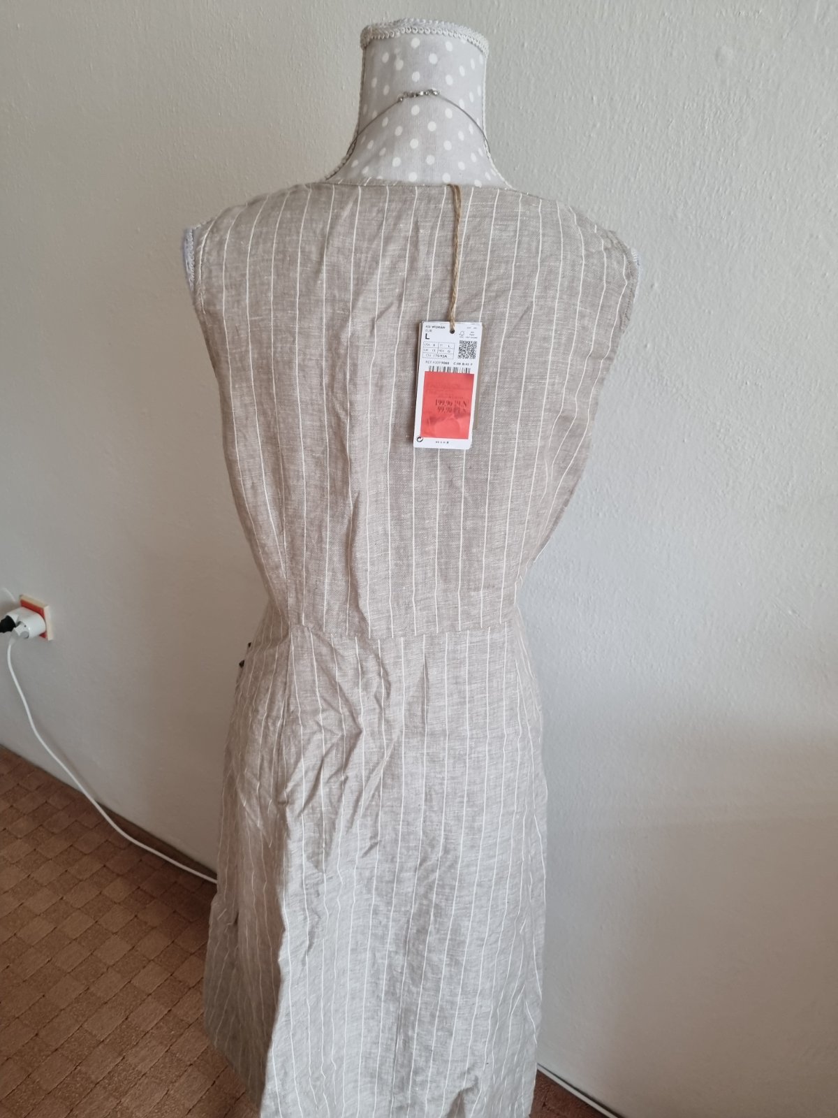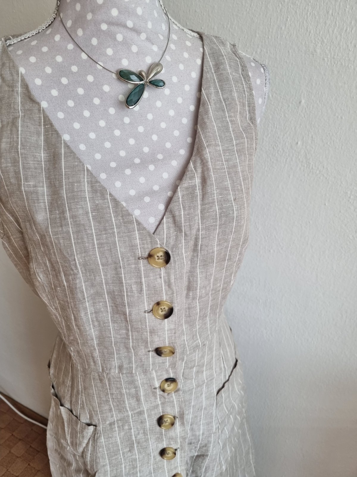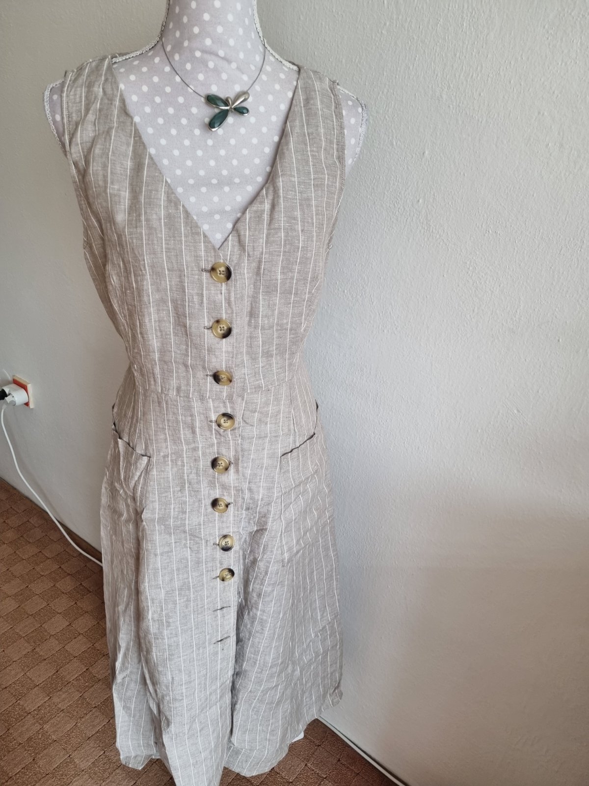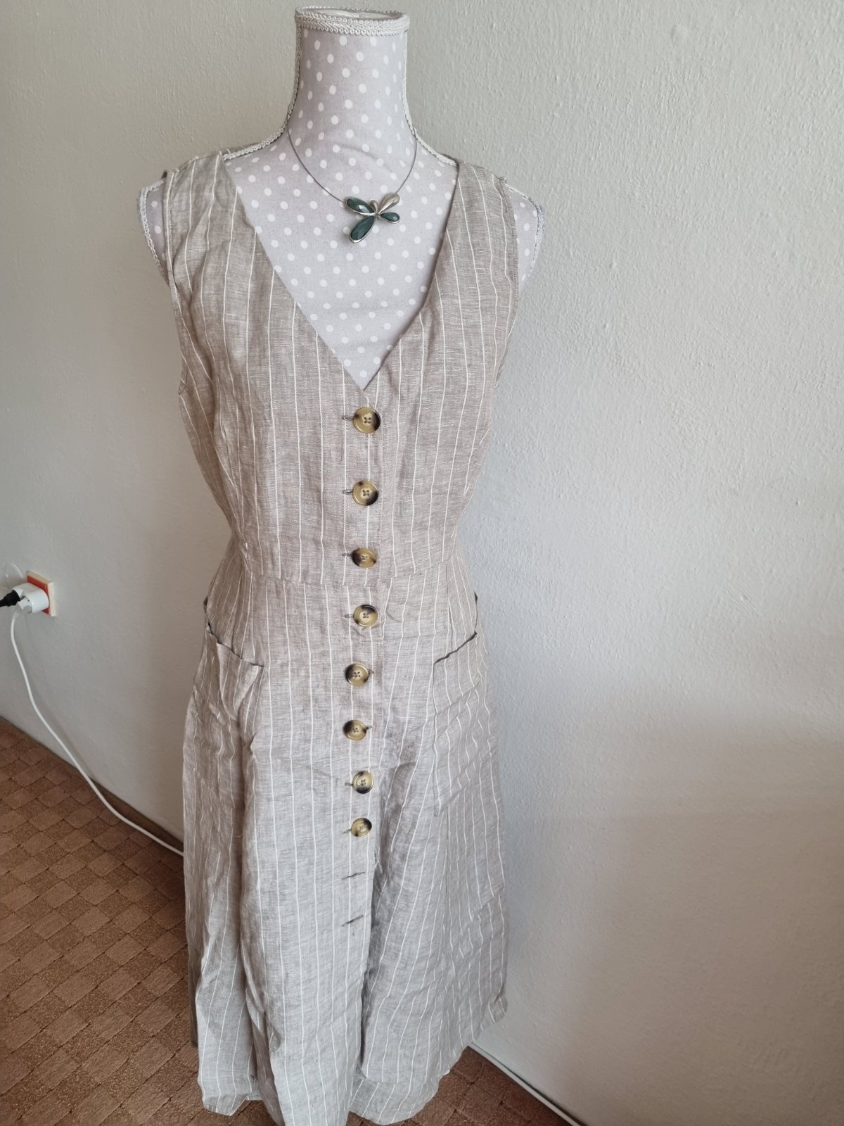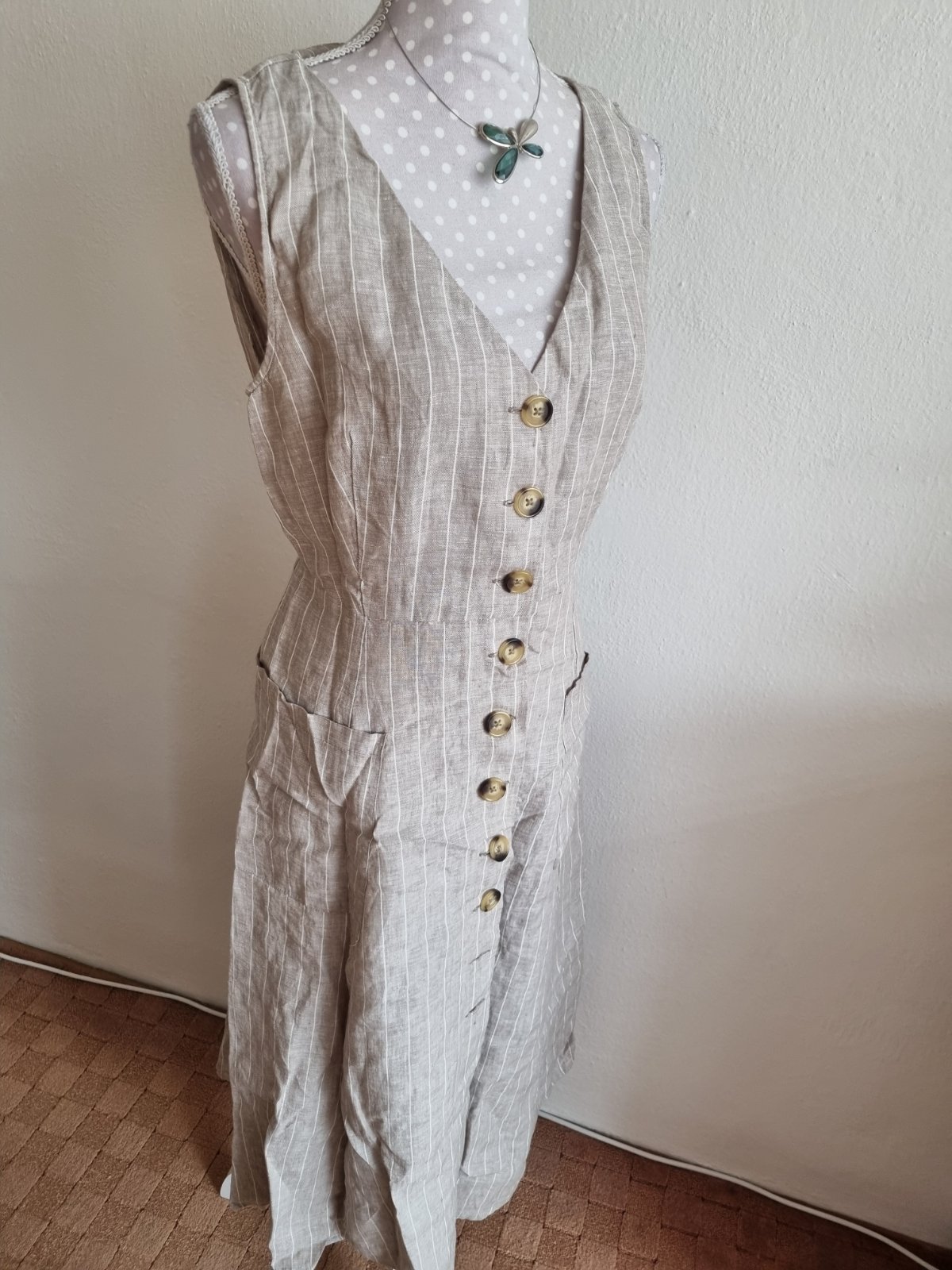 s visačkou, celková dlžka 122 cm, prepínacie, režná farba s krémovými pásikmi, prsia, 51x2 pás 44x2, sukňa rozšírená z dielov, boky. cca 58x2...PC vysoká, predávam za zlomok