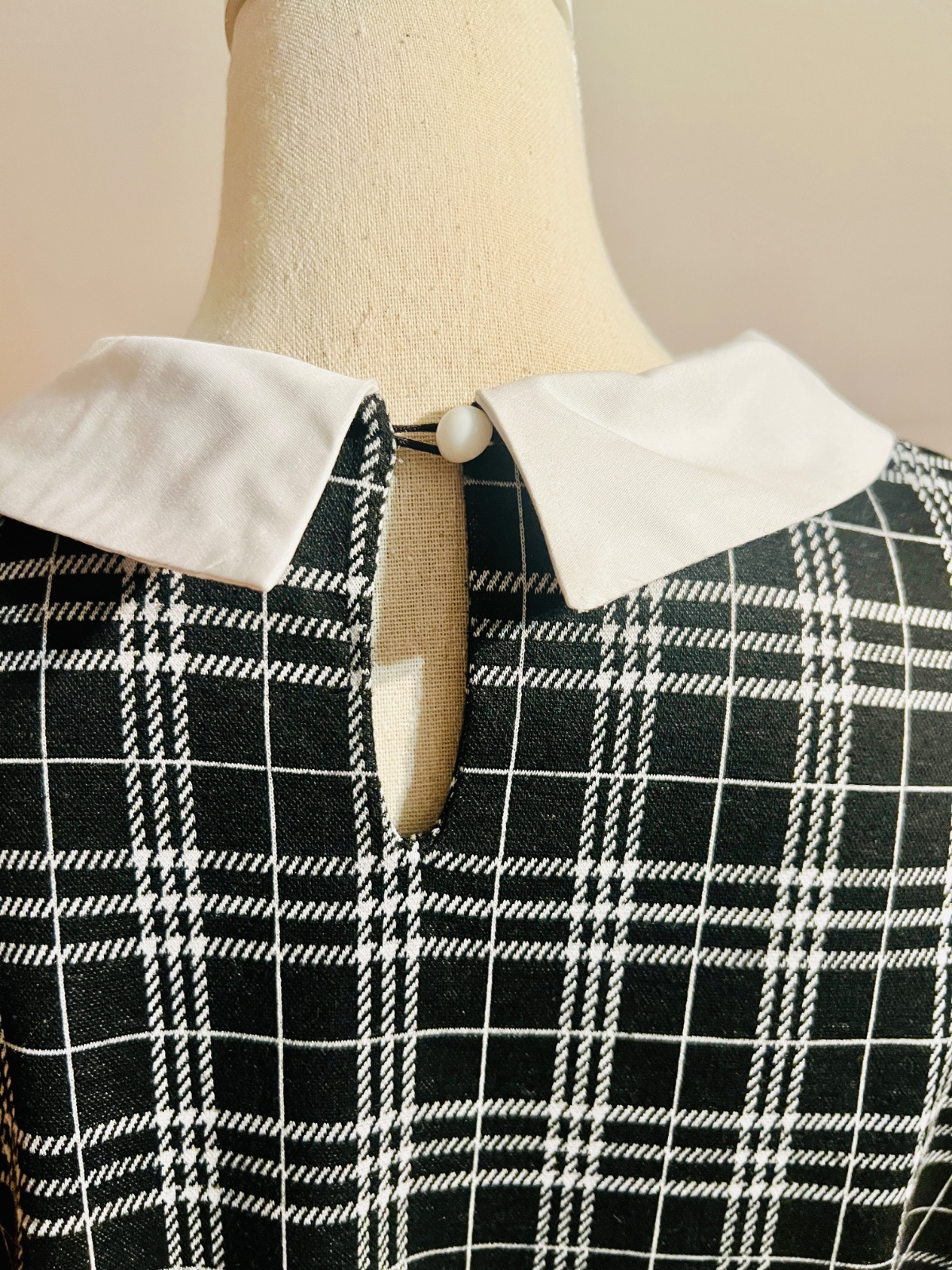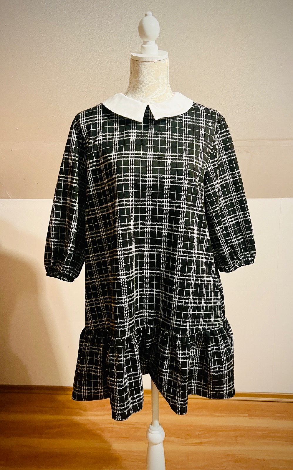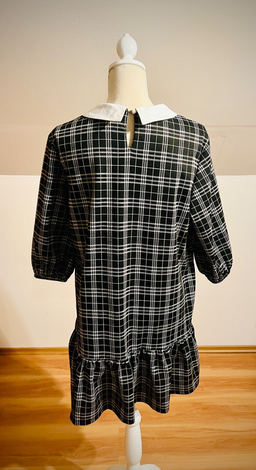 Čierno-biele kárované šaty s volánikom na spodku. Majú pekný biely golier. Vzadu pri krku sa zapínajú na gombík. Širší, pohodlný strih. Značka House. Veľkosť M.