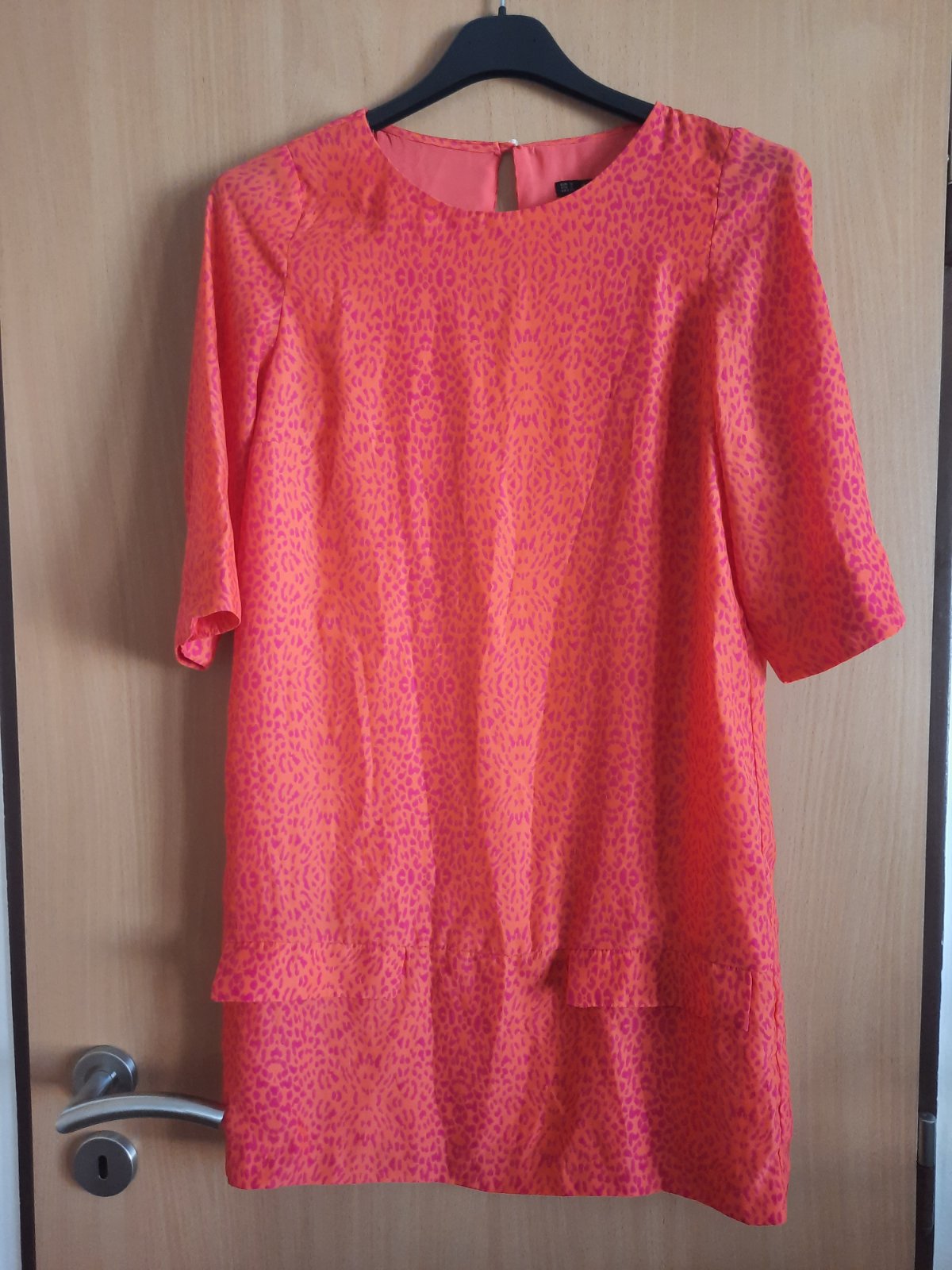 Pekné ľahké podšité šaty rovného strihu s jemným vzorom. Vpredu sú príklopy ako ozdoba na vačok, ale šaty sú bez vačku.